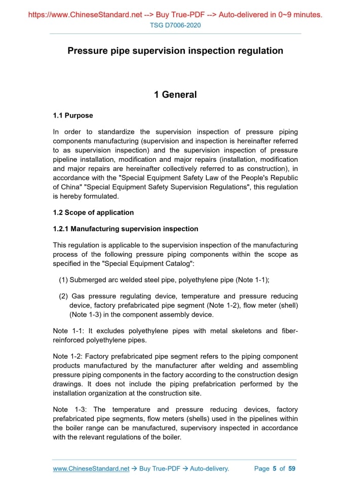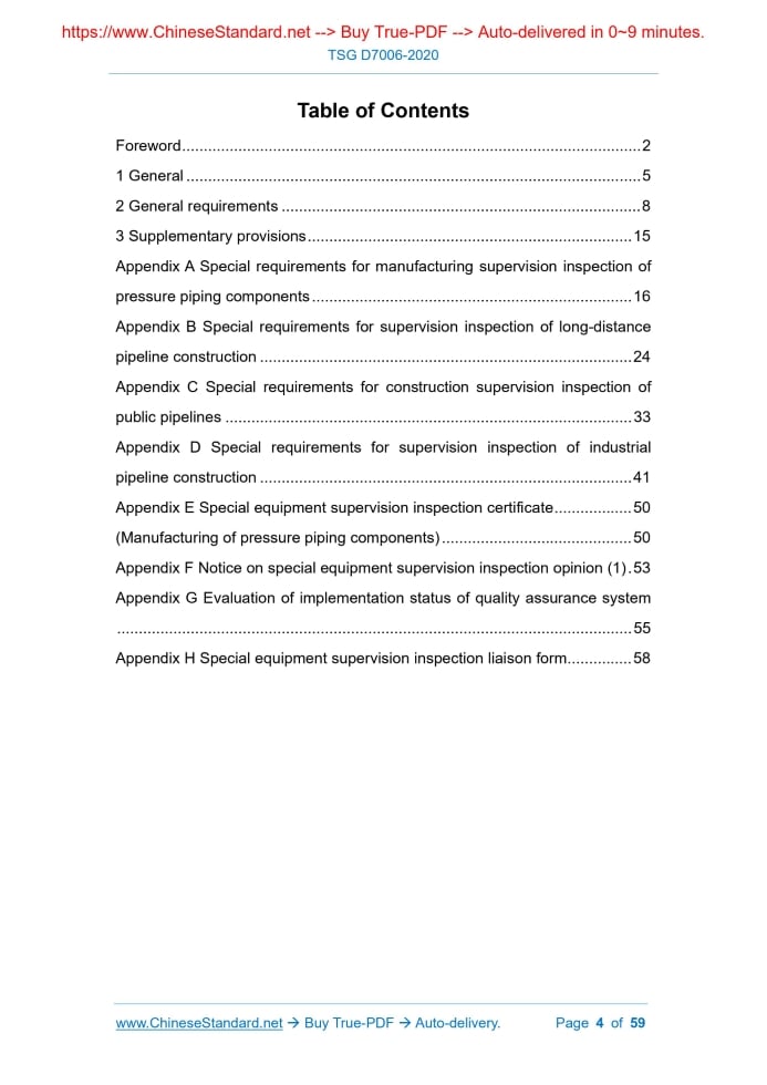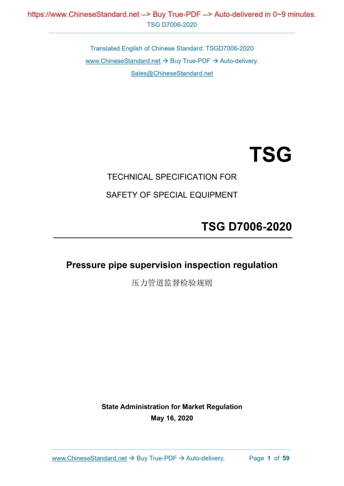 Similar standardsTSG D7006-2020: Pressure pipe supervision inspection regulation---This is an excerpt. Full copy of true-PDF in English version (including equations, symbols, images, flow-chart, tables, and figures etc.), auto-downloaded/delivered in 9 seconds, can be purchased online: https://www.ChineseStandard.net/PDF.aspx/TSGD7006-2020TSG TECHNICAL SPECIFICATION FOR SAFETY OF SPECIAL EQUIPMENT Pressure pipe supervision inspection regulation State Administration for Market Regulation May 16, 2020 ForewordTable of ContentsForeword... 2 1 General... 5 2 General requirements... 8 3 Supplementary provisions... 15 Appendix A Special requirements for manufacturing supervision inspection of pressure piping components... 16 Appendix B Special requirements for supervision inspection of long-distance pipeline construction... 24 Appendix C Special requirements for construction supervision inspection of public pipelines... 33 Appendix D Special requirements for supervision inspection of industrial pipeline construction... 41 Appendix E Special equipment supervision inspection certificate... 50 (Manufacturing of pressure piping components)... 50 Appendix F Notice on special equipment supervision inspection opinion (1). 53 Appendix G Evaluation of implementation status of quality assurance system ... 55 Appendix H Special equipment supervision inspection liaison form... 58 Pressure pipe supervision inspection regulation1 General1.1 Purpose In order to standardize the supervision inspection of pressure piping components manufacturing (supervision and inspection is hereinafter referred to as supervision inspection) and the supervision inspection of pressure pipeline installation, modification and major repairs (installation, modification and major repairs are hereinafter collectively referred to as construction), in accordance with the "Special Equipment Safety Law of the People's Republic of China" "Special Equipment Safety Supervision Regulations", this regulation is hereby formulated. 1.2 Scope of application 1.2.1 Manufacturing supervision inspection This regulation is applicable to the supervision inspection of the manufacturing process of the following pressure piping components within the scope as specified in the "Special Equipment Catalog". (1) Submerged arc welded steel pipe, polyethylene pipe (Note 1-1); (2) Gas pressure regulating device, temperature and pressure reducing device, factory prefabricated pipe segment (Note 1-2), flow meter (shell) (Note 1-3) in the component assembly device. Note 1-1.It excludes polyethylene pipes with metal skeletons and fiber- reinforced polyethylene pipes. Note 1-2.Factory prefabricated pipe segment refers to the piping component products manufactured by the manufacturer after welding and assembling pressure piping components in the factory according to the construction design drawings. It does not include the piping prefabrication performed by the installation organization at the construction site. Note 1-3.The temperature and pressure reducing devices, factory prefabricated pipe segments, flow meters (shells) used in the pipelines within the boiler range can be manufactured, supervisory inspected in accordance with the relevant regulations of the boiler. 1.2.2 Supervision inspection of construction This regulation is applicable to the supervision inspection of the following construction processes of pressure pipelines (long-distance pipelines, public pipelines and industrial pipelines) within the scope specified in the "Special Equipment Catalog". (1) Installation process; (2) Modification or major repairs (except for emergency pipeline construction process) (Note 1-4), the process of replacing the pipeline with the same medium at a time with a total length of more than 100 meters. Note 1-4.Modification of pressure pipeline refers to an activity that changes pipeline specifications, materials, structural layout, or changes in pipeline media, pressure, temperature and other working parameters, resulting in changes in pipeline performance parameters or pipeline structure. Major repairs to pressure pipelines refer to the use of welding methods to replace pipe segments, valves, pipe corrections, welding repairs of pressure parts, pressure sealing, pressure blocking, etc. 1.3 Basic requirements Supervision inspection of pressure piping is that based on the qualified self- inspection of the inspected organization, the inspection agency undertaking the supervision inspection work (hereinafter referred to as the supervision inspection agency) shall perform the supervision of the process of manufacturing of pressure piping components or the construction of pressure piping [hereinafter referred to as manufacturing (construction)], as well as the compliance verification to meet basic safety requirements. The supervision inspection agency and the inspected organization shall sign a supervision inspection contract, to clarify the responsibilities and obligations of both parties. Supervision inspection cannot replace the self-inspection of the inspected organization. Pressure piping components and pressure piping that shall be subject to supervision inspection but not supervisory inspected or failed in the supervision inspection shall not be put into use. 1.4 Inspected organization The inspected organization refers to the organization whose work quality has a direct impact on the safety performance of the pressure pipeline during the manufacturing (construction) process, including the pressure pipeline component manufacturer and the pressure pipeline construction organization (or its entrusted organization, the same below), design organization, construction organization, non-destructive testing organization, etc. The inspected organization shall do the following work. 1.5 Supervision inspection agencies and supervisory inspectors 1.6 Management requirements Pressure piping component manufacturers and construction organizations, design organizations, construction orga