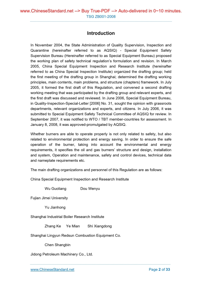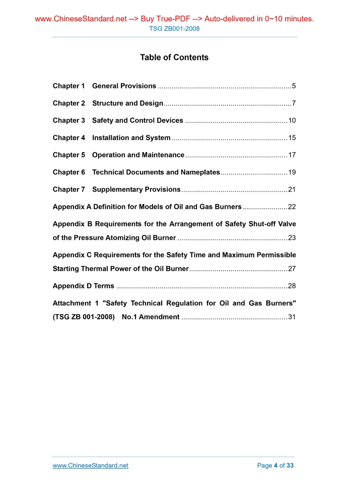 TSG ZB001-2008: Safety Technical Regulation for Oil and Gas Burners---This is an excerpt. Full copy of true-PDF in English version (including equations, symbols, images, flow-chart, tables, and figures etc.), auto-downloaded/delivered in 9 seconds, can be purchased online: https://www.ChineseStandard.net/PDF.aspx/TSGZB001-2008TSG Safety Technical Code of Special Equipment Safety Technical Regulation for Oil and Gas Burners Issued by. General Administration of Quality Supervision, Inspection and Quarantine of the People's Republic of China January 08, 2008 Table of ContentsChapter 1 General Provisions... 5 Chapter 2 Structure and Design... 7 Chapter 3 Safety and Control Devices... 10 Chapter 4 Installation and System... 15 Chapter 5 Operation and Maintenance... 17 Chapter 6 Technical Documents and Nameplates... 19 Chapter 7 Supplementary Provisions... 21 Appendix A Definition for Models of Oil and Gas Burners... 22 Appendix B Requirements for the Arrangement of Safety Shut-off Valve of the Pressure Atomizing Oil Burner... 23 Appendix C Requirements for the Safety Time and Maximum Permissible Starting Thermal Power of the Oil Burner... 27 Appendix D Terms... 28 Attachment 1 "Safety Technical Regulation for Oil and Gas Burners" (TSG ZB 001-2008) No.1 Amendment... 31 Safety Technical Regulation for Oil and Gas Burners Chapter 1 General Provisions Article 1 This Regulation is formulated to ensure the safe operation of oil (gas) burner (hereinafter referred to as "the burner"), avoid and reduce accidents from oil and gas equipment, ensure life safety and reduce property loss. Article 2 This Regulation is applicable to burners for various oil and gas boilers, and burners for other purposes may refer to this Regulation. Article 3 This Regulation specifies the requirements for the burner with regard to its structure and design, safety and control devices, installation and system, operation and maintenance, technical documents and nameplate etc.. The dual fuel burner shall simultaneously meet the requirements for oil burner and gas burner as specified in this Regulation. Chapter 2 Structure and Design Article 7 Burners shall be such designed to meet the following requirements. (1) Performances like the output thermal power of the burner shall be able to reach those specified; (2) Each part’s structure and its dimension shall be such designed to be able to ensure the reliable and economic operation of burners while the safety of operating personnel is ensured, and phenomena endangering the equipment safety, like structural instability, deformation or cracking, shall be avoided; (3) For burners equipped with flame observation aperture, accessories of such observation aperture shall be possessed of adequate strength and be sealed tightly to avoid flaming out or flue gas leaking out; (4) Moving parts (fan and belt gear etc.) of burners must be designed with protective devices to prevent foreign matters in influencing the normal and safe operation of equipment, and the burner fan inlet shall be equipped with reliable protective net enclosures; (5) Air control devices shall be provided, and if the damper regulator is arranged for them, it shall be clearly indicated for its position; (6) For the multi-stage control or continuous control burner, its air and oil (gas) control devices may be linked mechanically, electrically or in other modes. Chapter 3 Safety and Control Devices Article 13 Burners shall be equipped with ignition devices and able to ensure the safe ignition of ignition burner or main burner. Article 14 The burner shall be equipped with flame monitoring device which shall meet the following requirements. Chapter 4 Installation and System Article 33 The burner must be installed by professional personnel in strict accordance with technical documents provided by the manufacturing organization. The external wiring must be constructed in strict accordance with the wiring diagram provided by the manufacturing organization. Article 34 The burner and its parts shall be transported and installed steadily to avoid impact and crash. Each part of the burner shall be installed and fixed to the proper position in correct method, and able to maintain at the original position after being dismantled and re-assembled. Article 35 The oil pump device (including oil pump, filter, motor and pressure control valve) and its fuel oil pipeline shall be provided with the following safety measures. Chapter 5 Operation and Maintenance Article 43 Under the supply of specified fuel, the burner shall be able to operate normally within the operating range provided by the manufacturing organization. Article 44 At the starting of the burner, the continuous ignition times shall not exceed 2, and reasons shall be found out at the failure of ignition and the burner shall be re-started after being adjusted properly. Article 45 The flame stability shall conform to the following requirements. Chapter 6 Technical Documents and Nameplates Article 54 At the delivery of burner products, the following technical documents for production (expressed in Chinese or English and adopting international units) shall at least be accompanied. Chapter 7 Supplementary Provisions Article 57 Implications of terms used in this Regulation are detailed in Appendix D. Article 58 AQSIQ is responsible for the interpretation of this Regulation. Article 59 This Regulation shall be implemented from April 30, 2008.Appendix ADefinition for Models of Oil and Gas Burners A1 Basic definition for models Models of oil and gas burners are for numbering of burners, with different types, structural dimensions and performance parameters, manufactured by the burner manufacturing organization. The burner model will change if any of the followings changes.Appendix BRequirements for the Arrangement of Safety Shut-off Valve of the Pressure Atomizing Oil Burner B1 Arrangement of the safety shut-off valve for single-stage oil burner Figure B-1 is applicable to the oil burner 