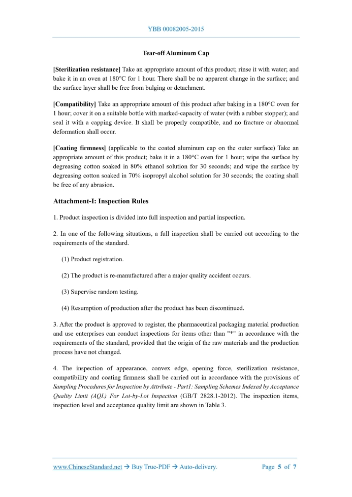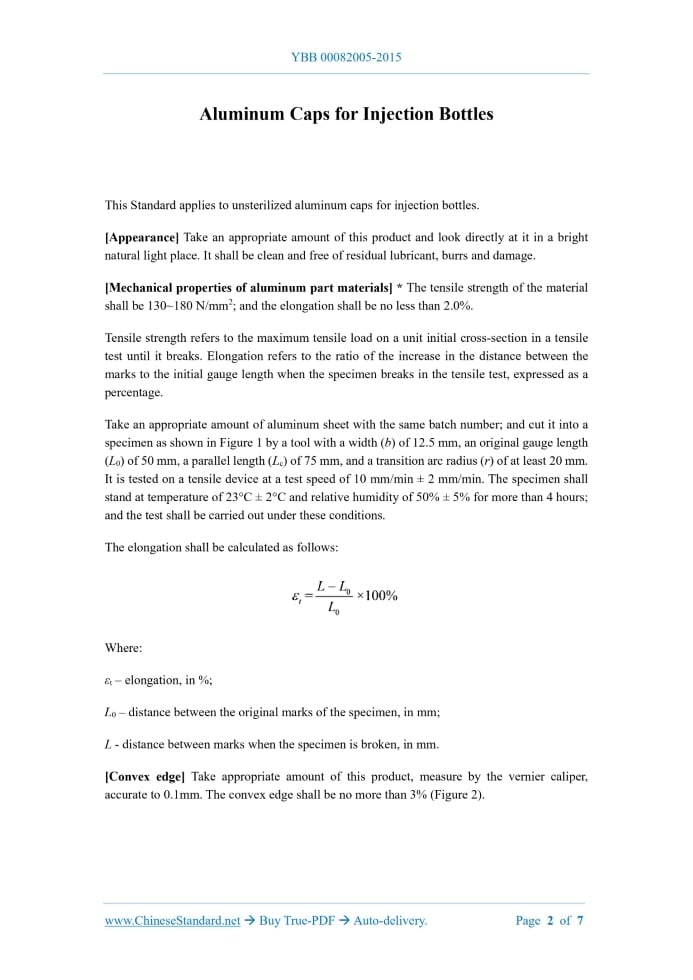 Similar standardsYBB 00082005-2015: Aluminum Caps for Injection Bottles---This is an excerpt. Full copy of true-PDF in English version (including equations, symbols, images, flow-chart, tables, and figures etc.), auto-downloaded/delivered in 9 seconds, can be purchased online: https://www.ChineseStandard.net/PDF.aspx/YBB00082005-2015NATIONAL STANDARD OF THE PEOPLE’S REPUBLIC OF CHINA Aluminum Caps for Injection Bottles Aluminum Caps for Injection Bottles This Standard applies to unsterilized aluminum caps for injection bottles. [Appearance] Take an appropriate amount of this product and look directly at it in a bright natural light place. It shall be clean and free of residual lubricant, burrs and damage. [Mechanical properties of aluminum part materials] * The tensile strength of the material shall be 130~180 N/mm2; and the elongation shall be no less than 2.0%. Tensile strength refers to the maximum tensile load on a unit initial cross-section in a tensile test until it breaks. Elongation refers to the ratio of the increase in the distance between the marks to the initial gauge length when the specimen breaks in the tensile test, expressed as a percentage. Take an appropriate amount of aluminum sheet with the same batch number; and cut it into a specimen as shown in Figure 1 by a tool with a width (b) of 12.5 mm, an original gauge length (L0) of 50 mm, a parallel length (Lc) of 75 mm, and a transition arc radius (r) of at least 20 mm. It is tested on a tensile device at a test speed of 10 mm/min ± 2 mm/min. The specimen shall stand at temperature of 23°C ± 2°C and relative humidity of 50% ± 5% for more than 4 hours; and the test shall be carried out under these conditions. The elongation shall be calculated as follows. Where. εt – elongation, in %; L0 – distance between the original marks of the specimen, in mm; L - distance between marks when the specimen is broken, in mm. [Convex edge] Take appropriate amount of this product, measure by the vernier caliper, accurate to 0.1mm. The convex edge shall be no more than 3% (Figure 2). Tear-off Aluminum Cap [Sterilization resistance] Take an appropriate amount of this product; rinse it with water; and bake it in an oven at 180°C for 1 hour. There shall be no apparent change in the surface; and the surface layer shall be free from bulging or detachment. [Compatibility] Take an appropriate amount of this product after baking in a 180°C oven for 1 hour; cover it on a suitable bottle with marked-capacity of water (with a rubber stopper); and seal it with a capping device. It shall be properly compatible, and no fracture or abnormal deformation shall occur. [Coating firmness] (applicable to the coated aluminum cap on the outer surface) Take an appropriate amount of this product; bake it in a 180°C oven for 1 hour; wipe the surface by degreasing cotton soaked in 80% ethanol solution for 30 seconds; and wipe the surface by degreasing cotton soaked in 70% isopropyl alcohol solution for 30 seconds; the coating shall be free of any abrasion. Attachment-I. Inspection Rules 1.Product inspection is divided into full inspection and partial inspection. 2.In one of the following situations, a full inspection shall be carried out according to the requirements of the standard. (1) Product registration. (2) The product is re-manufactured after a major quality accident occurs. (3) Supervise random testing. (4) Resumption of production after the product has been discontinued. 3.After the product is approved to register, the pharmaceutical packaging material production and use enterprises can conduct inspections for items other than "*" in accordance with the requirements of the standard, provided that the origin of the raw materials and the production process have not changed. 4.The inspection of appearance, convex edge, opening force, sterilization resistance, compatibility and coating firmness shall be carried out in accordance with the provisions of Sampling Procedures for Inspection by Attribute - Part1.Sampling Schemes Indexed by Acceptance Quality Limit (AQL) For Lot-by-Lot Inspection (GB/T 2828.1-2012). The inspection items, inspection level and acceptance quality limit are shown in Table 3. ...... Source: Above contents are excerpted from the full-copy PDF -- translated/reviewed by: www.ChineseStandard.net / Wayne Zheng et al. Tips & Frequently Asked Questions:Question 1: How long will the true-PDF of English version of YBB 00082005-2015 be delivered?Answer: The full copy PDF of English version of YBB 00082005-2015 can be downloaded in 9 seconds, and it will also be emailed to you in 9 seconds (double mechanisms to ensure the delivery reliably), with PDF-invoice.Question 2: Can I share the purchased PDF of YBB 00082005-2015_English with my colleagues?Answer: Yes. The purchased PDF of YBB 00082005-2015_English will be deemed to be sold to your employer/organization who actually paid for it, including your colleagues and your employer's intranet.Question 3: Does the price include tax/VAT?Answer: Yes. Our tax invoice, downloaded/delivered in 9 seconds, includes all tax/VAT and complies with 100+ countries' tax regulations (tax exempted in 100+ countries) -- See Avoidance of Double Taxation Agreements (DTAs): List of DTAs signed between Singapore and 100+ countriesQuestion 4: Do you accept my currency other than USD?Answer: Yes. www.ChineseStandard.us -- YBB 00082005-2015 -- Click this link and select your country/currency to pay, the exact amount in your currency will be printed on the invoice. Full PDF will also be downloaded/emailed in 9 seconds.How to buy and download a true PDF of English version of YBB 00082005-2015?A step-by-step guide to download PDF of YBB 00082005-2015_EnglishStep 1: Visit website https://www.ChineseStandard.net (Pay in USD), or https://www.ChineseStandard.us (Pay in any currencies such as Euro, KRW, JPY, AUD).Step 2: Search keyword "YBB 00082005-2015". Step 3: Click "Add to Cart". If multiple PDFs are required, repe