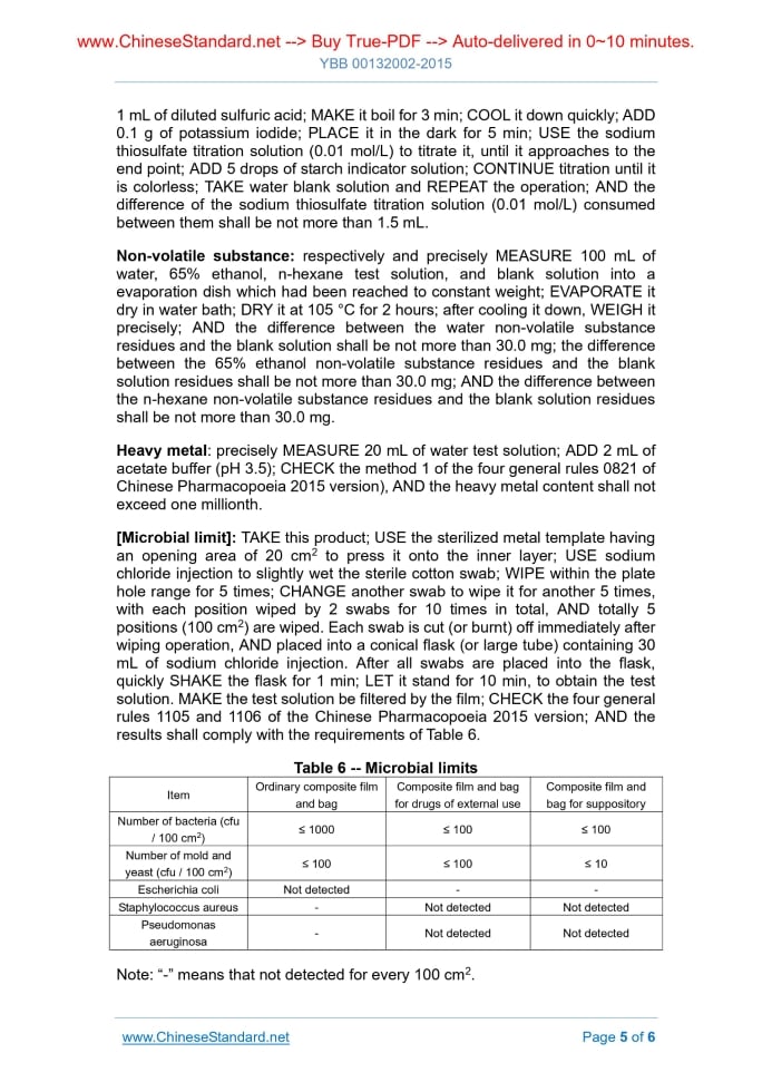 Similar standardsYBB 00132002-2015: General requirement for laminated films and products for pharmaceutical packaging---This is an excerpt. Full copy of true-PDF in English version (including equations, symbols, images, flow-chart, tables, and figures etc.), auto-downloaded/delivered in 9 seconds, can be purchased online: https://www.ChineseStandard.net/PDF.aspx/YBB00132002-2015 YY / YBB PETROCHEMICAL INDUSTRY STANDARD General requirement for laminated films and products for pharmaceutical packaging Issued on: AUGUST 11, 2015 Implemented on: DECEMBER 01, 2015 Issued by. China Food and Drug Administration of PRC General requirement for laminated films and products for pharmaceutical packaging Composite film refers to the film formed by a variety of plastic and paper, metal or other plastic through adhesives, with the thickness of generally not greater than 0.25mm. Composite bag refers to the bag made by heat sealing method of the composite film, which can be divided into three-sided sealed bag, middle sealed bag, organ bag, self-reliance bag, zipper bag, and so on. This standard applies to the pharmaceutical composite film and bag for other uses than injection. Pharmaceutical composite film is classified in accordance with the material combinations, as shown in Table 1. Table 1 -- Composite film classification Type Material Typical example I Paper, plastic Paper or PT / adhesive layer / PE or EVA, CPP II Plastic BOPET or BOPP, BOPA / adhesive layer / PE or EVA, CPP III Plastic, aluminized film BOPET or BOPP / adhesive / aluminized CPP BOPET or BOPP / adhesive layer / aluminized BOPET / adhesive layer / PE or EVA, CPP, EMA, EAA, ionic polymer IV Paper, aluminium film, plastic Paper or PT / adhesive layer / aluminium foil / adhesive layer / PE or EVA, CPP, EMA, EAA, ionic polymer Coating / aluminium foil / adhesive layer / PE or CPP, EVA, EMA, EAA, ionic polymer V Plastic (non-single layer), aluminium film BOPET or BOPP, BOPA / adhesive layer / aluminium foil / adhesive layer / PE or CPP, EVA, EMA, EAA, ionic polymer Note 1.The glass paper is shortly referred to as PT, the biaxially-oriented polypropylene is shortly referred to as BOPP, the biaxially-oriented polypropylene terephthalate is shortly referred to as BOPET, the biaxially-oriented polyamide nylon is shortly referred to as BOPA, The polyethylene is shortly referred to as PE, the casting polypropylene is shortly referred to as CPP, the copolymer of ethylene and ethylene vinyl acetate is shortly referred to as EVA, the copolymer of ethylene and acrylic acid is shortly referred to as EAA, AND the copolymer of ethylene and methacrylic acid is shortly referred to as EMA. Note 2.The composite may be of dry composite method or solvent-free composite method, AND at this time the adhesive layer is general adhesive. It may also use extrusion composite method, AND at this time the adhesive layer is PE or EVA, EMA, EAA, and other resins. 1 mL of diluted sulfuric acid; MAKE it boil for 3 min; COOL it down quickly; ADD 0.1 g of potassium iodide; PLACE it in the dark for 5 min; USE the sodium thiosulfate titration solution (0.01 mol/L) to titrate it, until it approaches to the end point; ADD 5 drops of starch indicator solution; CONTINUE titration until it is colorless; TAKE water blank solution and REPEAT the operation; AND the difference of the sodium thiosulfate titration solution (0.01 mol/L) consumed between them shall be not more than 1.5 mL. Non-volatile substance. respectively and precisely MEASURE 100 mL of water, 65% ethanol, n-hexane test solution, and blank solution into a evaporation dish which had been reached to constant weight; EVAPORATE it dry in water bath; DRY it at 105 °C for 2 hours; after cooling it down, WEIGH it precisely; AND the difference between the water non-volatile substance residues and the blank solution shall be not more than 30.0 mg; the difference between the 65% ethanol non-volatile substance residues and the blank solution residues shall be not more than 30.0 mg; AND the difference between the n-hexane non-volatile substance residues and the blank solution residues shall be not more than 30.0 mg. Heavy metal. precisely MEASURE 20 mL of water test solution; ADD 2 mL of acetate buffer (pH 3.5); CHECK the method 1 of the four general rules 0821 of Chinese Pharmacopoeia 2015 version), AND the heavy metal content shall not exceed one millionth. [Microbial limit]. TAKE this product; USE the sterilized metal template having an opening area of 20 cm2 to press it onto the inner layer; USE sodium chloride injection to slightly wet the sterile cotton swab; WIPE within the plate hole range for 5 times; CHANGE another swab to wipe it for another 5 times, with each position wiped by 2 swabs for 10 times in total, AND totally 5 positions (100 cm2) are wiped. Each swab is cut (or burnt) off immediately after wiping operation, AND placed into a conical flask (or large tube) containing 30 mL of sodium chloride injection. After all swabs are placed into the flask, quickly SHAKE the flask for 1 min; LET it stand for 10 min, to obtain the test solution. MAKE the test solution be filtered by the film; CHECK the four general rules 1105 and 1106 of the Chinese Pharmacopoeia 2015 version; AND the results shall comply with the requirements of Table 6. Table 6 -- Microbial limits Item Ordinary composite film and bag Composite film and bag for drugs of external use Composite film and bag for suppository Number of bacteria (cfu / 100 cm2) ≤ 1000 ≤ 100 ≤ 100 Number of mold and yeast (cfu / 100 cm2) ≤ 100 ≤ 100 ≤ 10 Escherichia coli Not detected - - Staphylococcus aureus - Not detected Not detected Pseudomonas aeruginosa - Not detected Not detected Note. “-” means that not detected for every 100 cm2. ...... Source: Above contents are excerpted from the full-copy PDF -- translated/reviewed by: www.ChineseStandard.net / Wayne Zheng et al. Tips & Frequently Asked Questions:Question 1: How long will the true-PDF of English ve
