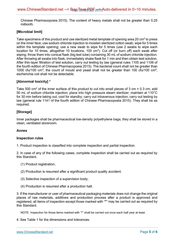Similar standardsYBB 00152002-2015: Aluminium Foils for Medicine---This is an excerpt. Full copy of true-PDF in English version (including equations, symbols, images, flow-chart, tables, and figures etc.), auto-downloaded/delivered in 9 seconds, can be purchased online: https://www.ChineseStandard.net/PDF.aspx/YBB00152002-2015YY / YBB PETROCHEMICAL INDUSTRY STANDARD Aluminium Foils for Medicine Issued on: AUGUST 11, 2015 Implemented on: DECEMBER 01, 2015 Issued by. China Food and Drug Administration of PRC Aluminium Foils for Medicine This Standard applies to aluminium foils for solid medicine (including tablets and capsules), which are adhered to the rigid sheets made of polyvinyl chloride (PVC), polyvinylidene chloride (PVDC) or other materials. The coating of this product consists of a protective layer and an adhesive layer. [Appearance] Take an appropriate amount of this product (2 m each roll); use front view to carry out visual inspection under sufficient natural light. The surface shall be clean, smooth and uniform in coating; the print of words and patterns shall be correct, clear and fast. [Pinhole degree] Take 10 test specimens of 400 mm in length and 250 mm in width (when the width is less than 250 mm, take the width of roll); place one by one on pinhole inspection table (of 800 mm × 600 mm × 300 mm or wooden case of an appropriate volume. A fluorescent lamp of 30 W is installed inside of wooden case; one glass pane is placed on wooden case; glass pane is lined with black paper and reserved with space of 400 mm × 250 mm for the inspection of the pinholes of specimens); inspect their pinholes in the dark. Pinholes shall not be dense, continuous or periodical. within each square meter, pinholes of diameter greater than 0.3 mm are not allowed; the number of pinholes of diameter 0.1 ~ 0.3 mm shall not be greater than 1. [Barrier performance] Water vapor transmission is determined in accordance with test condition B of the first method, or test condition B of the second method, or test condition 2 of the fourth method as specified in the method for the determination of water vapor transmission (YBB00092003- 2015). During test, apply heat seal on the side of lower humidity, not exceeding 0.5 g/(m2·24 h). [Welding strength of adhesive layer] Take 2 pieces of this product of 100 mm × 100 mm; take 2 pieces of PVC rigid sheet for solid medicine (as required by YBB00212005-2015) or 2 pieces of PVC/PVDC composite rigid sheet for solid medicine (as required by YBB00222005-2015). Make the adhesive layer of test specimens face the PVC side (or the PVDC side PVC/PVDC composite rigid sheet) for lamination; place on heat seal tester. The conditions for welding include. temperature 155°C ± 5°C; pressure 0.2 MPa; duration 1 s. Take out and allow to cool after welding; cut into test specimens of 15 mm in width; take 2 test specimens in the middle; carry out determination in accordance with the method for the determination of welding strength (YBB00122003- 2015) (test speed 200 mm/min ± 20 mm/min); fix PVC (PVDC) specimens to the upper clamp of tester and aluminium foils to the lower clamp of tester; start tensile tester for peeling in the direction of 180°. The mean value of welding strength shall not be lower than 7.0 N/15 mm (for PVC) or 6.0 N/ 15 mm (for PVDC). [Adhesion of protective layer] Chinese Pharmacopoeia 2015). The content of heavy metals shall not be greater than 0.25 millionth. [Microbial limit] Take specimens of this product and use sterilized metal template of opening area 20 cm2 to press on the inner face; use sodium chloride injection to moisten sterilized cotton swab; wipe for 5 times within the template opening; use a new swab to wipe for 5 times (use 2 swabs to wipe each location for 10 times, altogether 10 locations, 100 cm2). Cut off (or burn off) each swab after wiping; throw them into conical flask (big test tube) containing 30 mL of sodium chloride injection. After throwing all swabs into flask, immediately shake flask for 1 min and then obtain test solution. After thin-layer filtration of test solution, carry out testing by law (general rules 1105 and 1106 of the fourth edition of Chinese Pharmacopoeia 2015). The bacterial count shall not be greater than 1000 cfu/100 cm2; the count of mould and yeast shall not be greater than 100 cfu/100 cm2; escherichia coli shall not be detectable. [Abnormal toxicity] * Take 500 cm2 of the inner surface of this product to cut into small pieces of 3 cm × 0.3 cm; add 50 mL of sodium chloride injection; place into high pressure steam sterilizer; maintain at 110°C for 30 min before taking out; cool for standby; carry out intravenous injection; carry out testing by law (general rule 1141 of the fourth edition of Chinese Pharmacopoeia 2015). They shall be as required. [Storage] Inner packages shall be pharmaceutical low-density polyethylene bags; they shall be stored in a clean, ventilated storeroom. Annex Inspection rules 1.Product inspection is classified into complete inspection and partial inspection. 2.In case of any of the following cases, complete inspection shall be carried out as required by this Standard. (1) Product registration; (2) Production is resumed after a significant product quality accident. (3) Selective inspection of a supervision body; (4) Production is resumed after a production halt. 3.If the manufacturer or user of pharmaceutical packaging materials does not change the original places of raw materials, additives and production process after a product is approved and registered, all items of inspection except those marked with “*” may be carried out as required by this Standard. NOTE Inspection for those items marked with “*” shall be carried out once each half year at least. 4.See Table 1 for the dimensions and tolerances. ...... Source: Above contents are excerpted from the full-copy PDF -- translated/reviewed by: www.ChineseStandard.net / Wayne Zheng et al. Tips & Frequently Asked Questions:Que