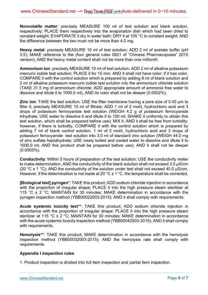 Similar standardsYBB 00162004-2015: Bromobutyl rubber plungers and liners for pen-injectors---This is an excerpt. Full copy of true-PDF in English version (including equations, symbols, images, flow-chart, tables, and figures etc.), auto-downloaded/delivered in 9 seconds, can be purchased online: https://www.ChineseStandard.net/PDF.aspx/YBB00162004-2015YY / YBB National Drug Packing Container (Material) Standard Bromobutyl rubber plungers and liners for pen-injectors Issued on: AUGUST 11, 2015 Implemented on: DECEMBER 01, 2015 Issued by. China Food and Drug Administration of PRC 3.No action is required - Full-copy of this standard will be automatically & immediately delivered to your EMAIL address in 0~60 minutes. Bromobutyl rubber plungers and liners for pen-injectors This standard applies to bromobutyl rubber plungers and liners for pen-injectors sleeves. [Appearance] TAKE several products; MAKE visual inspection from frontside in the bright natural light. The surface color shall be uniform; it shall be free from stains, impurities, bubbles, cracks, lack of plastic, roughness, rubber thread, rubber fragment, sponge-like, or burr; it shall be free from incompleteness or jagging due to trimming operation; AND it shall be free from obvious mark due to die. [Identification] * (1) TAKE appropriate amount of this product; CUT it into small particles; WEIGH 2.0 g; PLACE it into crucible; ADD 2.0 g of sodium bicarbonate to uniformly cover the sample; PLACE it on the electric furnace; slowly HEAT it until it is carbonized; LET it cool naturally; PLACE it in the high temperature furnace at 300 °C to heat it until it is totally ashed; TAKE it out; LET it cool naturally; ADD 10 mL of water to dissolve it; FILTER it; TAKE 1.5 mL of filtrate; PLACE it into the test tube; ADD nitric acid to acidize it; ADD 1 drop of silver nitrate test solution; AND it shall produce yellow precipitate. (2) TAKE appropriate amount of this product; MAKE determination in accordance with the method 4 of the packaging material infrared spectroscopy (YBB00262004-2015), AND the results shall be consistent with the control map. [Puncture chip] (Liner) liner pretreatment. TAKE a few liners; ADD water (ml) the volume of which is twice the total surface area (cm2) of the liner; MAKE it boil for 5 min; USE water to flush it for 5 times; PLACE the liner into the conical flask; ADD water the volume of which is twice the total surface area (cm2) of the liner to cover the liner; USE aluminum foil or silicon borate beaker to cover the conical flask mouth; PLACE it into the high pressure steam sterilizer for heating; INCREASE the temperature to 121 °C ± 2 °C; MAINTAIN this temperature for 30 minutes; COOL it to room temperature; TAKE it out; BAKE it at 60 °C for 60 minutes; STORE it in a sealed glass vessel to prepare for use. FILL water into the 50 pen-injector sleeves fitted with a plunger to half of its volume; USE the liner under test and aluminum cap (with hole at middle) to seal it; USE 50 pen-injector sleeves equipped with the liner having known number of puncture chip numbers to repeat this procedure. Alternatively PUNCTURE the rubber liner in the sequence of the liner under test AND then the liner having known number of puncture chip. During puncturing, PLACE the pen-injector sleeve perpendicularly on a stable base; MAKE the liner end upwards; FILL water into the injector sleeve and REMOVE the water from the injection needle (outer diameter 0.4 mm subcutaneous injection needle, as shown in Figure 1 and Table 1); HOLD the injector sleeve vertically to puncture the liner; INJECT 1 ml of water into the flask; before each puncturing, USE acetone or methyl-isobutyl ketone to wipe the injection needle; REPLACE the injection needle after 20 times of puncturing, until all the liners are punctured for one time; TAKE off the liner under test; USE fast filter paper to filter all the water in the flask; ENSURE that there is no chip remaining in the flask; under normal conditions, KEEP the distance from the eyes and the filter paper at 25 cm; USE naked eyes to fast observe the number of chips on the fast filter paper; MAKE record; MAKE same operation for the liners Nonvolatile matter. precisely MEASURE 100 ml of test solution and blank solution, respectively; PLACE them respectively into the evaporation dish which had been dried to constant weight; EVAPORATE it dry in water bath; DRY it at 105 °C to constant weight; AND the difference between the two must not be more than 4.0 mg. Heavy metal. precisely MEASURE 10 ml of test solution; ADD 2 ml of acetate buffer (pH 3.5); MAKE reference to the (four general rules 0821 of “Chinese Pharmacopoeia” 2015 version); AND the heavy metal content shall not be more than one millionth. Ammonium ion. precisely MEASURE 10 ml of test solution; ADD 2 ml of alkaline potassium mercuric iodide test solution; PLACE it for 15 min; AND it shall not have color; if it has color, COMPARE it with the control solution which is prepared by adding 8 ml of blank solution and 2 ml of alkaline potassium mercuric iodide test solution into the ammonium chloride solution(TAKE 31.5 mg of ammonium chloride; ADD appropriate amount of ammonia free water to dissolve and dilute it to 1000.0 ml), AND its color shall not be deeper (0.0002%). Zinc ion. TAKE the test solution; USE the filter membrane having a pore size of 0.45 μm to filter it; precisely MEASURE 10 ml of filtrate; ADD 1 ml of 2 mol/L hydrochloric acid and 3 drops of potassium ferrocyanide test solution (WEIGH 4.2 g of potassium ferrocyanide trihydrate; USE water to dissolve it and dilute it to 100 ml; SHAKE it uniformly to obtain this test solution, which shall be prepared before use); MIX it; AND it shall be free from turbidity; however, if there is turbidity, COMPARE it with the control solution which is prepared by adding 7 ml of blank control solution, 1 ml of 2 mol/L hydrochloric acid and 3 drops of potassium ferrocyanide test solution into 3.0 ml of st