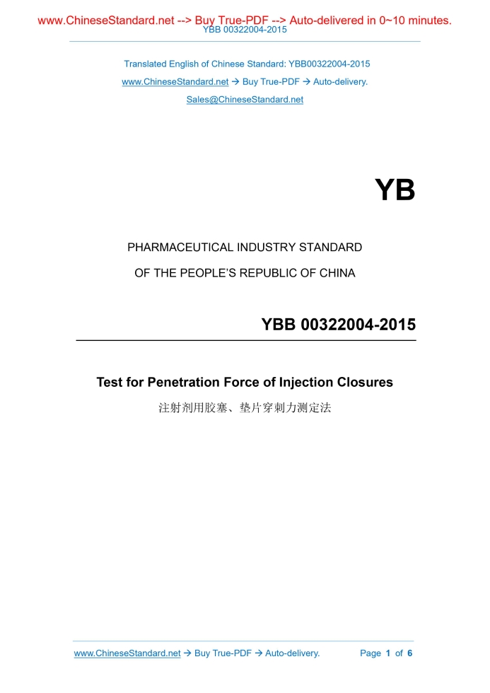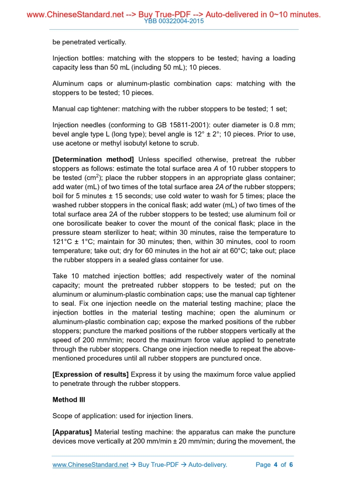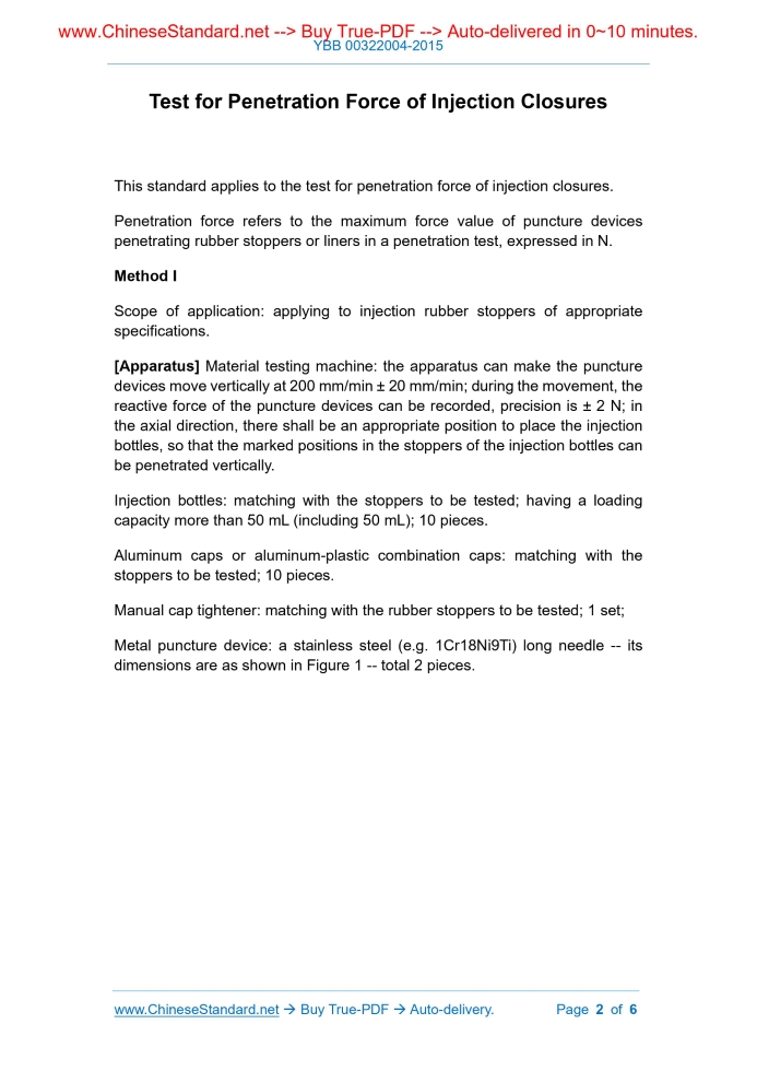 YBB 00322004-2015: Test for Penetration Force of Injection Closures Delivery: 9 seconds. True-PDF full-copy in English & invoice will be downloaded + auto-delivered via email. See step-by-step procedure Status: Valid