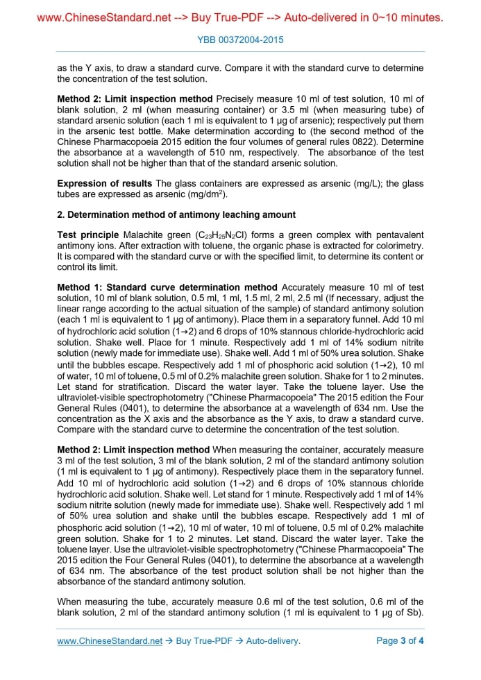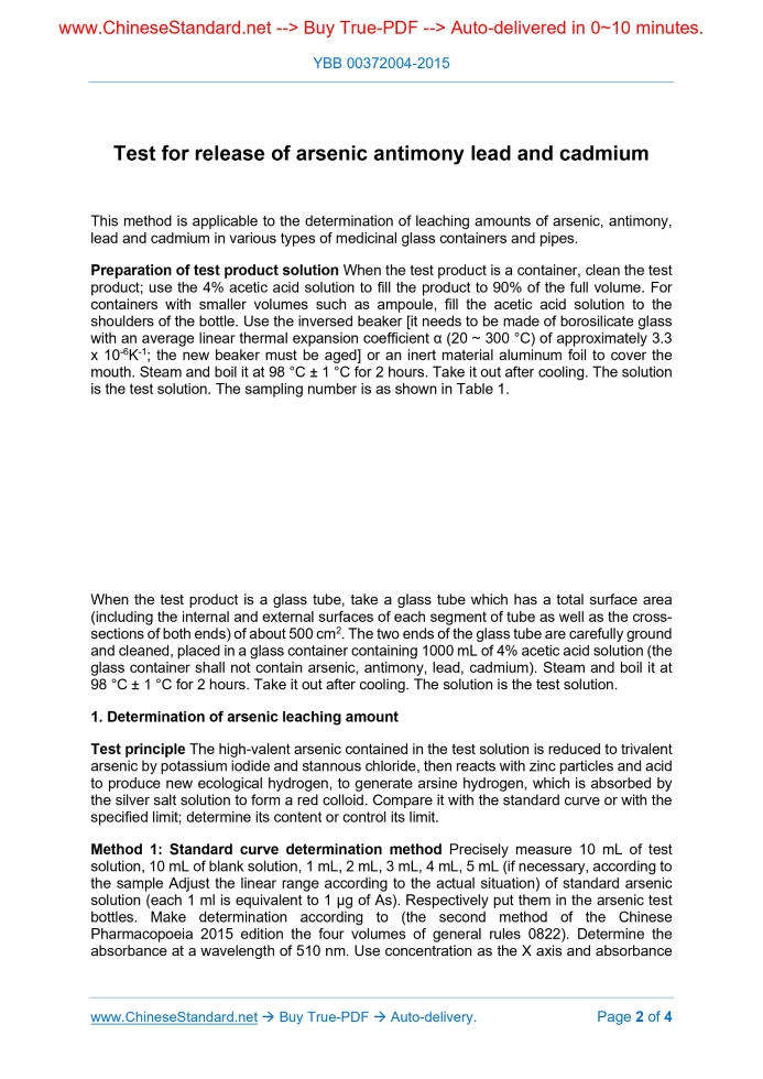 Similar standardsYBB 00372004-2015: Test for release of arsenic antimony lead and cadmium---This is an excerpt. Full copy of true-PDF in English version (including equations, symbols, images, flow-chart, tables, and figures etc.), auto-downloaded/delivered in 9 seconds, can be purchased online: https://www.ChineseStandard.net/PDF.aspx/YBB00372004-2015YBB National Drugs Packing Containers (Materials) Standards Test for release of arsenic antimony lead and cadmium Issued on: AUGUST 11, 2015 Implemented on: DECEMBER 01, 2015 Issued by. China Food and Drug Administration of PRC Test for release of arsenic antimony lead and cadmium This method is applicable to the determination of leaching amounts of arsenic, antimony, lead and cadmium in various types of medicinal glass containers and pipes. Preparation of test product solution When the test product is a container, clean the test product; use the 4% acetic acid solution to fill the product to 90% of the full volume. For containers with smaller volumes such as ampoule, fill the acetic acid solution to the shoulders of the bottle. Use the inversed beaker [it needs to be made of borosilicate glass with an average linear thermal expansion coefficient α (20 ~ 300 °C) of approximately 3.3 x 10-6K-1; the new beaker must be aged] or an inert material aluminum foil to cover the mouth. Steam and boil it at 98 °C ± 1 °C for 2 hours. Take it out after cooling. The solution is the test solution. The sampling number is as shown in Table 1. When the test product is a glass tube, take a glass tube which has a total surface area (including the internal and external surfaces of each segment of tube as well as the cross- sections of both ends) of about 500 cm2.The two ends of the glass tube are carefully ground and cleaned, placed in a glass container containing 1000 mL of 4% acetic acid solution (the glass container shall not contain arsenic, antimony, lead, cadmium). Steam and boil it at 98 °C ± 1 °C for 2 hours. Take it out after cooling. The solution is the test solution. 1.Determination of arsenic leaching amount Test principle The high-valent arsenic contained in the test solution is reduced to trivalent arsenic by potassium iodide and stannous chloride, then reacts with zinc particles and acid to produce new ecological hydrogen, to generate arsine hydrogen, which is absorbed by the silver salt solution to form a red colloid. Compare it with the standard curve or with the specified limit; determine its content or control its limit. Method 1.Standard curve determination method Precisely measure 10 mL of test solution, 10 mL of blank solution, 1 mL, 2 mL, 3 mL, 4 mL, 5 mL (if necessary, according to the sample Adjust the linear range according to the actual situation) of standard arsenic solution (each 1 ml is equivalent to 1 µg of As). Respectively put them in the arsenic test bottles. Make determination according to (the second method of the Chinese Pharmacopoeia 2015 edition the four volumes of general rules 0822). Determine the absorbance at a wavelength of 510 nm. Use concentration as the X axis and absorbance as the Y axis, to draw a standard curve. Compare it with the standard curve to determine the concentration of the test solution. Method 2.Limit inspection method Precisely measure 10 ml of test solution, 10 ml of blank solution, 2 ml (when measuring container) or 3.5 ml (when measuring tube) of standard arsenic solution (each 1 ml is equivalent to 1 µg of arsenic); respectively put them in the arsenic test bottle. Make determination according to (the second method of the Chinese Pharmacopoeia 2015 edition the four volumes of general rules 0822). Determine the absorbance at a wavelength of 510 nm, respectively. The absorbance of the test solution shall not be higher than that of the standard arsenic solution. Expression of results The glass containers are expressed as arsenic (mg/L); the glass tubes are expressed as arsenic (mg/dm2). 2.Determination method of antimony leaching amount Test principle Malachite green (C23H25N2Cl) forms a green complex with pentavalent antimony ions. After extraction with toluene, the organic phase is extracted for colorimetry. It is compared with the standard curve or with the specified limit, to determine its content or control its limit. Method 1.Standard curve determination method Accurately measure 10 ml of test solution, 10 ml of blank solution, 0.5 ml, 1 ml, 1.5 ml, 2 ml, 2.5 ml (If necessary, adjust the linear range according to the actual situation of the sample) of standard antimony solution (each 1 ml is equivalent to 1 µg of antimony). Place them in a separatory funnel. Add 10 ml of hydrochloric acid solution (1→2) and 6 drops of 10% stannous chloride-hydrochloric acid solution. Shake well. Place for 1 minute. Respectively add 1 ml of 14% sodium nitrite solution (newly made for immediate use). Shake well. Add 1 ml of 50% urea solution. Shake until the bubbles escape. Respectively add 1 ml of phosphoric acid solution (1→2), 10 ml of water, 10 ml of toluene, 0.5 ml of 0.2% malachite green solution. Shake for 1 to 2 minutes. Let stand for stratification. Discard the water layer. Take the toluene layer. Use the ultraviolet-visible spectrophotometry ("Chinese Pharmacopoeia" The 2015 edition the Four General Rules (0401), to determine the absorbance at a wavelength of 634 nm. Use the concentration as the X axis and the absorbance as the Y axis, to draw a standard curve. Compare with the standard curve to determine the concentration of the test solution. Method 2.Limit inspection method When measuring the container, accurately measure 3 ml of the test solution, 3 ml of the blank solution, 2 ml of the standard antimony solution (1 ml is equivalent to 1 µg of antimony). Respectively place them in the separatory funnel. Add 10 ml of hydrochloric acid solution (1→2) and 6 drops of 10% stannous chloride hydrochloric acid solution. Shake well. Let stand for 1 minute. Respectively add 1 ml of 14% sodi