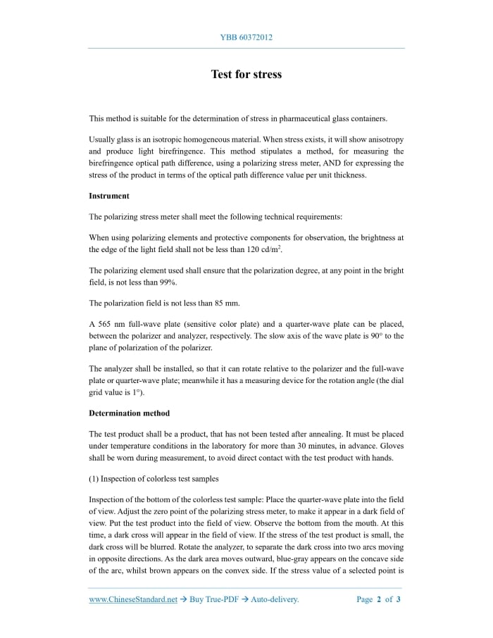 YBB6:---This is an excerpt. Full copy of true-PDF in English version (including equations, symbols, images, flow-chart, tables, and figures etc.), auto-downloaded/delivered in 9 seconds, can be purchased online: https://www.ChineseStandard.net/PDF.aspx/YBB6YBB NATIONAL STANDARD OF THE PEOPLE’S REPUBLIC OF CHINA Test for stress Test for stress This method is suitable for the determination of stress in pharmaceutical glass containers. Usually glass is an isotropic homogeneous material. When stress exists, it will show anisotropy and produce light birefringence. This method stipulates a method, for measuring the birefringence optical path difference, using a polarizing stress meter, AND for expressing the stress of the product in terms of the optical path difference value per unit thickness. Instrument The polarizing stress meter shall meet the following technical requirements: When using polarizing elements and protective components for observation, the brightness at the edge of the light field shall not be less than 120 cd/m2. The polarizing element used shall ensure that the polarization degree, at any point in the bright field, is not less than 99%. The polarization field is not less than 85 mm. A 565 nm full-wave plate (sensitive color plate) and a quarter-wave plate can be placed, between the polarizer and analyzer, respectively. The slow axis of the wave plate is 90° to the plane of polarization of the polarizer. The analyzer shall be installed, so that it can rotate relative to the polarizer and the full-wave plate or quarter-wave plate; meanwhile it has a measuring device for the rotation angle (the dial grid value is 1°). Determination method The test product shall be a product, that has not been tested after annealing. It must be placed under temperature conditions in the laboratory for more than 30 minutes, in advance. Gloves shall be worn during measurement, to avoid direct contact with the test product with hands. (1) Inspection of colorless test samples Inspection of the bottom of the colorless test sample: Place the quarter-wave plate into the field of view. Adjust the zero point of the polarizing stress meter, to make it appear in a dark field of view. Put the test product into the field of view. Observe the bottom from the mouth. At this time, a dark cross will appear in the field of view. If the stress of the test product is small, the dark cross will be blurred. Rotate the analyzer, to separate the dark cross into two arcs moving in opposite directions. As the dark area moves outward, blue-gray appears on the concave side of the arc, whilst brown appears on the convex side. If the stress value of a selected point is ...... Source: Above contents are excerpted from the full-copy PDF -- translated/reviewed by: www.ChineseStandard.net / Wayne Zheng et al. Tips & Frequently Asked Questions:Question 1: How long will the true-PDF of English version of YBB 60372012 be delivered?Answer: The full copy PDF of English version of YBB 60372012 can be downloaded in 9 seconds, and it will also be emailed to you in 9 seconds (double mechanisms to ensure the delivery reliably), with PDF-invoice.Question 2: Can I share the purchased PDF of YBB 60372012_English with my colleagues?Answer: Yes. The purchased PDF of YBB 60372012_English will be deemed to be sold to your employer/organization who actually paid for it, including your colleagues and your employer's intranet.Question 3: Does the price include tax/VAT?Answer: Yes. Our tax invoice, downloaded/delivered in 9 seconds, includes all tax/VAT and complies with 100+ countries' tax regulations (tax exempted in 100+ countries) -- See Avoidance of Double Taxation Agreements (DTAs): List of DTAs signed between Singapore and 100+ countriesQuestion 4: Do you accept my currency other than USD?Answer: Yes. www.ChineseStandard.us -- YBB 60372012 -- Click this link and select your country/currency to pay, the exact amount in your currency will be printed on the invoice. Full PDF will also be downloaded/emailed in 9 seconds.How to buy and download a true PDF of English version of YBB 60372012?A step-by-step guide to download PDF of YBB 60372012_EnglishStep 1: Visit website https://www.ChineseStandard.net (Pay in USD), or https://www.ChineseStandard.us (Pay in any currencies such as Euro, KRW, JPY, AUD).Step 2: Search keyword "YBB 60372012". Step 3: Click "Add to Cart". If multiple PDFs are required, repeat steps 2 and 3 to add up to 12 PDFs to cart. Step 4: Select payment option (Via payment agents Stripe or PayPal). Step 5: Customize Tax Invoice -- Fill up your email etc. Step 6: Click "Checkout". Step 7: Make payment by credit card, PayPal, Google Pay etc. After the payment is completed and in 9 seconds, you will receive 2 emails attached with the purchased PDFs and PDF-invoice, respectively. Step 8: Optional -- Go to download PDF. Step 9: Optional -- Click Open/Download PDF to download PDFs and invoice. See screenshots for above steps: Steps 1~3 Steps 4~6 Step 7 Step 8 Step 9 |