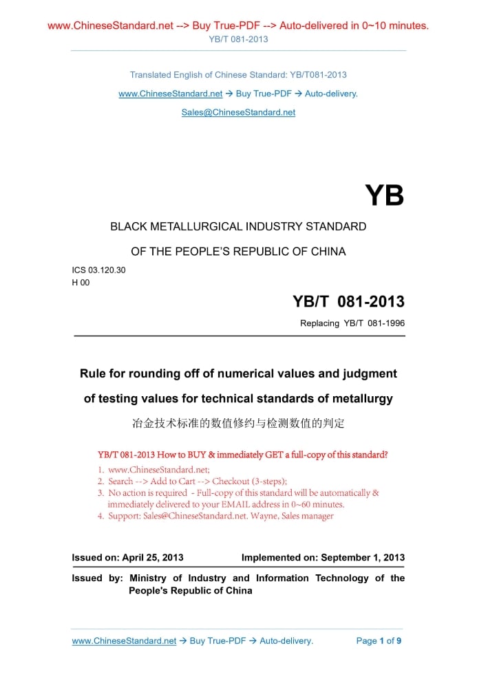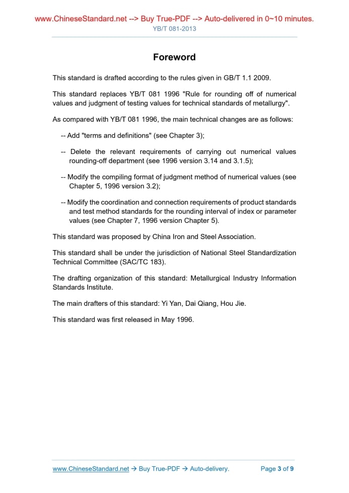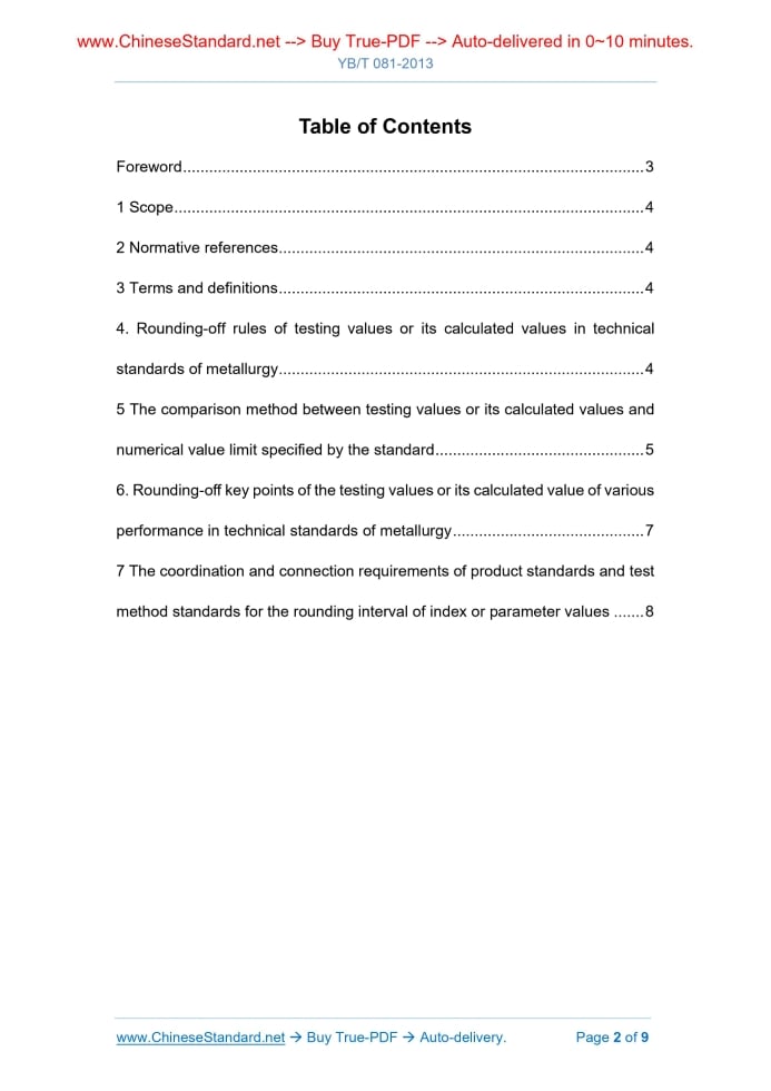 YB/T 081-2013: Rule for rounding off of numerical values and judgement of testing values for technical standards of metallurgy---This is an excerpt. Full copy of true-PDF in English version (including equations, symbols, images, flow-chart, tables, and figures etc.), auto-downloaded/delivered in 9 seconds, can be purchased online: https://www.ChineseStandard.net/PDF.aspx/YBT081-2013 YB BLACK METALLURGICAL INDUSTRY STANDARD ICS 03.120.30 H 00 Replacing YB/T 081-1996 Rule for rounding off of numerical values and judgment of testing values for technical standards of metallurgy Issued on. APRIL 25, 2013 Implemented on. SEPTEMBER 1, 2013 Issued by. Ministry of Industry and Information Technology of the People's Republic of China Table of ContentsForeword... 3 1 Scope... 4 2 Normative references... 4 3 Terms and definitions... 4 4.Rounding-off rules of testing values or its calculated values in technical standards of metallurgy... 4 5 The comparison method between testing values or its calculated values and numerical value limit specified by the standard... 5 6.Rounding-off key points of the testing values or its calculated value of various performance in technical standards of metallurgy... 7 7 The coordination and connection requirements of product standards and test method standards for the rounding interval of index or parameter values... 8ForewordThis standard is drafted according to the rules given in GB/T 1.1 2009. This standard replaces YB/T 081 1996 "Rule for rounding off of numerical values and judgment of testing values for technical standards of metallurgy". As compared with YB/T 081 1996, the main technical changes are as follows. -- Add "terms and definitions" (see Chapter 3); -- Delete the relevant requirements of carrying out numerical values rounding-off department (see 1996 version 3.14 and 3.1.5); -- Modify the compiling format of judgment method of numerical values (see Chapter 5, 1996 version 3.2); -- Modify the coordination and connection requirements of product standards and test method standards for the rounding interval of index or parameter values (see Chapter 7, 1996 version Chapter 5). This standard was proposed by China Iron and Steel Association. This standard shall be under the jurisdiction of National Steel Standardization Technical Committee (SAC/TC 183). The drafting organization of this standard. Metallurgical Industry Information Standards Institute. The main drafters of this standard. Yi Yan, Dai Qiang, Hou Jie. This standard was first released in May 1996. Rule for rounding off of numerical values and judgment of testing values for technical standards of metallurgy1 ScopeThis standard specifies the principle and the rounding-off key points of carrying out rounding off of numerical values and judgment of testing values or its calculated values in metallurgical standardization activities, and the coordination and connection requirements of product standards and test method standards for the rounding interval of index or parameter values. This standard applies to the compiling of all kinds of technical standards of metallurgy or relevant documents and the judgment of testing values or its calculated values.2 Normative referencesThe following documents are essential for the application of this document. For dated references, only the dated version applies to this document. For undated references, the latest version (including all amendments) applies to this document. GB/T 228.1-2010 Metallic materials - Tensile testing - Part 1.Method of test at room temperature GB/T 8170-2008 Rules of rounding off for numerical values & expression and judgment of limiting values3 Terms and definitionsTerms and definitions defined in GB/T 8170-2008 apply to this document. 4.Rounding-off rules of testing values or its calculated values in technical standards of metallurgy 4.1 In the activities of revising and implementing technical standards of metallurgy or related documents, determine a variety of indexes and parameters; for the testing values or its calculated values, when rounding off is required, determine the rounding intervals and rules according to the rules given in GB/T 8170-2008 Chapter 3; continuous rounding off is not permitted. 4.2 When testing values or its calculated values are rounded off, the numerical digit indicated for reserving numerical value shall be in accordance with the numerical digit identified by index or parameter values specified in product standards.5 The comparison method between testing values or its calculated values and numerical value limit specified by the standard5.1 General rules 5.1.1 In judging whether the testing values or its calculated values meet the standard requirements or not, compare the testing values or its calculated values obtained from the test with the numerical value limit specified by standards. The comparison method may adopt. 5.1.2 If the standard or relevant documents have provisions on the practical comparison method, it shall be implemented according to the provisions of the standard or relevant documents. If not specified, it is recommended to use rounding-off value comparison method. 5.2 Full numerical comparison method Compare the testing values or its calculated values which are not subjected to rounding off (or through rounding off, but it shall be marked that it is obtained through rounding-off or non-rounding-off) with the numerical value limit specified in the standard or the relevant documents. As long as it is beyond the scope of the numerical value limit (regardless of size of degree), it is judged to be unsatisfactory. Examples are shown in Table 1. 5.3 Rounding-off value comparison method 5.3.1 Round off the testing values or its calculated values, the rounding-off digits shall be in accordance with the numerical digit of specified numerical value limit. 6.2 Mechanical Property 6.2.1 If the standard or relevant documents do not specify the rounding interval, the tensile test results of metal materials 