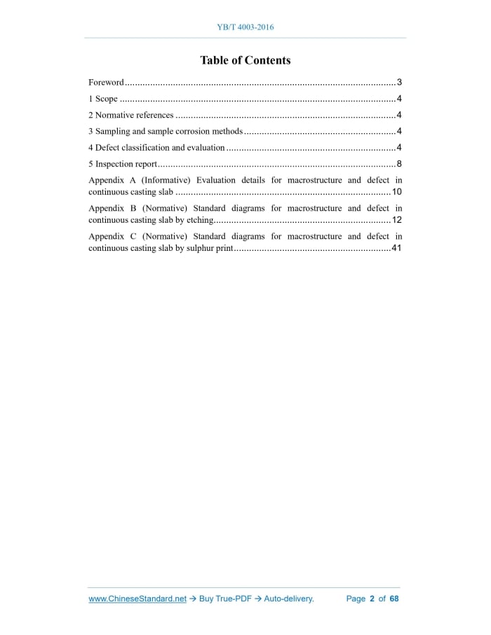 YB/T 4003-2016: Standard diagrams for macrostructure and defect in continuous casting slab---This is an excerpt. Full copy of true-PDF in English version (including equations, symbols, images, flow-chart, tables, and figures etc.), auto-downloaded/delivered in 9 seconds, can be purchased online: https://www.ChineseStandard.net/PDF.aspx/YBT4003-2016YB FERROUS METALLURGY INDUSTRY STANDARD ICS 77.040.99 H 24 Replacing YB/T 4003-1997 Standard diagrams for macrostructure and defect in continuous casting slab Issued on. OCTOBER 22, 2016 Implemented on. APRIL 01, 2017 Issued by. Ministry of Industry and Information Technology of the People��s Republic of China. Table of ContentsForeword... 3 1 Scope... 4 2 Normative references... 4 3 Sampling and sample corrosion methods... 4 4 Defect classification and evaluation... 4 5 Inspection report... 8 Appendix A (Informative) Evaluation details for macrostructure and defect in continuous casting slab... 10 Appendix B (Normative) Standard diagrams for macrostructure and defect in continuous casting slab by etching... 12 Appendix C (Normative) Standard diagrams for macrostructure and defect in continuous casting slab by sulphur print... 41ForewordThis Standard was drafted in accordance with the rules given in GB/T 1.1-2009. This Standard is a revision of YB/T 4003-1997 Standard diagrams for macrostructure and defect in continuous casting slab. Compared with YB/T 4003-1997, the major technical changes of this Standard are as follows. -- Expand the scope of application; -- Add morphological characteristics and cause, as well as schematic diagram, of the ��white band��; -- Add the evaluation details for some defects (see Appendix A), and modify the standard diagrams accordingly (see Appendix B and Appendix C). This Standard was proposed by China Iron and Steel Industry Association. This Standard shall be under the jurisdiction of National Technical Committee 183 on Iron and Steel of Standardization Administration of China (SAC/TC 183). The drafting organizations of this Standard. Wuhan Iron and Steel Company Limited, Shougang Group Co., Ltd., Hebei Iron and Steel Co., Ltd. Tangshan Branch, China Metallurgical Information and Standardization Institute. The drafters of this Standard. Han Rongdong, Chen Shihua, Luan Yan, Wang Zhifen, Zhou Yigui, Ju Xinhua, Zhang Ping, Wu Lixin, Guo Jian, Deng Cuiqing. The previous versions �C replaced by this Standard �C of the standard are. -- YB/T 4003-1991, YB/T 4003-1997. Standard diagrams for macrostructure and defect in continuous casting slab1 ScopeThis Standard specifies the samples used in the testing of macrostructure and defect in continuous casting slab by etching and sulfur print, as well as the morphological characteristics, cause and evaluation principle of defects. This Standard applies to the evaluation for macrostructure and defect in slabs such as carbon steel and alloy steel produced by continuous casting process. The qualification grade of various defects in this Standard and the defects that are not allowed to exist shall be stipulated in the corresponding technical conditions and the agreement between the two parties.2 Normative referencesThe following referenced documents are indispensable for the application of this document. For dated references, only the dated version applies to this document. For undated references, the latest edition (including all amendments) applies to this document. GB/T 226, Test method for macrostructure and defect of steel by etching GB/T 4236, Steel examination by sulphur print (Baumann method)3 Sampling and sample corrosion methodsThe sample cut-out and display methods shall comply with the provisions of GB/T 226 or GB/T 4236.4 Defect classification and evaluation4.1 Morphological characteristics, cause and evaluation principle of various defects 4.1.1 Center segregation The morphological characteristics, cause and evaluation principle of center segregation are as follows. 4.1.2 Center porosity The morphological characteristics, cause and evaluation principle of center porosity are as follows. 4.1.3 Intermediate crack The morphological characteristics, cause and evaluation principle of intermediate crack are as follows. 4.1.4 Corner crack The morphological characteristics, cause and evaluation principle of corner crack are as follows. 4.1.5 Triangular crack The morphological characteristics, cause and evaluation principle of triangular crack are as follows. 4.1.6 Alumina (Al2O3) inclusions The morphological characteristics, cause and evaluation principle of alumina (Al2O3) inclusions are as follows. 4.1.7 Pinhole bubbles The morphological characteristics, cause and evaluation principle of pinhole bubbles are as follows. 4.1.8 Honeycomb bubbles The morphological characteristics, cause and evaluation principle of honeycomb bubbles are as follows. 4.1.9 Silicate inclusions The morphological characteristics, cause and evaluation principle of silicate inclusions are as follows. 4.1.10 White bands The morphological characteristics, cause and evaluation principle of white bands are as follows. 4.2 Standard diagrams 4.2.1 This Standard includes the following two sets of standard diagrams. a) Macrostructure diagram of continuous casting slab by etching (see Appendix B); b) Sulfur print standard diagrams (see Appendix C). 4.2.2 All types of standard diagrams for defect are composed of 6 grades from 0.5 to 3.0, which increase with the severity of the defect. See Appendix A for the size or quantity of specific defects. 4.3 Evaluation method and qualification grade 4.3.1 All types of defects are limited to visual visibility, at a start-rating grade of 0.5. When evaluating, grade by comparing with the diagrams listed in Appendix B and Appendix C. Where the defect grade cannot be determined by comparison, refer to Appendix A for measurement and evaluation. 4.3.2 The selection of the standard diagram, the qualification grade of various defects and the defects that are not a