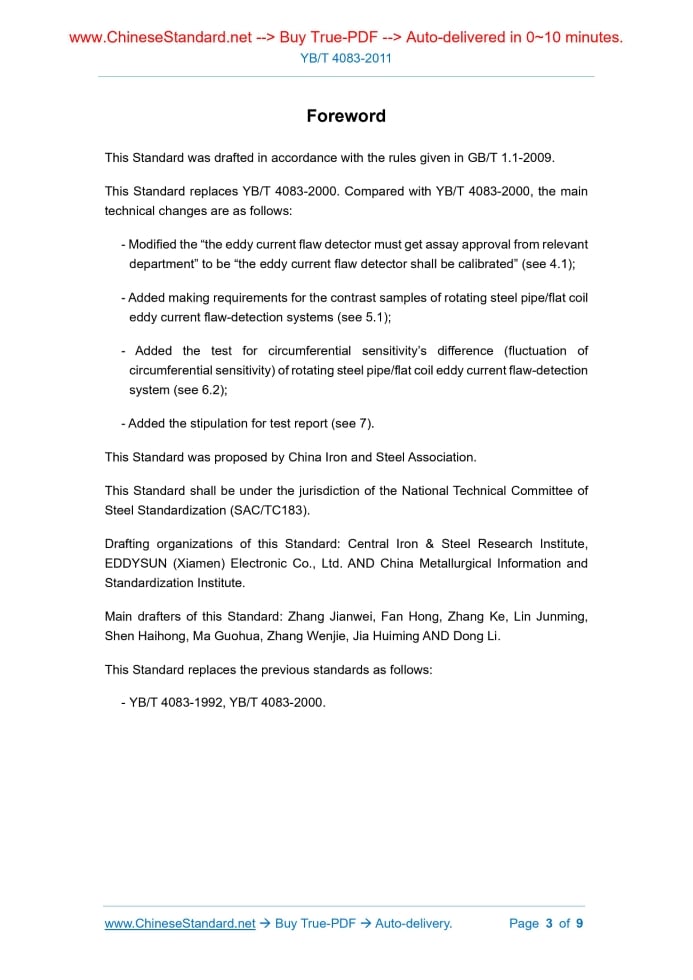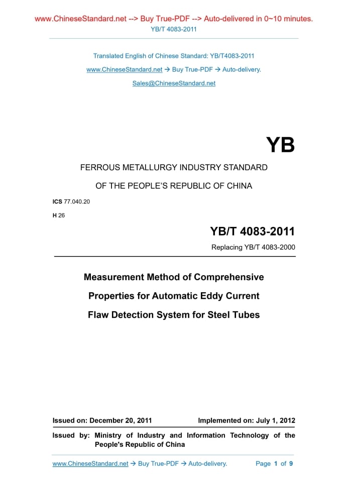 YB/T 4083-2011: Measurement method of comprehensive properties for automatic eddy current flaw detection system for steel tubes---This is an excerpt. Full copy of true-PDF in English version (including equations, symbols, images, flow-chart, tables, and figures etc.), auto-downloaded/delivered in 9 seconds, can be purchased online: https://www.ChineseStandard.net/PDF.aspx/YBT4083-2011 YB FERROUS METALLURGY INDUSTRY STANDARD ICS 77.040.20 H 26 Replacing YB/T 4083-2000 Measurement Method of Comprehensive Properties for Automatic Eddy Current Flaw Detection System for Steel Tubes Issued on: DECEMBER 20, 2011 Implemented on: JULY 1, 2012 Issued by. Ministry of Industry and Information Technology of the People's Republic of China Table of ContentsForeword... 3 1 Scope... 4 2 Normative references... 4 3 Terms and definitions... 5 4 Test conditions... 5 5 Contrast sample... 5 6 Test items and methods... 6 7 Test report... 9ForewordThis Standard was drafted in accordance with the rules given in GB/T 1.1-2009. This Standard replaces YB/T 4083-2000.Compared with YB/T 4083-2000, the main technical changes are as follows. - Modified the “the eddy current flaw detector must get assay approval from relevant department” to be “the eddy current flaw detector shall be calibrated” (see 4.1); - Added making requirements for the contrast samples of rotating steel pipe/flat coil eddy current flaw-detection systems (see 5.1); - Added the test for circumferential sensitivity’s difference (fluctuation of circumferential sensitivity) of rotating steel pipe/flat coil eddy current flaw-detection system (see 6.2); - Added the stipulation for test report (see 7). This Standard was proposed by China Iron and Steel Association. This Standard shall be under the jurisdiction of the National Technical Committee of Steel Standardization (SAC/TC183). Drafting organizations of this Standard. Central Iron & Steel Research Institute, EDDYSUN (Xiamen) Electronic Co., Ltd. AND China Metallurgical Information and Standardization Institute. Main drafters of this Standard. Zhang Jianwei, Fan Hong, Zhang Ke, Lin Junming, Shen Haihong, Ma Guohua, Zhang Wenjie, Jia Huiming AND Dong Li. This Standard replaces the previous standards as follows. - YB/T 4083-1992, YB/T 4083-2000. Measurement Method of Comprehensive Properties for Automatic Eddy Current Flaw Detection System for Steel Tubes1 ScopeThis Standard specifies the “test conditions, contrast samples, test items, test methods, and minimum standards for performance indicators that should be achieved for automatic eddy current flaw-detection system of steel tubes (it is generally composed by eddy current flaw detector, detection coil, magnetic saturation device AND mechanical transmission device)” AND content of test report. This Standard applies to comprehensive performance’s test of steel-tube-through-type OR rotating steel pipe/flat coil type automatic eddy current flaw-detection system. For comprehensive performance’s test of steel rod automatic eddy current system, or magnetic flux leakage detection system, AND automatic eddy current flaw-detection system for steel tube and other magnetic flux leakage detection system for steel tube, this Standard can be used for reference during the usage.2 Normative referencesThe following documents are essential to the application of this document. For the dated documents, only the versions with the dates indicated are applicable to this document; for the undated documents, only the latest version (including all the amendments) are applicable to this standard. GB/T 7735 Steel Tubes - The Inspection Method on Eddy Current Test GB/T 12604.6 Non-destructive Testing - Terminology - Terms Used in Eddy Current Testing YB/T 143 Measurement Method of the Error of Signal Amplitude for Eddy Current Flaw Detectors YB/T 145 Die Casting and Size Measurement Method of Artificial Defects on the Reference Sample Pipes circumferential sensitivity) 6.2.1 Eddy current flaw-detection system for steel-tube-through type coil Adjust the flaw-detection system to the normal flaw-detection state; according to the speed of the normal flaw-detection, adjust the sensitivity; use the contrast sample shown in Figure 1 to make the three artificial holes in the middle part just alarm, and record the dB value of the gainer or attenuator, at this time; adjust the sensitivity of the flaw-detection, and record the dB value when the 3 artificial holes begin not to alarm. The maximum difference between them is the difference of circumferential sensitivity. The absolute value of this difference shall not be greater than 3dB. For the steel tube whose outer diameter is greater than or equal to 100mm, this absolute value shall not be greater than 4dB. Perform the test for 3 times consecutively, and if the results of the 3 times are not the same, the worst value shall be taken. 6.2.2 Eddy current flaw-detection system for rotating flat coil For the flaw-detection system, whose probe is in rotating type and whose steel tube can move forward in straight line, use the contrast sample shown in Figure 2 to let the artificial defects in middle part go through the flaw-detection system repeatedly. Firstly, set 0° position for the sample at will; adjust the sensitivity of device’s each channel; record gainer’s or attenuator’s dB value when the artificial defect just alarms. For the rotating sample, when it is at 120° and 240° position, use the same method to test and record the dB value when the artificial defect just alarms. The subtraction of the two dB values which differ by most is the difference of circumferential sensitivity. The absolute value of this difference shall not be greater than 3dB. For the steel tube whose outer diameter is greater than or equal to 100mm, this absolute value shall not be greater than 4dB. Perform the test for 3 times consecutively for each channel, and if the results of the 3 times are not the same, the worst value shall be taken. 