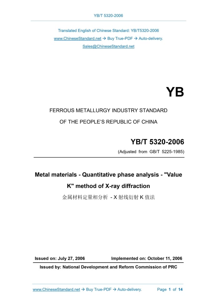 YB/T 5320-2006: Metal materials - Quantitative phase analysis - Value K method of X-ray diffraction Delivery: 9 seconds. True-PDF full-copy in English & invoice will be downloaded + auto-delivered via email. See step-by-step procedure Status: Valid