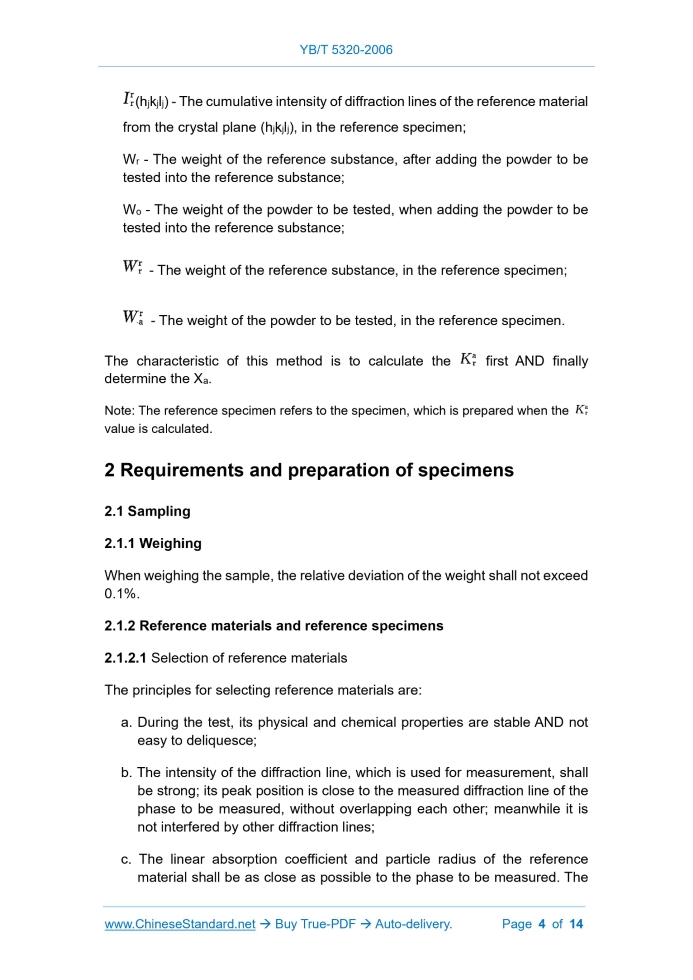 YB/T 5320-2006: Metal materials - Quantitative phase analysis - Value K method of X-ray diffraction---This is an excerpt. Full copy of true-PDF in English version (including equations, symbols, images, flow-chart, tables, and figures etc.), auto-downloaded/delivered in 9 seconds, can be purchased online: https://www.ChineseStandard.net/PDF.aspx/YBT5320-2006 YB FERROUS METALLURGY INDUSTRY STANDARD (Adjusted from GB/T 5225-1985) Metal materials - Quantitative phase analysis - "Value K" method of X-ray diffraction Issued on. JULY 27, 2006 Implemented on. OCTOBER 11, 2006 Issued by. National Development and Reform Commission of PRC Table of Contents1 Principles... 3 2 Requirements and preparation of specimens... 4 3 Test instruments and test conditions... 6 4 Test procedure and result calculation... 7 Appendix A (Supplementary)... 9 Appendix B (Supplementary)... 12 Additional information... 14 Metal materials - Quantitative phase analysis - "Value K" method of X-ray diffraction This standard applies to the measurement of phase content in polycrystalline powders of metallic materials. It can also be used as a reference for quantitative phase analysis of polycrystalline powder specimens of other materials.1 PrinciplesThe X-ray diffraction pattern of a phase is a characterization of the crystal structure of the phase. When using the K value method to perform X-ray diffraction quantitative analysis on a multiphase specimen, the cumulative intensity of a phase’s diffraction line AND the content of the phase in the specimen have the relationship of formulas (1) and (2) (see Appendix A for derivation). Where. Xa - The weight content of the α phase in the powder to be tested; - The constant of proportionality. For the same radiation, the constant is related to the αphase to be tested AND the reference substance; Ia(hikili) - The cumulative intensity of diffraction lines of α phase on the (hikili) crystal plane, after adding the reference substance to the powder to be tested; Ir(hjkjlj) - The cumulative intensity of diffraction lines of the reference material on the crystal plane (hjkjlj), after adding the reference substance to the powder to be tested; (hikili) - The cumulative intensity of diffraction lines of the α phase on the crystal plane (hikili), in the reference specimen; (hjkjlj) - The cumulative intensity of diffraction lines of the reference material from the crystal plane (hjkjlj), in the reference specimen; Wr - The weight of the reference substance, after adding the powder to be tested into the reference substance; Wo - The weight of the powder to be tested, when adding the powder to be tested into the reference substance; - The weight of the reference substance, in the reference specimen; - The weight of the powder to be tested, in the reference specimen. The characteristic of this method is to calculate the first AND finally determine the Xa. Note. The reference specimen refers to the specimen, which is prepared when the value is calculated.2 Requirements and preparation of specimens2.1 Sampling 2.1.1 Weighing When weighing the sample, the relative deviation of the weight shall not exceed 0.1%. 2.1.2 Reference materials and reference specimens 2.1.2.1 Selection of reference materials The principles for selecting reference materials are. 2.1.2.2 The linear absorption coefficient and particle radius of the reference material and the phase to be measured shall satisfy the formula (3). 2.1.2.3 When calculating the value, the recommended ratio of the reference specimen, which is formed by mixing the pure reference material and the pure phase to be measured, is as follows. When the cumulative intensity of the measured diffraction lines of the reference material and the phase to be measured differ greatly, it shall change the ratio, to increase the cumulative intensity of the weak diffraction lines. 2.1.4 Mixing of sample Use an agate mortar to grind the powders, which are prepared in 2.1.2.3 and 2.1.2.4, for 30 ~ 40 minutes; mix well. 2.2 Preparation of specimens 2.2.1 Size and thickness of reference specimen and mixed specimen In any selected diffraction position, the X-ray's irradiation area shall not exceed the surface area of the specimen. The thickness of the specimen shall satisfy formula (4). 2.2.2 Sample preparation 2.2.2.1 Use a commonly used specimen frame. Place a piece of about No.300 metallographic sandpaper, which is larger than the frame, under the frame (corresponding rough ground glass can also be used). 2.2.2.2 Pour the ground mixed powder into the specimen frame. Compact vertically to shape it. 2.2.2.3 Turn the pressed specimen over at an angle of 180°. Remove the sandpaper. Use the surface of the specimen, which is in contact with the sandpaper (or ground glass), as the test surface.3 Test instruments and test conditions3.1 Diffractometer The overall stability of the diffractometer1 is better than 1%. 3.2 Test conditions 3.3 Requirements for diffraction peak shape The peak height shall be 4 times larger than the fluctuation range of the background; The peak height should be about 4 times the half-height width.4 Test procedure and result calculationBefore the quantitative determination, the intensity of the diffraction lines of the reference specimen and the mixed specimen shall first be calibrated with the JCPDS standard card, to check whether the reference material and the phase to be measured have a preferred orientation. 4.1 Determination of value of reference specimen 4.1.1 To calculate the pure phase to be measured of the value, it shall first carry out qualitative analysis of the X-ray diffraction line, to check the purity; there shall be no impurity diffraction lines. 4.1.2 For the pure reference material selected according to 2.1.2, it shall check its purity according to 4.1.1. 4.1.7 Calculate value according to formula (2). 4.2 Determination of the content of the phase to be measured 4.2.1 According to 2.1.2.4, add a reference substance to the powder to 