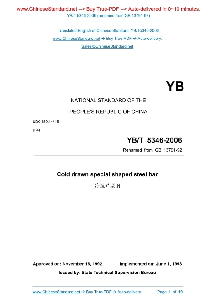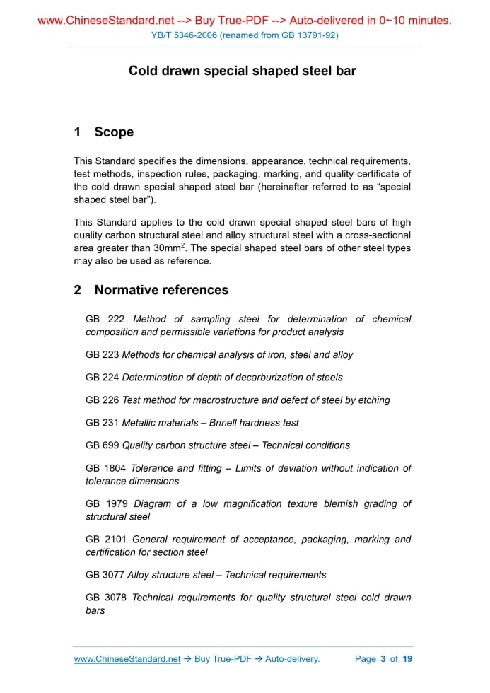 Similar standardsYB/T 5346-2006: Cold drawn special shaped steel bar---This is an excerpt. Full copy of true-PDF in English version (including equations, symbols, images, flow-chart, tables, and figures etc.), auto-downloaded/delivered in 9 seconds, can be purchased online: https://www.ChineseStandard.net/PDF.aspx/YBT5346-2006NATIONAL STANDARD OF THE PEOPLE’S REPUBLIC OF CHINA UDC 669.14/.15 H 44 YB/T 5346-2006 Renamed from GB 13791-92 Cold drawn special shaped steel bar APPROVED ON: NOVEMBER 16, 1992 IMPLEMENTED ON: JUNE 1, 1993 Issued by: State Technical Supervision Bureau Table of Contents1 Scope ... 3 2 Normative references ... 3 3 Classification and codes ... 4 4 Dimensions, appearance and weight ... 4 5 Technical requirements ... 6 6 Test methods ... 8 7 Acceptance rules ... 9 8 Packaging, marking and quality certificate ... 9 Additional information: ... 19 Cold drawn special shaped steel bar1 ScopeThis Standard specifies the dimensions, appearance, technical requirements, test methods, inspection rules, packaging, marking, and quality certificate of the cold drawn special shaped steel bar (hereinafter referred to as “special shaped steel bar”). This Standard applies to the cold drawn special shaped steel bars of high quality carbon structural steel and alloy structural steel with a cross-sectional area greater than 30mm2. The special shaped steel bars of other steel types may also be used as reference.2 Normative referencesGB 222 Method of sampling steel for determination of chemical composition and permissible variations for product analysis GB 223 Methods for chemical analysis of iron, steel and alloy GB 224 Determination of depth of decarburization of steels GB 226 Test method for macrostructure and defect of steel by etching GB 231 Metallic materials – Brinell hardness test GB 699 Quality carbon structure steel – Technical conditions GB 1804 Tolerance and fitting – Limits of deviation without indication of tolerance dimensions GB 1979 Diagram of a low magnification texture blemish grading of structural steel GB 2101 General requirement of acceptance, packaging, marking and certification for section steel GB 3077 Alloy structure steel – Technical requirements GB 3078 Technical requirements for quality structural steel cold drawn bars 4.4.1.1 The special shaped steel bars delivered in straight strips shall be generally 2~6m in length. 4.4.1.2 The special shaped steel bars with a length greater than 6m may be supplied by the agreement between the supplier and the demander. 4.4.2 Specified-length and multiple-length 4.4.2.1 When delivered in specified-length and multiple-length, the permissible variation in length shall not exceed +50mm. When delivered in specified-length and multiple-length, it shall be indicated in the contract. 4.5 Delivery weight 4.5.1 The special shaped steel bars shall be delivered according to the actual weight, and may also be delivered according to the theoretical weight. 4.5.2 The special shaped steel bars delivered without cutting heads shall be deducted from the weight of the head deformation portion by 2%. 4.6 Marking example The FD-X asymmetric section cold drawn special shaped steel bar, made of #20 high-quality carbon structural steel, with a dimensional accuracy of Grade 12, is marked as: Cold drawn special shaped steel bar5 Technical requirements5.1 Designation and chemical components The designation of the special shaped steel bar shall be indicated in the contract, and its chemical components (melting analysis) shall comply with the provisions of GB 699 and GB 3077. According to the agreement between the supplier and the demander and indicated in the contract, it may be manufactured with the designation of other steel types. 5.2 Delivery state The special shaped steel bars shall be delivered in a cold drawn state. According to the requirements of the demander, it may be delivered in a state of heat treatment (annealing, normalizing, tempering, etc.), but it shall be indicated in the contract. 5.3 Mechanical properties 6 Decarburization (Different pieces of steel) 2 GB 224 6.2 The overall dimensions and bending of the special shaped steel bar shall be measured at 150mm from the end (for the special shaped steel bars without cutting heads, the length of the head deformation portion shall be removed). 6.3 The surface defect depth of the special shaped steel bar may be inspected and determined after grinding with a grinding wheel, a file or an abrasive cloth if necessary.7 Acceptance rules7.1 Inspection and acceptance The inspection and acceptance of the special shaped steel bar shall be carried out by the technical quality supervision department of the supplier. 7.2 Batch grouping rules The special shaped steel bars shall be accepted in batches. Each batch shall consist of special shaped steel bars of the same furnace tank number, the same overall dimensions, and the same heat treatment furnace (at the time of heat treatment). 7.3 Sample size The sample size for the inspection of the special shaped steel bar shall comply with the provisions of Table 4. 7.4 Re-inspection and decision rules The re-inspection and decision rules of the special shaped steel bar shall comply with the provisions of GB 2101.8 Packaging, marking and quality certificate8.1 For special shaped steel bars, the packaging shall be in accordance with the provisions for Class I packaging of GB 2101; and the marking and quality certificate shall be in accordance with the corresponding provisions of GB 2101. 8.2 The special shaped steel bars treated by surface phosphating may also be delivered by dipping (coating) rust-preventative oil according to the requirements of the demander. ......Source: Above contents are excerpted from the full-copy PDF -- translated/reviewed by: www.ChineseStandard.net / Wayne Zheng et al. Tips & Frequently Asked Questions:Question 1: How long will the true-PDF of English version of YB/T 5346-2006 be delivered?Answer: The full copy PDF of En