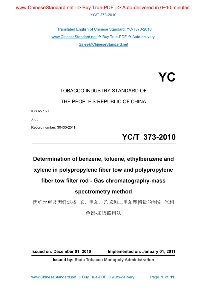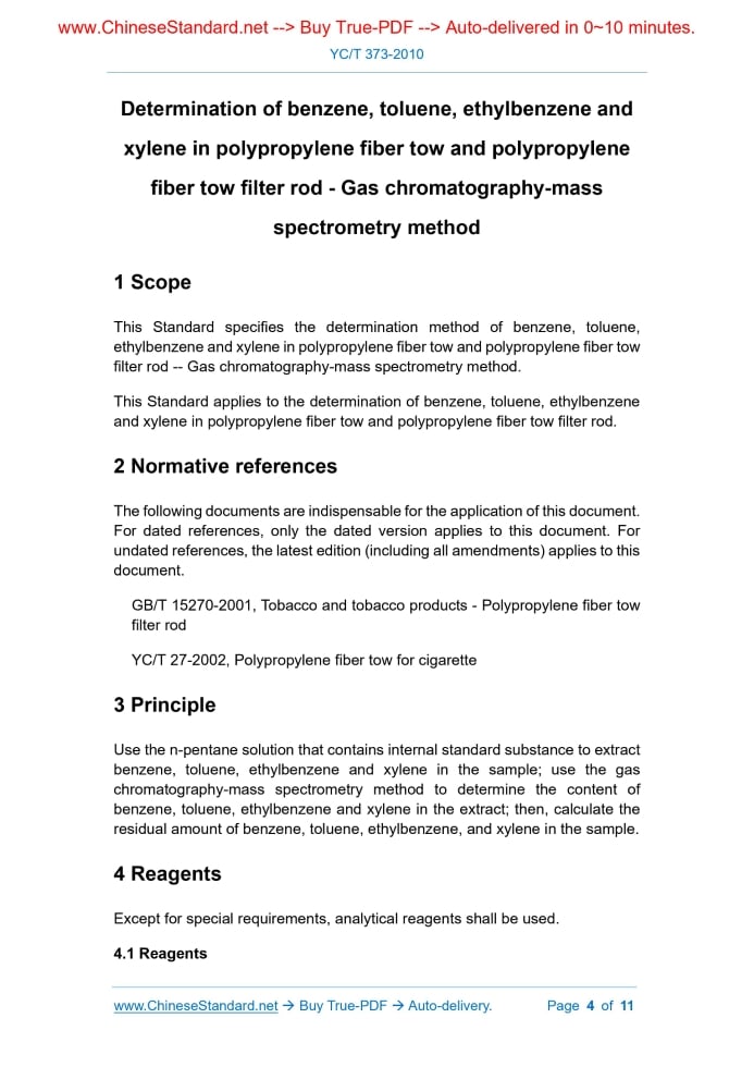 YC/T 373-2010: Determination of benzene, toluene, ethylbenzene and xylene in polypropylene fiber tow and polypropylene fiber tow filter rod - Gas chromatography-mass spectrometry method---This is an excerpt. Full copy of true-PDF in English version (including equations, symbols, images, flow-chart, tables, and figures etc.), auto-downloaded/delivered in 9 seconds, can be purchased online: https://www.ChineseStandard.net/PDF.aspx/YCT373-2010 YC TOBACCO INDUSTRY STANDARD OF THE PEOPLE’S REPUBLIC OF CHINA ICS 65.160 X 85 Record number: 30430-2011 Determination of benzene, toluene, ethylbenzene and xylene in polypropylene fiber tow and polypropylene fiber tow filter rod - Gas chromatography-mass spectrometry method ISSUED ON: DECEMBER 01, 2010 IMPLEMENTED ON: JANUARY 01, 2011 Issued by: State Tobacco Monopoly Administration Table of ContentsForeword ... 3 1 Scope ... 4 2 Normative references ... 4 3 Principle ... 4 4 Reagents ... 4 5 Instrument, equipment and conditions ... 6 6 Analysis steps ... 7 7 Calculation and expression of results ... 8 8 Recovery rate, detection limit and quantification limit ... 9 9 Test report ... 9 Appendix A (Informative) Example chromatogram ... 10 Determination of benzene, toluene, ethylbenzene and xylene in polypropylene fiber tow and polypropylene fiber tow filter rod - Gas chromatography-mass spectrometry method1 ScopeThis Standard specifies the determination method of benzene, toluene, ethylbenzene and xylene in polypropylene fiber tow and polypropylene fiber tow filter rod -- Gas chromatography-mass spectrometry method. This Standard applies to the determination of benzene, toluene, ethylbenzene and xylene in polypropylene fiber tow and polypropylene fiber tow filter rod.2 Normative referencesThe following documents are indispensable for the application of this document. For dated references, only the dated version applies to this document. For undated references, the latest edition (including all amendments) applies to this document. GB/T 15270-2001, Tobacco and tobacco products - Polypropylene fiber tow filter rod YC/T 27-2002, Polypropylene fiber tow for cigarette3 PrincipleUse the n-pentane solution that contains internal standard substance to extract benzene, toluene, ethylbenzene and xylene in the sample; use the gas chromatography-mass spectrometry method to determine the content of benzene, toluene, ethylbenzene and xylene in the extract; then, calculate the residual amount of benzene, toluene, ethylbenzene, and xylene in the sample.4 ReagentsExcept for special requirements, analytical reagents shall be used. 4.1 Reagents 4.1.1 N-hexane (C6H14), Super Pure grade or pesticide residue grade. 4.1.2 N-pentane (C5H12), chromatographic grade. 4.1.3 Benzene (C6H6), purity ≥99%. 4.1.4 Toluene (C7H8), purity ≥99%. 4.1.5 Ethylbenzene (C8H10), purity ≥99%. 4.1.6 O-xylene (o-C8H10), purity ≥99%. 4.1.7 M-xylene (m-C8H10), purity ≥99%. 4.1.8 P-xylene (p-C8H10), purity ≥99%. 4.1.9 2-hexanone (internal standard), if other substances are used as internal standard, the applicability shall be verified. 4.2 Preparation of internal standard solution 4.2.1 Internal standard stock solution: weigh 0.1 g of 2-hexanone (4.1.9) (accurate to 0.1 mg) in a 50 mL volumetric flask; use n-hexane (4.1.1) to dilute to the mark; mix well, to obtain an internal standard stock solution whose concentration is 2 mg/mL. Seal and store the internal standard stock solution in a refrigerator at 0 °C ~ 4 °C; the validity period is 3 months. 4.2.2 Internal standard solution: accurately pipette 2.5 mL of internal standard stock solution (4.2.1) into a 50 mL volumetric flask; use n-hexane (4.1.1) to dilute to the mark; mix well to obtain an internal standard solution whose concentration is 100 μg/mL. Seal and store the internal standard solution in a refrigerator at 0 °C ~ 4 °C; the validity period is 1 month. 4.3 Preparation of standard solution 4.3.1 Mixed standard stock solution: respectively weigh 0.1 g of benzene (4.1.3), toluene (4.1.4), ethylbenzene (4.1.5), o-xylene (4.1.6), m-xylene (4.1.7), p- xylene (4.1.8) (accurate to 0.1 mg) in the 100 mL volumetric flasks; use n- hexane (4.1.1) to dissolve them and dilute to the mark; mix well, to obtain the mixed standard stock solution, of which the concentration of each component is 1 mg/mL, respectively. Seal and store the mixed standard stock solution in a refrigerator at 0 °C ~ 4 °C; the validity period is 3 months. 4.3.2 Mixed standard solution: use n-hexane (4.1.1) to gradually dilute the mixed standard stock solution (4.3.1) to obtain a mixed standard solution whose concentration is 5 μg/mL. Formulate this solution when needed. Perform selective ion scanning on the standard working solution; calculate the peak area ratio of benzene, toluene, ethylbenzene, and xylene in each standard solution to the internal standard 2-hexanone; draw the standard working curve of concentration-to-peak area ratio of benzene, toluene, ethylbenzene and xylene. The standard working curve shall be straight line relationship; the correlation coefficient shall be R2 >0.99. A standard working curve shall be made for each test. After every 20 samples, add a medium-concentration standard working solution. If the measured value differs from the original value by more than 10%, the standard working curve shall be made again. 6.5 Sample determination Measure the sample solution (6.2) according to the instrument test conditions; repeat the measurement twice for each sample. At the same time, make a set of blanks for each batch of samples.7 Calculation and expression of resultsCalculate the residual amount (X) of benzene, toluene, ethylbenzene, p-xylene, m-xylene and o-xylene in the sample according to Formula (1): Where: X -- the residual amount of benzene, toluene, ethylbenzene, p-xylene, m-xylene and o-xylene in the sample, in milligrams per kilogram (mg/kg); c -- the concentration of benzene, toluene, ethylbenzene, p-xylene, meta- xylene and o-x