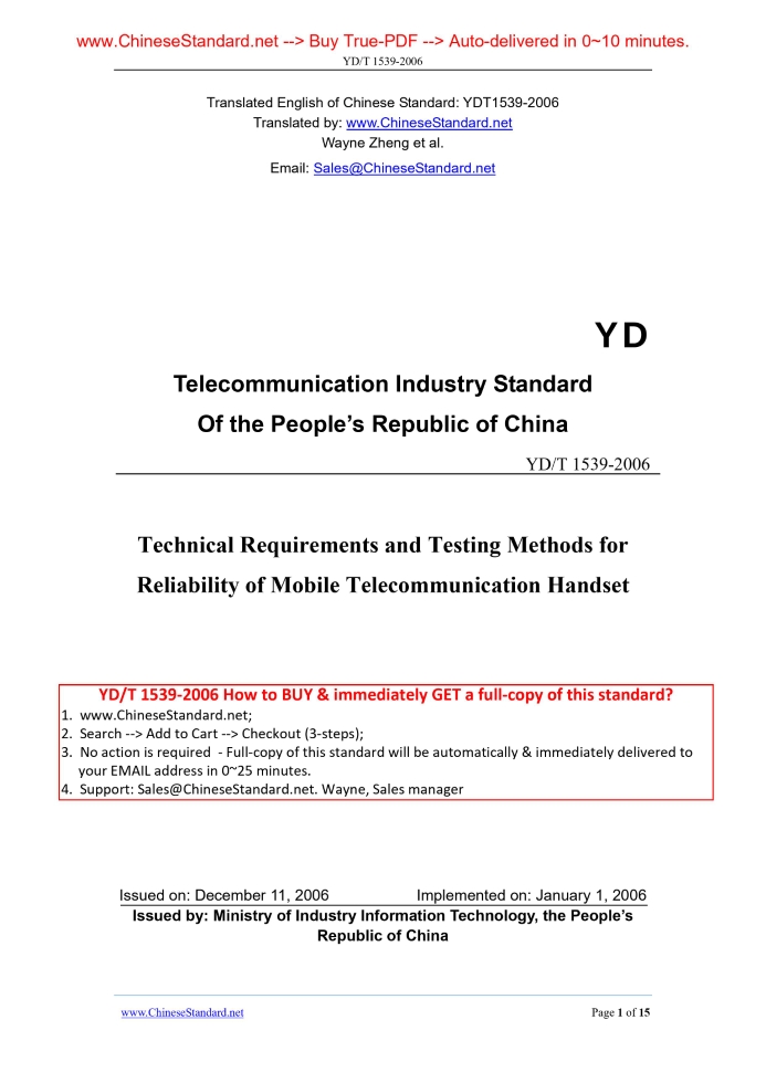 YD/T 1539-2006: Technical Requirements and Testing Methods for Reliability of Mobile Telecommunication Handset Delivery: 9 seconds. True-PDF full-copy in English & invoice will be downloaded + auto-delivered via email. See step-by-step procedure Status: Obsolete YD/T 1539: Historical versions