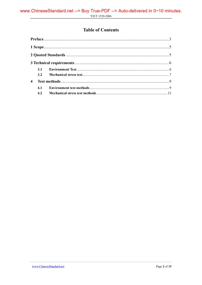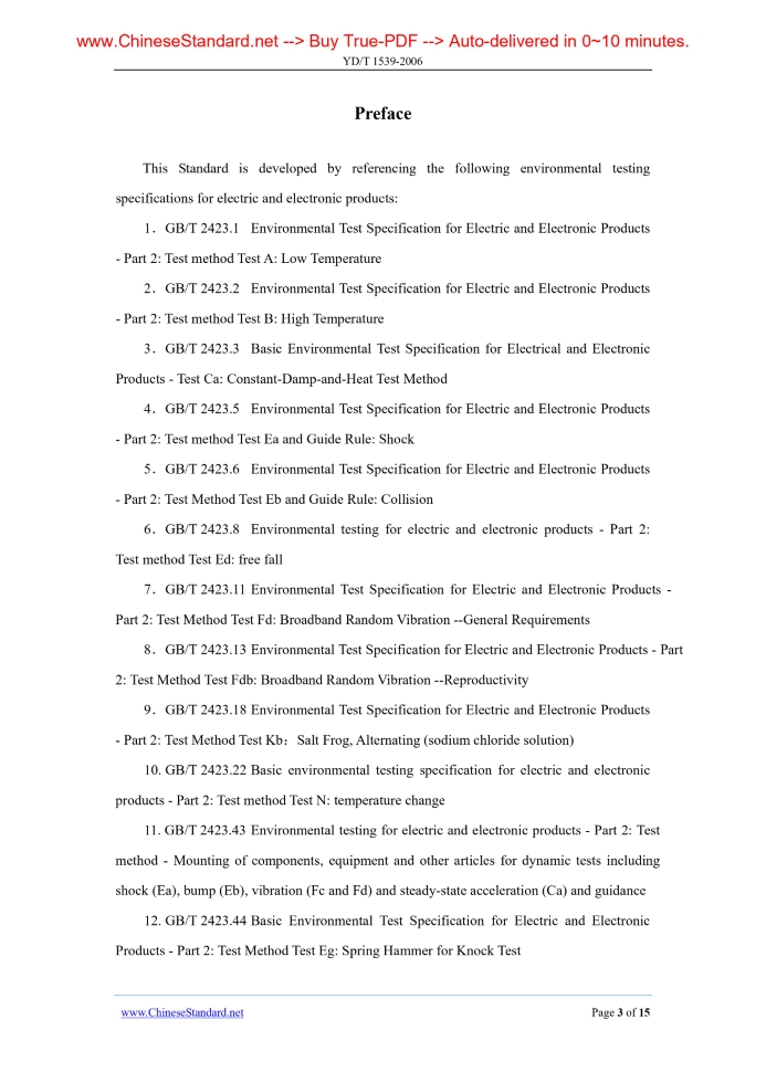 YD/T 1539-2006: Technical Requirements and Testing Methods for Reliability of Mobile Telecommunication Handset---This is an excerpt. Full copy of true-PDF in English version (including equations, symbols, images, flow-chart, tables, and figures etc.), auto-downloaded/delivered in 9 seconds, can be purchased online: https://www.ChineseStandard.net/PDF.aspx/YDT1539-2006 YD Telecommunication Industry Standard Of the People’s Republic of China Technical Requirements and Testing Methods for Reliability of Mobile Telecommunication Handset Issued on: DECEMBER 11, 2006 Implemented on: JANUARY 1, 2006 Issued by. Ministry of Industry Information Technology, the People’s Republic of China Table of ContentsPreface... 3 1 Scope... 5 2 Quoted Standards... 5 3 Technical requirements... 6 3.1 Environment Test... 6 3.2 Mechanical stress test... 7 4 Test methods... 9 4.1 Environment test methods... 9 4.2 Mechanical stress test methods... 12 Preface This Standard is developed by referencing the following environmental testing specifications for electric and electronic products. 1.GB/T 2423.1 Environmental Test Specification for Electric and Electronic Products - Part 2.Test method Test A. Low Temperature 2.GB/T 2423.2 Environmental Test Specification for Electric and Electronic Products - Part 2.Test method Test B. High Temperature 3.GB/T 2423.3 Basic Environmental Test Specification for Electrical and Electronic Products - Test Ca. Constant-Damp-and-Heat Test Method 4.GB/T 2423.5 Environmental Test Specification for Electric and Electronic Products - Part 2.Test method Test Ea and Guide Rule. Shock 5.GB/T 2423.6 Environmental Test Specification for Electric and Electronic Products - Part 2.Test Method Test Eb and Guide Rule. Collision 6.GB/T 2423.8 Environmental testing for electric and electronic products - Part 2. Test method Test Ed. free fall 7.GB/T 2423.11 Environmental Test Specification for Electric and Electronic Products - Part 2.Test Method Test Fd. Broadband Random Vibration --General Requirements 8.GB/T 2423.13 Environmental Test Specification for Electric and Electronic Products - Part 2.Test Method Test Fdb. Broadband Random Vibration --Reproductivity 9.GB/T 2423.18 Environmental Test Specification for Electric and Electronic Products - Part 2.Test Method Test Kb. Salt Frog, Alternating (sodium chloride solution) 10.GB/T 2423.22 Basic environmental testing specification for electric and electronic products - Part 2.Test method Test N. temperature change 11.GB/T 2423.43 Environmental testing for electric and electronic products - Part 2.Test method - Mounting of components, equipment and other articles for dynamic tests including shock (Ea), bump (Eb), vibration (Fc and Fd) and steady-state acceleration (Ca) and guidance 12.GB/T 2423.44 Basic Environmental Test Specification for Electric and Electronic Products - Part 2.Test Method Test Eg. Spring Hammer for Knock Test This Standard is the definition of the reliability for China Mobile Communication Handset. If the reliability-related contents in the original published specification are different from that in this specification, all are based on this Standard. This Standard is proposed and managed by China Communications Standards Association (CCSA). This Standard is drafted by. China MIIT Telecommunication Institute. This Standard is written by. Yuan Weijun and He Guili. Technical Requirement and Test Method for Reliability of Mobile Telecommunication Handset1 ScopeThis Standard defines the technical requirements and test methods for the adaptability of the environment and mechanical stress for mobile telecommunication handsets. It is applicable for mobile telecommunication handset and it is also the reference for other mobile telecommunication terminals in addition to the handset.2 Quoted StandardsThe following standards contribute the stipulations of this Standard after being quoted. All the revision versions (excluding correction version) of the quoted standards specified with date are not applicable for the document. Users are encouraged to explore the possibility to use the latest version of the following standards. The latest versions of the quoted documents without date specified are applicable to the standard. GB/T 2421 Environmental Test Specification for Electrical and Electronic Products Part 1.General GB/T 2423.1 Environmental Test Specification for Electric and Electronic Products - Part 2.Test method Test A. Low Temperature GB/T 2423.2 Environmental Test Specification for Electric and Electronic Products - Part 2.Test method Test B. High Temperature GB/T 2423.3 Basic Environmental Test Specification for Electrical and Electronic Products - Test Ca. Constant-Damp-and-Heat Test Method GB/T 2423.5 Environmental Test Specification for Electric and Electronic Products - Part 2.Test method Test Ea and Guide Rule. Shock GB/T 2423.6 Environmental Test Specification for Electric and Electronic Products - Part 2.Test Method Test Eb and Guide Rule. Collision GB/T 2423.8 Environmental testing for electric and electronic products - Part 2.Test method Test Ed. free fall GB/T 2423.11 Environmental Test Specification for Electric and Electronic Products - Part 2. Test Method Test Fd. Broadband Random Vibration - General Requirements GB/T 2423.13 Environmental Test Specification for Electric and Electronic Products - Part 2. Test Method Test Fdb. Broadband Random Vibration - Reproductivity GB/T 2423.18 Environmental Test Specification for Electric and Electronic Products - Part 2.Test Method Test Kb. Salt Frog, Alternating (sodium chloride solution) GB/T2423.22 Environmental Test Specification for Electric and Electronic Products - Part 2.Test Method Test N. temperature change GB/T 2423.43 Environmental testing for electric and electronic products - Part 2.Test method - Mounting of components, equipment and other articles for dynamic tests including shock (Ea), bump (Eb), vibration (Fc and Fd) and steady-state acceleration (Ca) and guidance