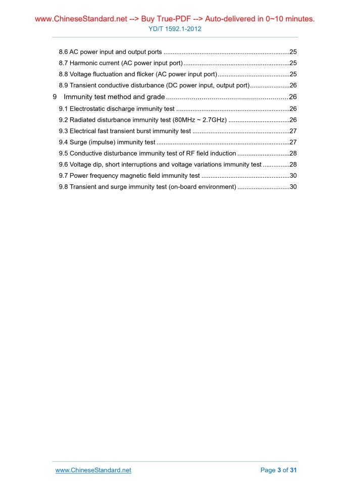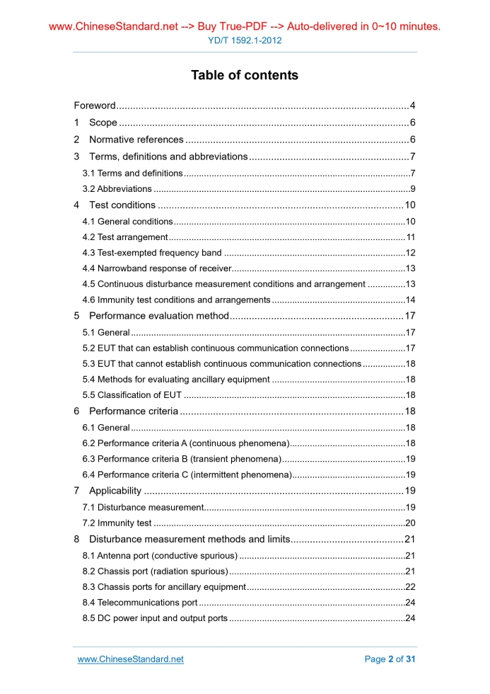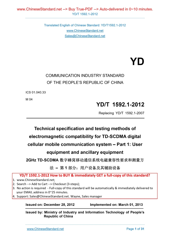Similar standardsYD/T 1592.1-2012: Technical specification and testing methods of electromagnetic compatibility for TD-SCDMA digital cellular mobile communication system - Part 1: User equipment and ancillary equipment---This is an excerpt. Full copy of true-PDF in English version (including equations, symbols, images, flow-chart, tables, and figures etc.), auto-downloaded/delivered in 9 seconds, can be purchased online: https://www.ChineseStandard.net/PDF.aspx/YDT1592.1-2012 YD COMMUNICATION INDUSTRY STANDARD ICS 01.040.33 M 04 Replacing YD/T 1592.1-2007 Technical specification and testing methods of electromagnetic compatibility for TD-SCDMA digital cellular mobile communication system – Part 1.User equipment and ancillary equipment Issued on. DECEMBER 28, 2012 Implemented on. MARCH 01, 2013 Issued by. Ministry of Industry and Information Technology of People’s Republic of China Table of ContentsForeword... 4 1 Scope... 6 2 Normative references... 6 3 Terms, definitions and abbreviations... 7 4 Test conditions... 10 5 Performance evaluation method... 17 6 Performance criteria... 18 7 Applicability... 19 8 Disturbance measurement methods and limits... 21 9 Immunity test method and grade... 261 ScopeThis part specifies the electromagnetic compatibility (EMC) requirements for user equipment and ancillary equipment for the 2GHz TD-SCDMA digital cellular mobile communication system, including limits, performance criteria, and measurement methods, etc. This part is applicable to the user equipment and the ancillary equipment for the 2GHz TD-SCDMA digital cellular mobile communication system.2 Normative referencesThe following documents are essential to the application of this document. For the dated documents, only the versions with the dates indicated are applicable to this document; for the undated documents, only the latest version (including all the amendments) are applicable to this Standard. GB/T 6113.104 Specification for radio disturbance and immunity measuring apparatus and methods – Part 1-4.Radio disturbance and immunity measuring apparatus – Ancillary equipment – Radiated disturbance GB 9254 Information technology equipment – Radio disturbance characteristics – Limits and methods of measurement GB 17625.1 Electromagnetic compatibility – Limits – Limits for harmonic current emissions (equipment input current ≤ 16A per phase) GB 17625.2 Electromagnetic compatibility (EMC) – Limits – Limitation of voltage changes, voltage fluctuations and flicker in public low-voltage supply systems, for equipment with rated current limits ≤ 16A per phase and not subject to conditional connection3 Terms, definitions and abbreviations3.1 Terms and definitions The following terms and definitions apply to this document. 3.1.1 Block error rate The block error rate, the calculation of which shall be based on the estimation of the cyclic redundancy verification for each transmission block. 3.1.4 Ancillary equipment It refers to the equipment (device) connected to the receiver, transmitter or transceiver, AND the following conditions are met simultaneously. 3.1.5 Fixed station It refers to the UE which is used at a fixed position AND is powered by AC power source. 3.1.6 Idle mode It refers to a working mode of the UE receiver or transceiver. In this mode, the equipment under test (EUT) is powered up to provide service AND is able to respond to the requirements for establishing a call. 3.1.7 Traffic mode It refers to a working mode of the UE receiver or transceiver. In this mode, the equipment under test (EUT) is powered up AND establishes a communication link with the radio resource controller. 3.1.8 Spurious emissions It refers to the disturbance on the discrete frequency other than the carrier frequency and the normal modulation related side band. It can be divided into conduction and radiation. 3.1.9 Load dump When alternator produces charging current normally, the charging battery is disconnected from the alternator, and there are still other loads connected to the alternator circuit. 3.2 Abbreviations The following abbreviations apply to this document.4 Test conditions4.1 General conditions The EUT shall be tested in a normal test environment. The test conditions shall be recorded in the report. 4.2 Test arrangement 4.2.1 Transmitter input end test arrangement Appropriate normal modulation signal is produced through the internal or external signal source AND is sent into the input port of the transmitter. The external signal source shall be located outside the test environment. SS shall ensure continuous EUT emission. 4.2.3 Receiver input end test arrangement SS shall be placed outside the test environment. The frequency of the available RF input signal for providing the communication link is selected by setting the correct UTRA ARFCN. Unless the other clauses of this part have special requirements, the test shall select the UTRA ARFCN corresponding to the center frequency of the operating frequency band. 4.2.4 Receiver output end test arrangement For audio equipment, the audio output of the receiver shall be connected to an audio distortion analyzer or other similar measurement instrument located outside the test environment via a nonconductive acoustic tube. For those which cannot use the nonconductive acoustic tubes, it may use other methods to connect the output of the receiver to an audio distortion analyzer or other similar measurement instrument, AND it shall be recorded in the test report. 4.3 Test-exempted frequency band The test-exempted frequency band is the frequency band that does not subjected to the radiation immunity test. The ancillary equipment does not have the test-exempted frequency band. 4.4 Narrowband response of receiver The narrowband response generated by the receiver and the transceiver during the discrete frequency test is determined by the following method. In the immunity test, it shall monitor the BLER and speech output signal level. Both narrow