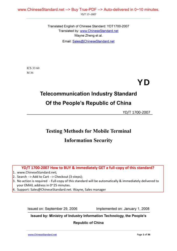 YD/T 1700-2007: Testing Methods for Mobile Terminal Information Security Delivery: 9 seconds. True-PDF full-copy in English & invoice will be downloaded + auto-delivered via email. See step-by-step procedure