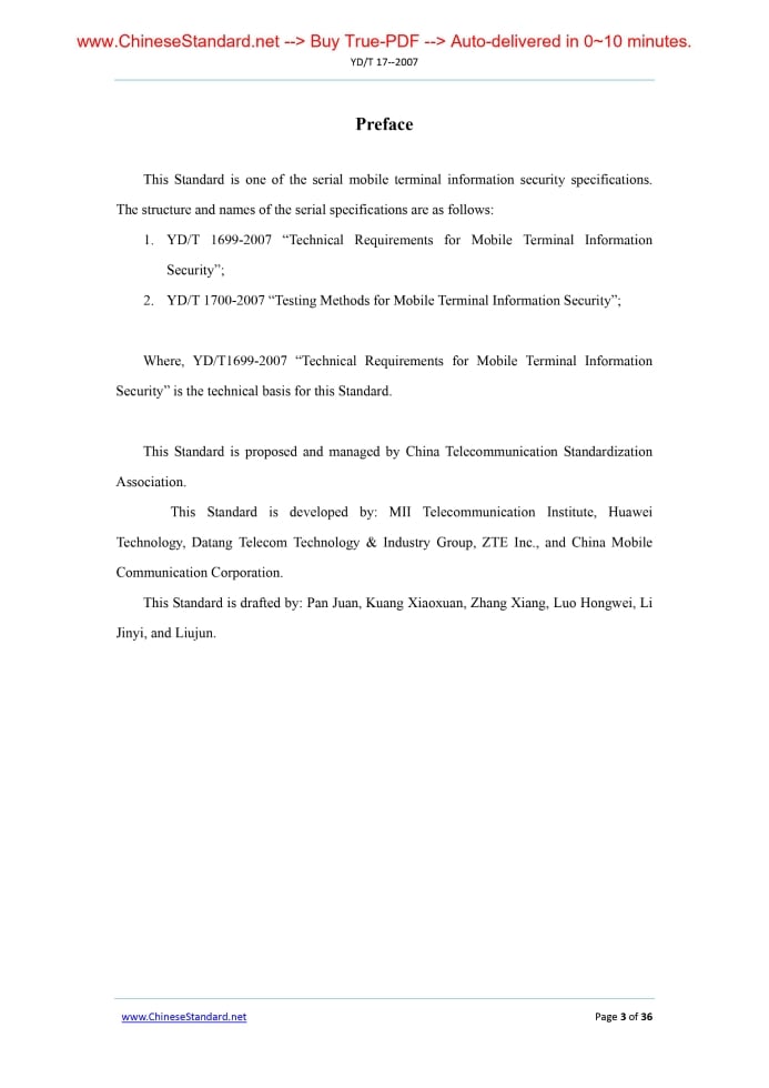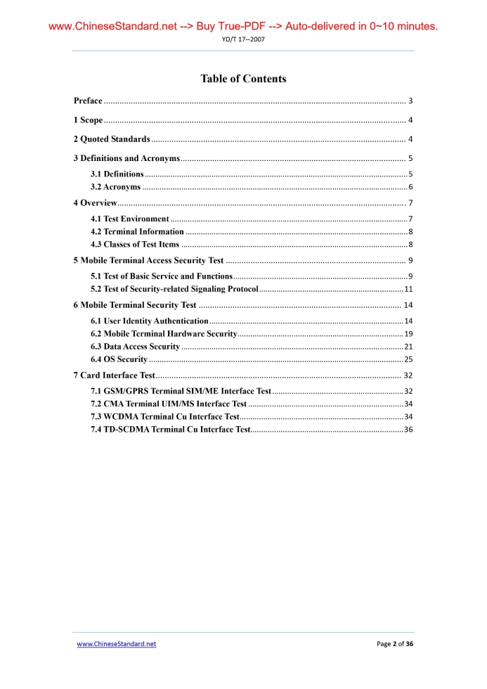 Similar standardsYD/T 1700-2007: Testing Methods for Mobile Terminal Information Security---This is an excerpt. Full copy of true-PDF in English version (including equations, symbols, images, flow-chart, tables, and figures etc.), auto-downloaded/delivered in 9 seconds, can be purchased online: https://www.ChineseStandard.net/PDF.aspx/YDT1700-2007ICS 33 60 M 36 YD Telecommunication Industry Standard Of the People’s Republic of China YD/T 1700‐2007 Testing Methods for Mobile Terminal Information Security Issued on: SEPTEMBER 29, 2006 Implemented on: JANUARY 1, 2008 Issued by. Ministry of Industry Information Technology, the People’s Republic of China Table of ContentsPreface... 3 1 Scope... 4 2 Quoted Standards... 4 3 Definitions and Acronyms... 5 3.1 Definitions... 5 3.2 Acronyms... 6 4 Overview... 7 4.1 Test Environment... 7 4.2 Terminal Information... 8 4.3 Classes of Test Items... 8 5 Mobile Terminal Access Security Test... 9 5.1 Test of Basic Service and Functions... 9 5.2 Test of Security-related Signaling Protocol... 11 6 Mobile Terminal Security Test... 14 6.1 User Identity Authentication... 14 6.2 Mobile Terminal Hardware Security... 19 6.3 Data Access Security... 21 6.4 OS Security... 25 7 Card Interface Test... 32 7.1 GSM/GPRS Terminal SIM/ME Interface Test... 32 7.2 CMA Terminal UIM/MS Interface Test... 34 7.3 WCDMA Terminal Cu Interface Test... 34 7.4 TD-SCDMA Terminal Cu Interface Test... 36 Preface This Standard is one of the serial mobile terminal information security specifications. The structure and names of the serial specifications are as follows. 1.YD/T 1699-2007 “Technical Requirements for Mobile Terminal Information Security”; 2.YD/T 1700-2007 “Testing Methods for Mobile Terminal Information Security”; Where, YD/T1699-2007 “Technical Requirements for Mobile Terminal Information Security” is the technical basis for this Standard. This Standard is proposed and managed by China Telecommunication Standardization Association. This Standard is developed by. MII Telecommunication Institute, Huawei Technology, Datang Telecom Technology & Industry Group, ZTE Inc., and China Mobile Communication Corporation. This Standard is drafted by. Pan Juan, Kuang Xiaoxuan, Zhang Xiang, Luo Hongwei, Li Jinyi, and Liujun. Testing Methods for Mobile Terminal Information Security1 ScopeThis Standard specifies testing methods for mobile terminal information security, including the testing methods for terminal hardware security, terminal software security, and OS application security, as well as the testing methods for mobile terminal access security and information transfer security, mobile terminal personal information confidentiality security etc. This Standard applies to terminal equipment in the second generation mobile communication network and above. This Standard does not specify testing requirements related to EMC, EMI or electrical security.2 Quoted StandardsThe following standards constitute stipulations of this Standard after quoted. All the revision versions (excluding correction version) of the quoted standards specified with date are not applicable for the document. Constituents are encouraged to use the latest version of the documents. The latest version of the quoted documents without date specified is applicable for this specification. YD/T 1215-2006 Testing Methods of 900/1800MHz TDMA Digital Cellular Mobile Telecommunication Network General Packet Radio Service (GPRS) Equipment. Mobile Stations YD/T 1683-2007 Testing Methods for CDMA Digital Cellular Mobile Communication Network ME-UIM Card Interface; 3GPP TS 01.61 General Packet Radio Service (GPRS). GPRS Algorithm Requirements 3GPP TS 31.121 UICC-Terminal Interface; USIM Application Testing Specification 3GPP TS 31.124 ME Consistency Test Specification; USAT Consistency Test Specification 3GPP TS 34.123-1 UE Consistency Test Specification. Part I Protocol Consistency Test Specification 3GPP TS 51.010-1 GSM/EDGE Radio Access Network Digital Cellular Communication System (Phase 2);MS Consistency Test Specification. Part I Consistency Test Specification 3GPP TS 51.010-4 MS Consistency Test Specification. Part IV SIM Application Toolkit Consistency Test Specification 3GPP2 C.S0038-A HRPD Air Interface Signaling Consistency Test Specification 3GPP2 C.S0043-0 cdma200 Spread Spectrum System Signaling Consistency Test Specification ETSI TS 102 230 Smart Card; UICC-Terminal Interface; Physical, Electrical and Logical Performance Test3 Definitions and Acronyms3.1 Definitions The following definitions apply for this Standard. Subscription Identification Management The management process that the mobile terminal can check whether the user is legitimate to take appropriate measures at any time. Application File groups or programs on the telecom smart card that are used to realize services. Network Simulator Simulators necessary for network system environment, such as WCDMA and GSM network simulators. File Collection of information with logically full significance, which is identified with one name; File System Collection of software that manages the mobile terminal software resources in the way of software in OS, managed files and data structures; User Authentication Testing process on the validity of the user identity. Authorization Process to grant the user with appropriate permission based on predefined security policy after user authentication. Authorized User User who can execute certain operation based on security strategy. It may correspond to any defined role in this Standard based on varied operation practices. Operation System The most basic system software of mobile terminal, which controls and manages various hardware and software resources of the mobile terminal and provides the interface for application development; Telecom Smart Card Telecom Smart Card is a portable and tamper resistant device that is embedded with microprocessor. It is used to store data (such as access code, user information, keys a