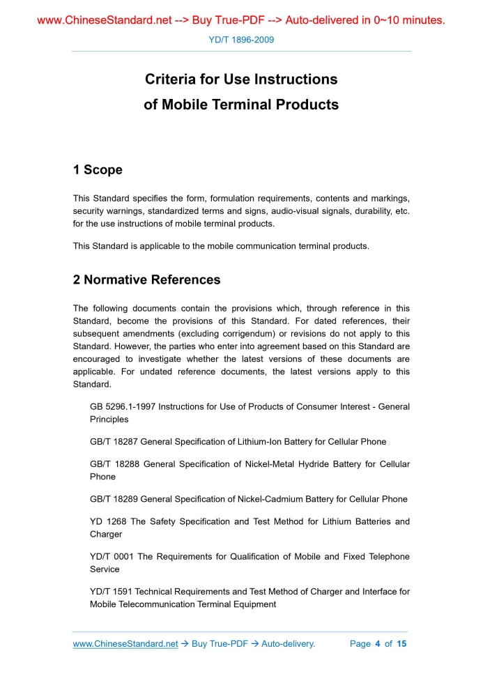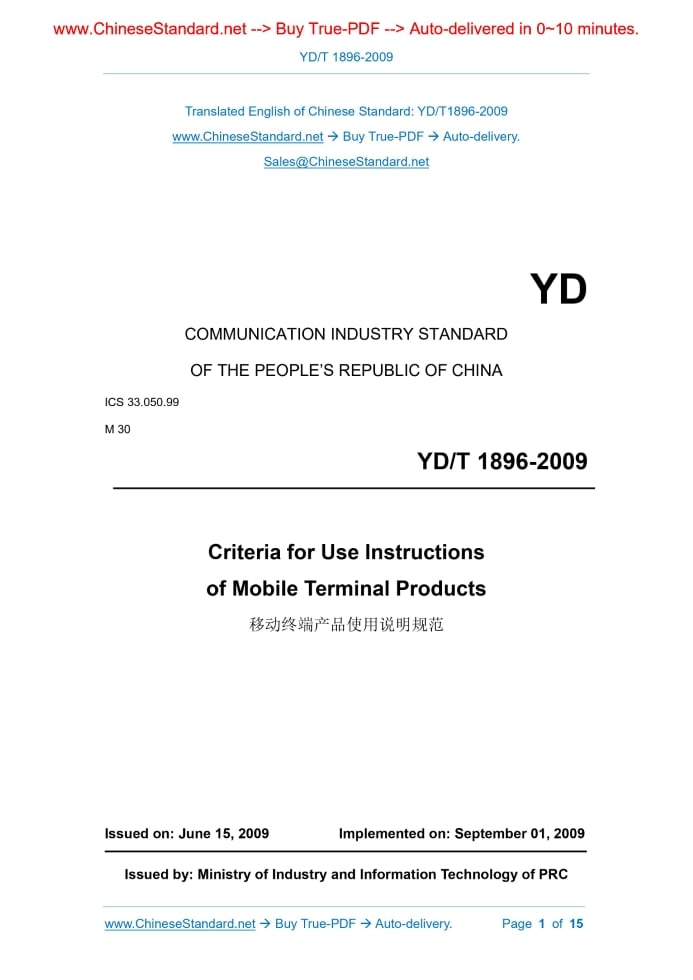 YD/T 1896-2009: Criteria for Use Instructions of Mobile Terminal Products Delivery: 9 seconds. True-PDF full-copy in English & invoice will be downloaded + auto-delivered via email. See step-by-step procedure