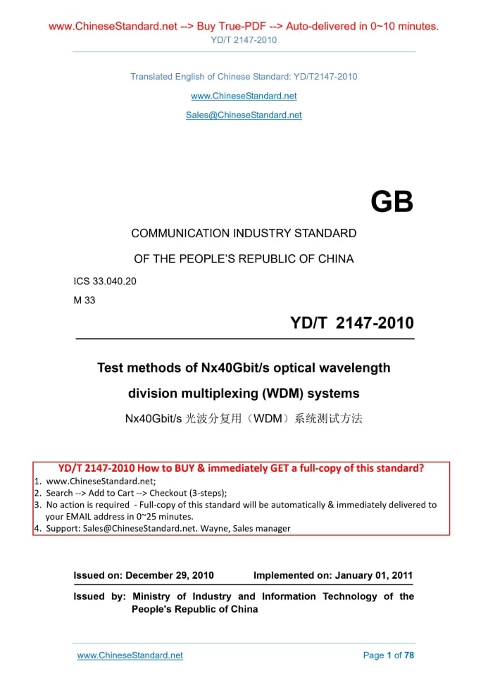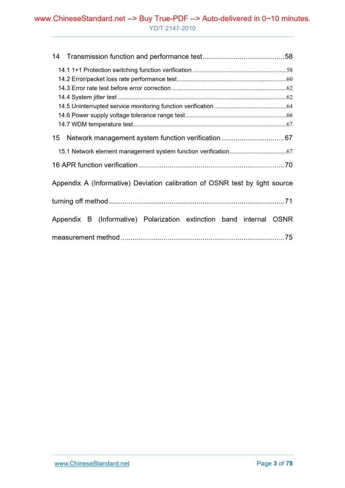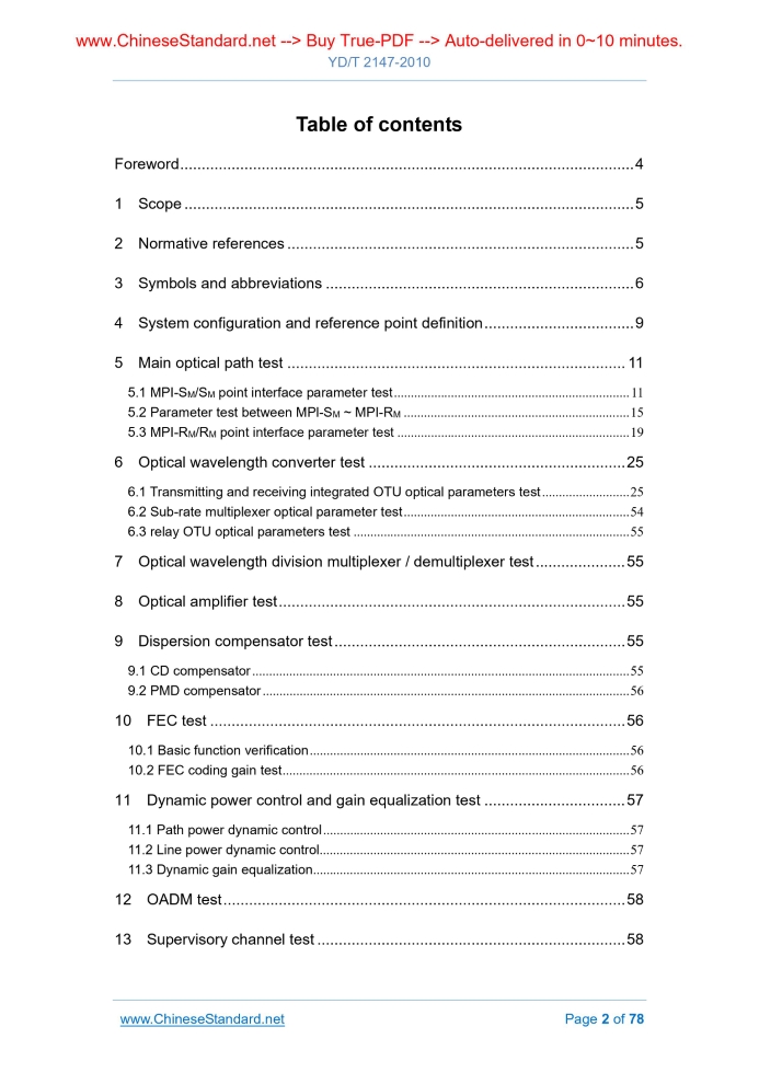 Similar standardsYD/T 2147-2010: Test methods of Nx40Gbit/s optical wavelength division multiplexing (WDM) systems---This is an excerpt. Full copy of true-PDF in English version (including equations, symbols, images, flow-chart, tables, and figures etc.), auto-downloaded/delivered in 9 seconds, can be purchased online: https://www.ChineseStandard.net/PDF.aspx/YDT2147-2010 GB COMMUNICATION INDUSTRY STANDARD ICS 33.040.20 M 33 Test methods of Nx40Gbit/s optical wavelength division multiplexing (WDM) systems Issued on. DECEMBER 29, 2010 Implemented on. JANUARY 01, 2011 Issued by. Ministry of Industry and Information Technology of the People's Republic of China Table of ContentsForeword... 4 1 Scope... 5 2 Normative references... 5 3 Symbols and abbreviations... 6 4 System configuration and reference point definition... 9 5 Main optical path test... 11 6 Optical wavelength converter test... 25 7 Optical wavelength division multiplexer / demultiplexer test... 55 8 Optical amplifier test... 55 9 Dispersion compensator test... 55 10 FEC test... 56 11 Dynamic power control and gain equalization test... 57 12 OADM test... 58 13 Supervisory channel test... 58 14 Transmission function and performance test... 58 15 Network management system function verification... 67 16 APR function verification... 70 Appendix A (Informative) Deviation calibration of OSNR test by light source turning off method... 71 Appendix B (Informative) Polarization extinction band internal OSNR measurement method... 751 ScopeThis standard specifies the test methods of the open N×40Gbit/s optical wavelength division multiplexing (WDM) system, including. system configuration and reference point definition, main optical channel test, optical wavelength converter test, optical wavelength division multiplexer/demultiplexer test, optical amplifier test, dispersion compensator test, FEC test, dynamic power control and gain equalization test, OADM test, monitoring channel test, transmission function and performance test, network management system function verification, APR function verification and so on. This standard is applicable to the open Nx40Gbit/s optical wavelength division multiplexing (WDM) system. The integrated Nx40Gbit/s optical wavelength division multiplexing (WDM) systems and Nx10Gbit/s optical wavelength division multiplexing (WDM) systems using non-NRZ code patterns may also make reference with this standard.2 Normative referencesThe provisions in following documents become the provisions of this Standard through reference in this Standard. For the dated references, the subsequent amendments (excluding corrections) or revisions do not apply to this Standard; however, parties who reach an agreement based on this Standard are encouraged to study if the latest versions of these documents are applicable. For undated references, the latest edition of the referenced document applies. GB/T 20440-2006 Technical requirements of dense wavelength division multiplexer/demultiplexer YD/T 1159-2001 Test methods of optical wavelength division multiplexing (WDM) system YD/T 1259-2003 Technical specification for optical safe procedure for wavelength division multiplexing (WDM) system YD/T 1339-2005 Test methods of metropolitan optical transport network WDM ring YD/T 1383-2005 Technical requirements for WDM element management system3 Symbols and abbreviationsThe following symbols and abbreviations apply to this standard. AIS. Alarm Indication Signal APR. Automatic Power Reduction ASE. Amplified Spontaneous Emission BBE. Background Block Error4 System configuration and reference point definitionThe reference configuration of the Nx40Gbit/s WDM system is as shown in Figure 1, wherein the OTU is the optical wavelength converter to achieve 3R function, that is, re-amplification, re-shaping and re-timing; the OMU is the optical multiplexer unit to achieve multiple wavelength multiplexing function;5 Main optical path test5.1 MPI-SM/SM point interface parameter test 5.1.1 MPI-SM/SM output power per path 5.1.1.4 Precautions It shall pay attention to the following matters during the test. 5.1.2 MPl-SM Maximum path power difference 5.1.2.1 Definitions It refers to the difference between the maximum value and the minimum value of the average transmitted optical power of all paths at the reference point MPI-SM at a given light resolution at the same time. 5.1.2.2 Test configuration The test configuration is as shown in Figure 2.Test instrument is the spectrum analyzer. 5.1.3.3 Test procedure FOLLOW the procedures below to conduct test. a) CONNECT the test configuration as shown in Figure 3; SET the operating range of the power meter at 1550nm window; b) After the reading of the optical power meter is stable, READ out and RECORD the power value. 5.1.3.4 Precautions It shall pay attention to the following matters during the test. 5.1.4 MPI-SM/SM optical signal to noise ratio 5.1.4.1 Definitions It refers to the ratio between the signal optical power and the ASE noise power in each path at the reference point MPI-SM/SM, wherein the ASE noise power reference bandwidth is generally selected as 0.1nm. 5.1.4.2 Test Configuration The test configuration is as shown in Figure 3.Test instrument is the spectrum analyzer. 5.2 Parameter test between MPl-SM ~ MPI-RM 5.2.1 MPl-SM ~ MPI-RM residual dispersion 5.2.1.1 Definitions It refers to the chromatic dispersion value between the reference point MPl-SM and MPl-RM. 5.2.1.2 Test configuration The test configuration is as shown in Figure 4.The test instrument is a modulated broad spectrum light source and a CD analyzer.6 Optical wavelength converter test6.1 Transmitting and receiving integrated OTU optical parameters test 6.1.1 Transmitting end interface parameter test 6.1.1.1 Receiver sensitivity 6.1.1.1.4 FOLLOW the procedures below to conduct test. 6.1.1.1.5 Precautions 6.1.1.1.6 It shall pay attention to the following matters during the test. 6.1.1.2.5 Precautions In addition to the matters noted in Claus