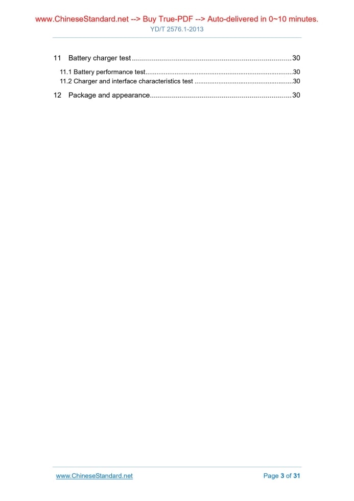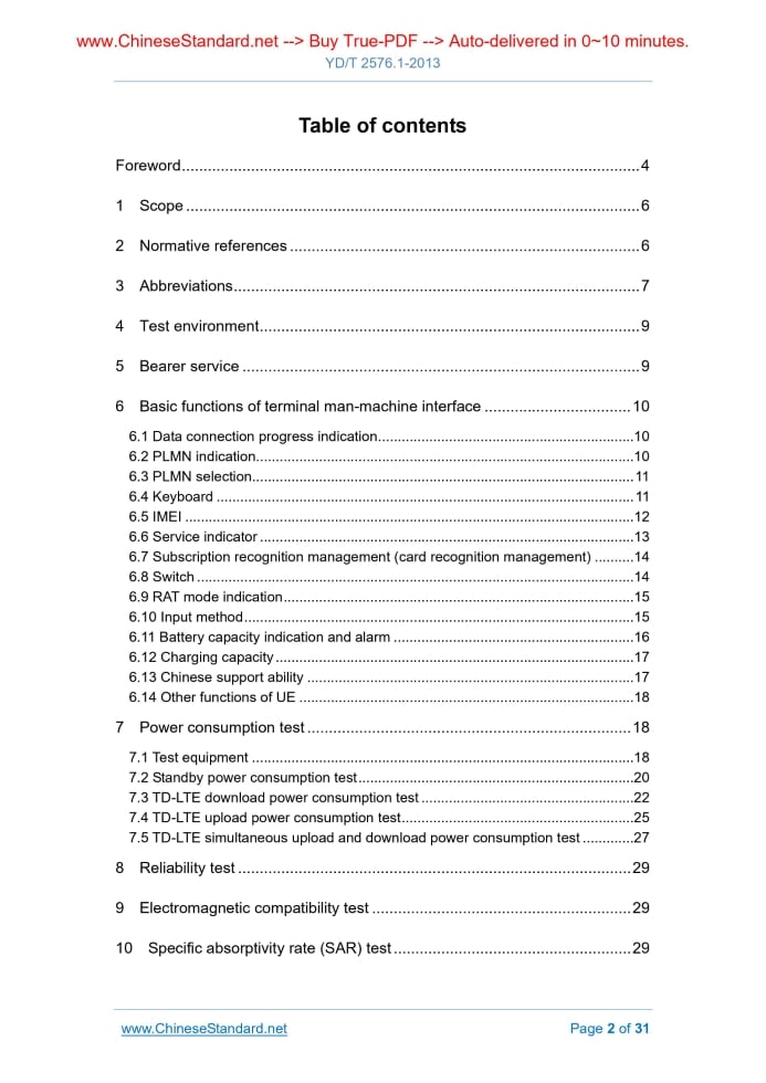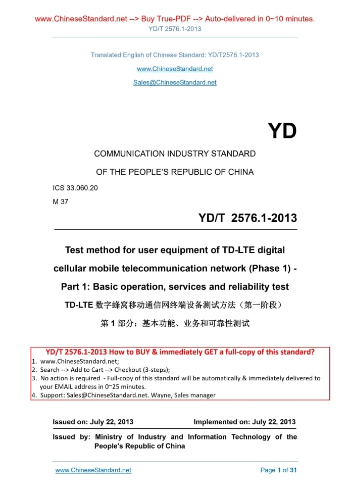 Similar standardsYD/T 2576.1-2013: Test method for user equipment of TD-LTE digital cellular mobile telecommunication network (Phase 1) - Part 1: Basic operation, services and reliability test---This is an excerpt. Full copy of true-PDF in English version (including equations, symbols, images, flow-chart, tables, and figures etc.), auto-downloaded/delivered in 9 seconds, can be purchased online: https://www.ChineseStandard.net/PDF.aspx/YDT2576.1-2013 YD COMMUNICATION INDUSTRY STANDARD OF THE PEOPLE’S REPUBLIC OF CHINA ICS 33.060.20 M 37 Test method for user equipment of TD-LTE digital cellular mobile telecommunication network (Phase 1) - Part 1. Basic operation, services and reliability test Issued on: JULY 22, 2013 Implemented on: JULY 22, 2013 Issued by. Ministry of Industry and Information Technology of the People's Republic of China Table of ContentsForeword ... 4 1 Scope ... 6 2 Normative references ... 6 3 Abbreviations ... 7 4 Test environment ... 9 5 Bearer service ... 9 6 Basic functions of terminal man-machine interface ... 10 6.1 Data connection progress indication ... 10 6.2 PLMN indication ... 10 6.3 PLMN selection ... 11 6.4 Keyboard ... 11 6.5 IMEI ... 12 6.6 Service indicator ... 13 6.7 Subscription recognition management (card recognition management) ... 14 6.8 Switch ... 14 6.9 RAT mode indication ... 15 6.10 Input method ... 15 6.11 Battery capacity indication and alarm ... 16 6.12 Charging capacity ... 17 6.13 Chinese support ability ... 17 6.14 Other functions of UE ... 18 7 Power consumption test ... 18 7.1 Test equipment ... 18 7.2 Standby power consumption test ... 20 7.3 TD-LTE download power consumption test ... 22 7.4 TD-LTE upload power consumption test ... 25 7.5 TD-LTE simultaneous upload and download power consumption test ... 27 8 Reliability test ... 29 9 Electromagnetic compatibility test ... 29 10 Specific absorptivity rate (SAR) test ... 29 11 Battery charger test ... 30 11.1 Battery performance test ... 30 11.2 Charger and interface characteristics test ... 30 12 Package and appearance... 30ForewordThis part is one of the standard series of user equipment of TD-LTE digital cellular mobile telecommunication network (phase 1), AND the name and structure of this standard series are as follows. a) YD/T 2575.1-2013 “Technical requirements for user equipment of TD-LTE digital cellular mobile telecommunication network (phase 1)”; b) YD/T 2575.6-2013 “Test method for user equipment of TD-LTE digital cellular mobile telecommunication network (phase 1)”; - Part 1. Basic operation, services and reliability test; - Part 2. Radio transmission and reception performance test; - Part 3. Radio resource management performance test; - Part 4. Protocol conformance test; - Part 5. Network compatibility test. YD/T 2576-2013 “Test method for user equipment of TD-LTE digital cellular mobile telecommunication network (phase 1)” is divided into 5 parts. - Part 1. Basic operation, services and reliability test; - Part 2. Radio transmission and reception performance test; - Part 3. Radio resource management performance test; - Part 4. Protocol conformance test; - Part 5. Network compatibility test. This part is part 1 of the YD/T 2576-2013 “Test method for user equipment of TD-LTE digital cellular mobile telecommunication network (phase 1)”. With the development of technology, it will also develop follow-up standards. This part was drafted in accordance with the rules given in GB/T 1.1-2009. This part was proposed by AND shall be under the jurisdiction of the China Communications Standardization Association. Test method for user equipment of TD-LTE digital cellular mobile telecommunication network (Phase 1) - Part 1. Basic operation, services and reliability test1 ScopeThis part specifies the functional requirements, power requirements, reliability requirements, electromagnetic compatibility requirements, specific absorptivity requirements, and battery and charger requirements for the data service of the TD-LTE digital cellular mobile telecommunication network user equipment (UE). This part applies to all TD-LTE digital cellular mobile telecommunication network user equipment (phase 1).2 Normative referencesThe following documents are essential to the application of this document. For the dated documents, only the versions with the dates indicated are applicable to this document; for the undated documents, only the latest version (including all the amendments) are applicable to this Standard. GB 2312-1980 Code of Chinese graphic character set for information interchange; Primary set GB/T 18287 General specification of lithium-ion battery for cellular phone GB/T 18288 General specification of nickel-metal battery for cellular phone GB/T 18289 General specification of nickel-cadmium battery for cellular phone YD 1268.1 Safety requirements and test methods for lithium battery for mobile communication handset YD 1268.2 Safety requirements and test methods for lithium battery charger for mobile communication handset EARFCN. E-UTRA absolute radio frequency channel number EPRE. Energy per resource element HARQ. Hybrid automatic repeat request IMEI. International mobile equipment identity OCNG. OFDMA channel noise generator OFDMA. Orthogonal frequency division multiplex access PBCDMA. Physical broadcast channel PCFICH. Physical control format indicator channel PDCCH. Physical downlink control channel PDSCH. Physical downlink shared channel PHICH. Physical hybrid-ARQ indicator channel PLMN. Public land mobile network PRB. Physical resource block P-RNTI. Paging radio network temporary identifier PSS. Primary synchronization signal QPSK. Quadrature phase-shift keying RAT. Radio access technology RB. Resource block RE. Resource element ROHC. Robust header compression RS. Reference symbol RSRP. Reference signal receiving power SRS. Sounding reference signal SSS. Secondary synchronization signal TAU. Tracking area update a) INSERT the USIM card into the UE and TURN it on; b)