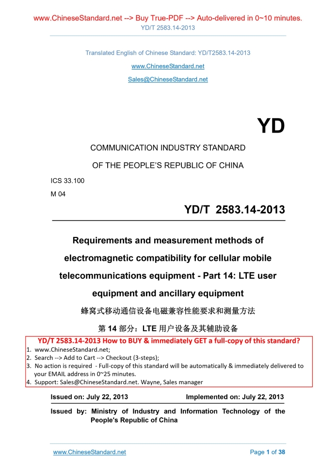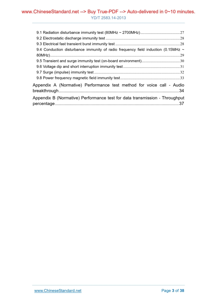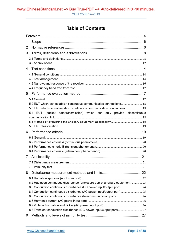 Similar standardsYD/T 2583.14-2013: Requirements and measurement methods of electromagnetic compatibility for cellular mobile telecommunications equipment. Part 14: LTE user equipment and ancillary equipment---This is an excerpt. Full copy of true-PDF in English version (including equations, symbols, images, flow-chart, tables, and figures etc.), auto-downloaded/delivered in 9 seconds, can be purchased online: https://www.ChineseStandard.net/PDF.aspx/YDT2583.14-2013 YD COMMUNICATION INDUSTRY STANDARD ICS 33.100 M 04 Requirements and measurement methods of electromagnetic compatibility for cellular mobile telecommunications equipment - Part 14.LTE user equipment and ancillary equipment Issued on. JULY 22, 2013 Implemented on. JULY 22, 2013 Issued by. Ministry of Industry and Information Technology of the People's Republic of China Table of ContentsForeword... 4 1 Scope... 6 2 Normative references... 6 3 Terms, definitions and abbreviations... 8 4 Test conditions... 14 5 Performance evaluation method... 17 6 Performance criteria... 19 7 Applicability... 21 8 Disturbance measurement methods and limits... 22 9 Methods and levels of immunity test... 27 Appendix A (Normative) Performance test method for voice call - Audio breakthrough... 34 Appendix B (Normative) Performance test for data transmission - Throughput percentage... 37ForewordThis part is part 14 of the standard series of “Requirements and measurement methods of electromagnetic compatibility for cellular mobile telecommunications equipment”. AND this standard series include the following parts. Requirements and measurement methods of electromagnetic compatibility for cellular mobile telecommunications equipment - Part 1.General requirements for base stations and ancillary equipment Requirements and measurement methods of electromagnetic compatibility for cellular mobile telecommunications equipment - Part 2.General requirements for user equipment and ancillary equipment Requirements and measurement methods of electromagnetic compatibility for cellular mobile telecommunications equipment - Part 3.Multi-system base stations and ancillary equipment Requirements and measurement methods of electromagnetic compatibility for cellular mobile telecommunications equipment - Part 4.Multimode terminals and ancillary equipment Requirements and measurement methods of electromagnetic compatibility for cellular mobile telecommunications equipment - Part 5.900/1800MHz TDMA base station and ancillary equipment Requirements and measurement methods of electromagnetic compatibility for cellular mobile telecommunications equipment - Part 6.900/1800MHz TDMA user equipment and ancillary equipment Requirements and measurement methods of electromagnetic compatibility for cellular mobile telecommunications equipment - Part 7.2GHz TD-SCDMA base station and ancillary equipment Requirements and measurement methods of electromagnetic compatibility for cellular mobile telecommunications equipment - Part 8.2GHz TD-WCDMA user equipment and ancillary equipment Requirements and measurement methods of electromagnetic compatibility for cellular mobile telecommunications equipment - Part 9.2GHz WCDMA base station and ancillary equipment Requirements and measurement methods of electromagnetic compatibility for cellular mobile telecommunications equipment - Part 10.2GHz WCDMA user equipment and ancillary equipment Requirements and measurement methods of electromagnetic compatibility for cellular mobile telecommunications equipment - Part 11.800MHz/2GHz cdma2000 base station and ancillary equipment Requirements and measurement methods of electromagnetic compatibility for cellular mobile telecommunications equipment - Part 12.800MHz/2GHz cdma2000 user equipment and ancillary equipment Requirements and measurement methods of electromagnetic compatibility for cellular mobile telecommunications equipment - Part 13.LTE base stations and ancillary equipment Requirements and measurement methods of electromagnetic compatibility for cellular mobile telecommunications equipment - Part 14.LTE user equipment and ancillary equipment This part was established mainly by making reference to ETSI TS 136.124 “LTE. Evolved universal terrestrial radio access (E-UTRA); Electromagnetic compatibility (EMC) requirements for mobile terminals and ancillary equipment”. This part was proposed by AND shall be under the jurisdiction of the China Communications Standardization Association. The drafting organizations of this part. Ministry of Industry and Information Technology Telecommunications Research Institute, ZTE Corporation, Huawei Technologies Co., Ltd., Shanghai Bell Co., Ltd., Nanjing Ericsson Panda Communications Limited. The main drafters of this part. Wang Hongbo, Yang Jun, Qu Pengfei, Zhang Xinghai, Xie Yuming, Sun Qian, Zhang Ke, Chen Weiqun. Requirements and measurement methods of electromagnetic compatibility for cellular mobile telecommunications equipment - Part 14.LTE user equipment and ancillary equipment1 ScopeThis part specifies the electromagnetic compatibility requirements of the LTE digital mobile communication system user equipment and ancillary equipment, including limits, performance criteria and measurement methods. This part applies to the user equipment and ancillary equipment of LTE digital mobile communication system.2 Normative referencesThe following documents are essential to the application of this document. For the dated documents, only the versions with the dates indicated are applicable to this document; for the undated documents, only the latest version (including all the amendments) are applicable to this Standard. GB 9254-2008 Information technology equipment - Radio disturbance characteristics - Limits and methods of measurement GB 17625.1 Electromagnetic compatibility - Limits - Limits for harmonic current emissions (equipment input current ≤ 16A per phase) GB 17625.2 Electromagnetic compatibility - Limits - Limitation of voltage changes, voltage f