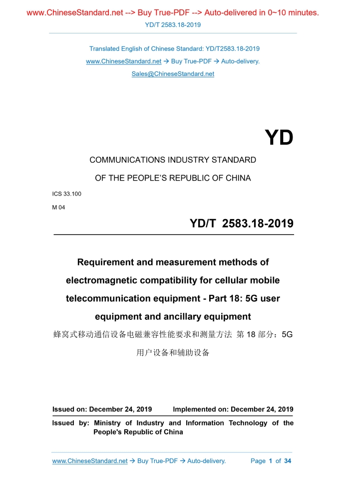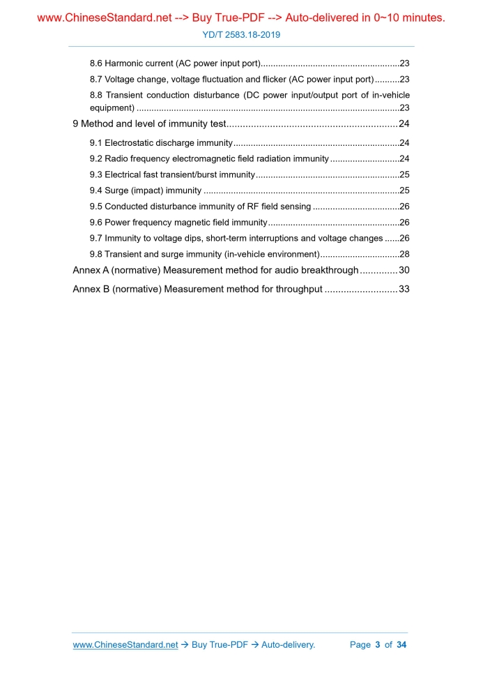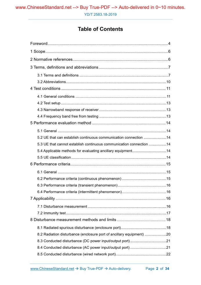 Similar standardsYD/T 2583.18-2019: Requirement and measurement methods of electromagnetic compatibility for cellular mobile telecommunication equipment - Part 18: 5G user equipment and ancillary equipment---This is an excerpt. Full copy of true-PDF in English version (including equations, symbols, images, flow-chart, tables, and figures etc.), auto-downloaded/delivered in 9 seconds, can be purchased online: https://www.ChineseStandard.net/PDF.aspx/YDT2583.18-2019 YD COMMUNICATIONS INDUSTRY STANDARD ICS 33.100 M 04 Requirement and measurement methods of electromagnetic compatibility for cellular mobile telecommunication equipment - Part 18.5G user equipment and ancillary equipment Issued on: DECEMBER 24, 2019 Implemented on: DECEMBER 24, 2019 Issued by. Ministry of Industry and Information Technology of the People's Republic of China Table of ContentsForeword... 4 1 Scope... 6 2 Normative references... 6 3 Terms, definitions and abbreviations... 7 3.1 Terms and definitions... 7 3.2 Abbreviations... 10 4 Test conditions... 11 4.1 General conditions... 11 4.2 Test setup... 13 4.3 Narrowband response of receiver... 13 4.4 Frequency band free from testing... 13 5 Performance evaluation method... 14 5.1 General... 14 5.2 UE that can establish continuous communication connection... 14 5.3 UE that cannot establish continuous communication connection... 14 5.4 Applicable methods for evaluating ancillary equipment... 14 5.5 UE classification... 14 6 Performance criteria... 15 6.1 General... 15 6.2 Performance criteria (continuous phenomenon)... 15 6.3 Performance criteria (transient phenomenon)... 16 6.4 Performance criteria (intermittent phenomenon)... 16 7 Applicability... 16 7.1 Disturbance measurement... 16 7.2 Immunity test... 17 8 Disturbance measurement methods and limits... 18 8.1 Radiated spurious disturbance (enclosure port)... 18 8.2 Radiation disturbance (enclosure port of ancillary equipment)... 20 8.3 Conducted disturbance (DC power input/output port)... 21 8.4 Conducted disturbance (AC power input/output port)... 21 8.5 Conducted disturbance (wired network port)... 22 8.6 Harmonic current (AC power input port)... 23 8.7 Voltage change, voltage fluctuation and flicker (AC power input port)... 23 8.8 Transient conduction disturbance (DC power input/output port of in-vehicle equipment)... 23 9 Method and level of immunity test... 24 9.1 Electrostatic discharge immunity... 24 9.2 Radio frequency electromagnetic field radiation immunity... 24 9.3 Electrical fast transient/burst immunity... 25 9.4 Surge (impact) immunity... 25 9.5 Conducted disturbance immunity of RF field sensing... 26 9.6 Power frequency magnetic field immunity... 26 9.7 Immunity to voltage dips, short-term interruptions and voltage changes... 26 9.8 Transient and surge immunity (in-vehicle environment)... 28 Annex A (normative) Measurement method for audio breakthrough... 30 Annex B (normative) Measurement method for throughput... 33 Requirement and measurement methods of electromagnetic compatibility for cellular mobile telecommunication equipment - Part 18.5G user equipment and ancillary equipment1 ScopeThis Part specifies electromagnetic compatibility requirements for 5G cellular mobile communication system user equipment and ancillary equipment, including measurement methods, frequency range, limits and performance criteria. This Part is applicable to user equipment for portable and in-vehicle use, user equipment powered by a power source and used in a fixed location, as well as various data terminal equipment of 5G cellular communication system.2 Normative referencesThe following referenced documents are indispensable for the application of this document. For dated references, only the edition cited applies. For undated references, the latest edition of the referenced document (including any amendments) applies. GB 17625.1, Electromagnetic compatibility - Limits - Limits for harmonic current emissions (equipment input current ≤16 A per phase) GB/T 17625.2, Electromagnetic compatibility limits (EMC) - Limitation of voltage changes, voltage fluctuations and flicker in public low-voltage supply systems, for equipment with rated current ≤16A per phase and not subject to conditional connection GB/T 17626.2, Electromagnetic compatibility - Testing and measurement techniques - Electrostatic discharge immunity test GB/T 17626.3, Electromagnetic compatibility - Testing and measurement techniques - Radiated, radio-frequency, electromagnetic field immunity test GB/T 17626.4, Electromagnetic compatibility - Testing and measurement techniques - Electrical fast transient/burst immunity test 3.1.1 User Equipment (UE) A device that can access mobile cellular services through one or more wireless interfaces. When this device accesses mobile cellular services, it can be stationary or mobile in the cellular service area. The device can provide services to one or more users at the same time. 3.1.2 Ancillary Equipment (AE) A device connected to a wireless communication device that meets the following conditions at the same time. - Connect with wireless communication equipment, so as to provide additional operating or control features, for example, extend operation or control to other locations; - Cannot be used independently of wireless devices, otherwise user functions cannot be provided separately; - The connected wireless communication device can still perform scheduled operations such as transmitting and/or receiving without this ancillary device (that is, ancillary equipment is not a subunit of the basic function of the main equipment). 3.1.3 Associated Measurement Equipment (AME) A device that assists the UE to work, enables the UE to work normally and/or monitors the working status of the UE, for example, base station simulator. The associated measurement equipment can be placed in the test area or outside the test area. It should be placed outside the test area. 3.1.4 Channel Bandwidth Single carrier transmission bandwidt