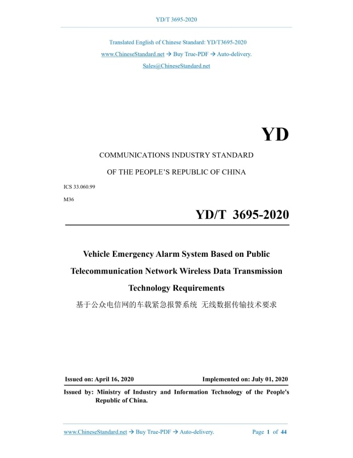 YD/T 3695-2020: Vehicle Emergency Alarm System Based on Public Telecommunication Network Wireless Data Transmission Technology Requirements Delivery: 9 seconds. True-PDF full-copy in English & invoice will be downloaded + auto-delivered via email. See step-by-step procedure Status: Valid