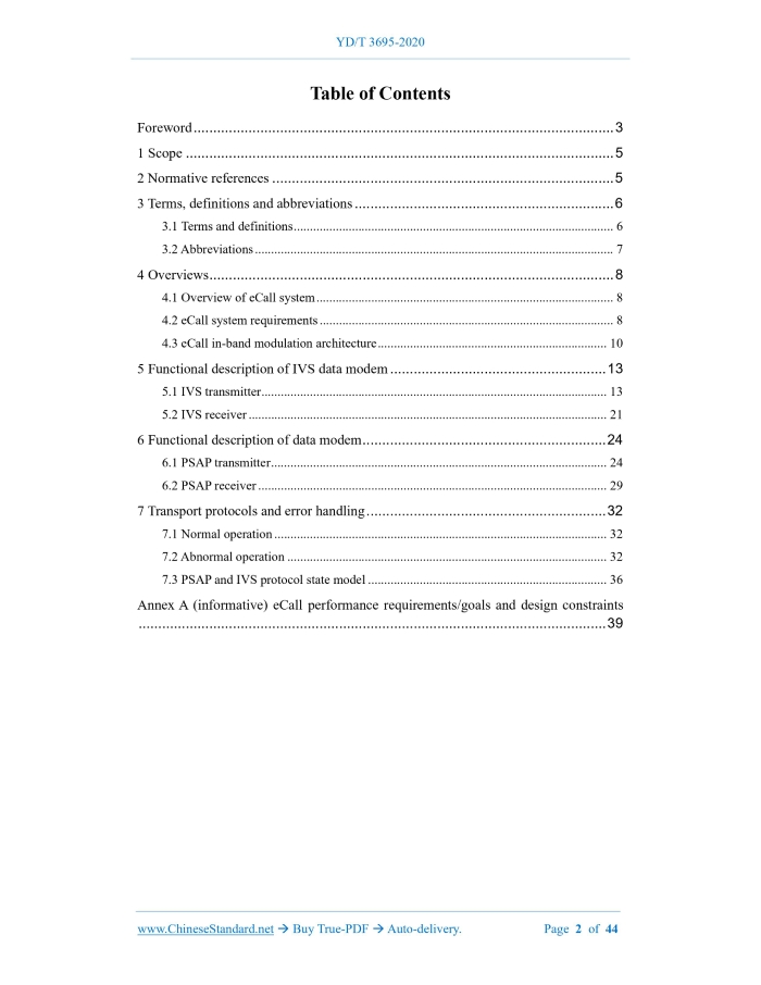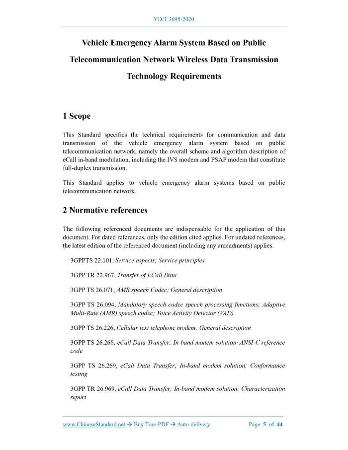Similar standardsYD/T 3695-2020: Vehicle Emergency Alarm System Based on Public Telecommunication Network Wireless Data Transmission Technology Requirements---This is an excerpt. Full copy of true-PDF in English version (including equations, symbols, images, flow-chart, tables, and figures etc.), auto-downloaded/delivered in 9 seconds, can be purchased online: https://www.ChineseStandard.net/PDF.aspx/YDT3695-2020 YD COMMUNICATIONS INDUSTRY STANDARD ICS 33.060.99 M36 Vehicle Emergency Alarm System Based on Public Telecommunication Network Wireless Data Transmission Technology Requirements Issued on. APRIL 16, 2020 Implemented on. JULY 01, 2020 Issued by. Ministry of Industry and Information Technology of the People's Republic of China. Table of ContentsForeword... 3 1 Scope... 5 2 Normative references... 5 3 Terms, definitions and abbreviations... 6 3.1 Terms and definitions... 6 3.2 Abbreviations... 7 4 Overviews... 8 4.1 Overview of eCall system... 8 4.2 eCall system requirements... 8 4.3 eCall in-band modulation architecture... 10 5 Functional description of IVS data modem... 13 5.1 IVS transmitter... 13 5.2 IVS receiver... 21 6 Functional description of data modem... 24 6.1 PSAP transmitter... 24 6.2 PSAP receiver... 29 7 Transport protocols and error handling... 32 7.1 Normal operation... 32 7.2 Abnormal operation... 32 7.3 PSAP and IVS protocol state model... 36 Annex A (informative) eCall performance requirements/goals and design constraints ... 391 ScopeThis Standard specifies the technical requirements for communication and data transmission of the vehicle emergency alarm system based on public telecommunication network, namely the overall scheme and algorithm description of eCall in-band modulation, including the IVS modem and PSAP modem that constitute full-duplex transmission. This Standard applies to vehicle emergency alarm systems based on public telecommunication network.2 Normative referencesThe following referenced documents are indispensable for the application of this document. For dated references, only the edition cited applies. For undated references, the latest edition of the referenced document (including any amendments) applies. 3GPPTS 22.101, Service aspects; Service principles 3GPP TR 22.967, Transfer of ECall Data 3GPP TS 26.071, AMR speech Codec; General description 3GPP TS 26.094, Mandatory speech codec speech processing functions; Adaptive Multi-Rate (AMR) speech codec; Voice Activity Detector (VAD) 3GPP TS 26.226, Cellular text telephone modem; General description 3GPP TS 26.268, eCall Data Transfer; In-band modem solution· ANSI-C reference code3 Terms, definitions and abbreviations3.1 Terms and definitions For the purposes of this document, the following terms and definitions apply. 3.1.6 MSD data frame It includes the uplink signal transmission time of one MSD data (after synchronization is established). The duration is 1320 ms. This is equivalent to a total of 10560 samples at 8kHz sampling rate (if a fast modulator is used) or 18560 samples (if a reliable modulator is used). 3.1.7 modulation frame Symbol transmission time. The duration is 2 ms, equivalent to 16 samples at 8kHz sampling rate (if a fast modulator is used), or 4 ms, equivalent to 32 samples at 8kHz sampling rate (if a reliable modulator is used). 3.1.8 synchronization frame It includes the signal transmission time of synchronization information. The duration is 260 ms. This is equivalent to 2080 samples at a sampling rate of 8 kHz. 3.2 Abbreviations The following abbreviations apply to this document.4 Overviews4.1 Overview of eCall system Figure 1 gives an overall description of the eCall system. 4.3 eCall in-band modulation architecture 4.3.1 General The eCall in-band modulation scheme specified in this Standard consists of an IVS data modem and a PSAP data modem. The signal design used allows the signal to pass through the voice vocoder with only moderate distortion and provide sufficient data rate to meet the requirements of transmitting MSD as quickly as possible. 4.3.2 IVS data modem working principle Figure 3 shows the basic components of an IVS data modem. The MSD information input to the IVS transmitter is first added with CRC check information, and then all bits are input to the HARQ encoder. FEC coding is used to combat transmission errors.5 Functional description of IVS data modem5.1 IVS transmitter 5.1.1 General The IVS transmitter is used to modulate the MSD data so that it is suitable for in-band transmission over the voice channel to the PSAP. The components of the IVS transmitter are shown in Figure 5. 5.1.3 CRC check code Each MSD message is preceded by a 28-bit CRC checksum before HARQ FEC encoding. 5.1.4 HARQ FEC encoder 5.1.4.1 Bit scrambling Bit scrambling is performed on the MSD information after the CRC check is added (before Turbo encoding). 5.1.4.2 Turbo coding The Turbo encoder scheme used in eCall intra-band modulation consists of two identical 8-state parallel-concatenated convolutional coding (PCCC) sub-encoders and a Turbo code intra-interleaver. The transfer function of the sub-encoder is. Table 2 -- MSD data frame format 5.1.7 Synchronization signal and frame format The synchronization frame is composed of the following two parts in series. 5.2.6 Message processing This function activates the corresponding function of the IVS modem according to the received message. After synchronization lock, once a START message is received, the IVS transmitter is activated for MSD transmission.6 Functional description of data modem6.1 PSAP transmitter 6.1.1 General The PSAP transmitter generates downlink transmission signals. These downlink signals are used to control the transmission of uplink MSD. The PSAP transmitter is shown in Figure 15. 6.1.2 Message encoding According to the design, the PSAP transmitter can send a total of 16 different link layer messages to the IVS. The following three are currently used. 6.1.3 BCH coding The link layer feedback uses a truncated 