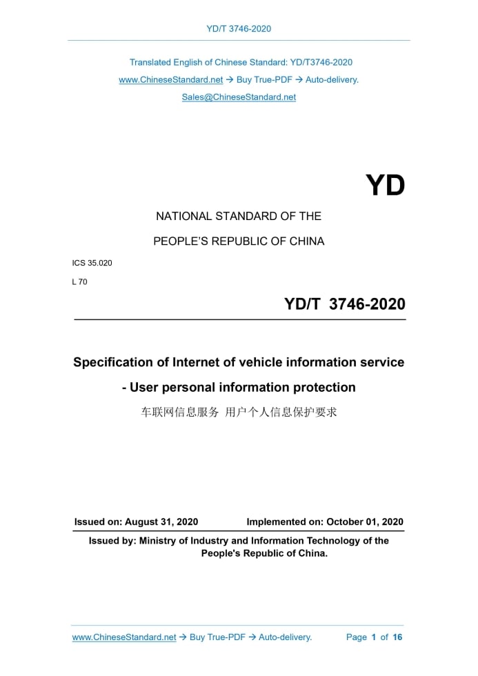 YD/T 3746-2020: Specification of internet of vehicle information service - User personal information protection Delivery: 9 seconds. True-PDF full-copy in English & invoice will be downloaded + auto-delivered via email. See step-by-step procedure Status: Valid