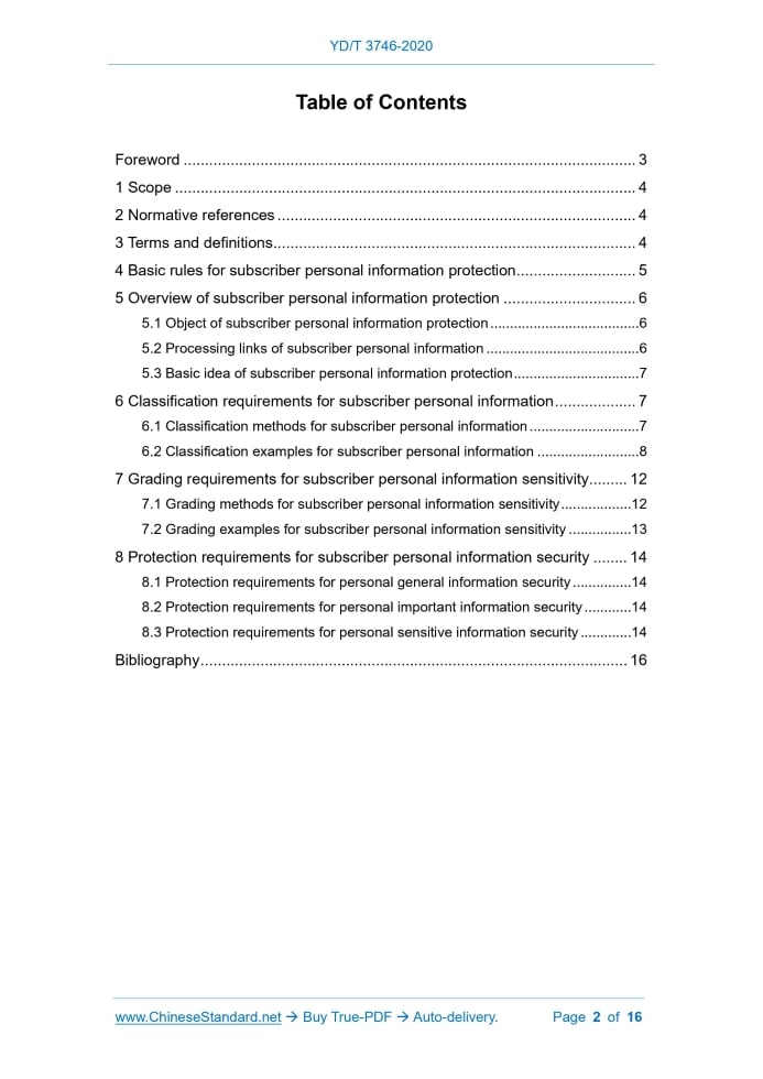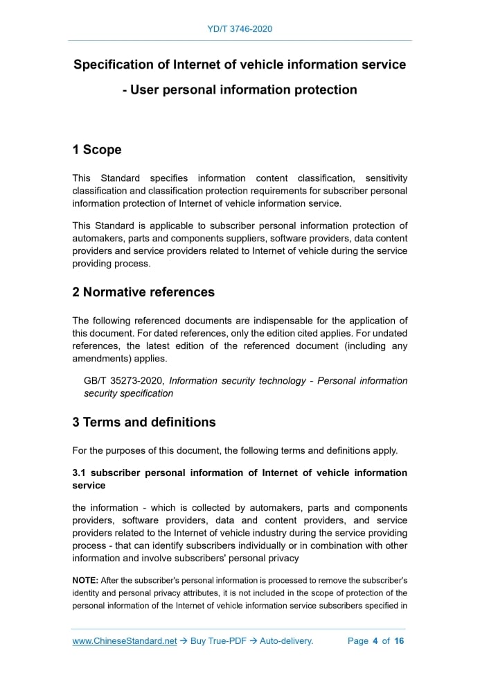 Similar standardsYD/T 3746-2020: Specification of internet of vehicle information service - User personal information protection---This is an excerpt. Full copy of true-PDF in English version (including equations, symbols, images, flow-chart, tables, and figures etc.), auto-downloaded/delivered in 9 seconds, can be purchased online: https://www.ChineseStandard.net/PDF.aspx/YDT3746-2020 NATIONAL STANDARD OF THE PEOPLE’S REPUBLIC OF CHINA ICS 35.020 L 70 Specification of Internet of vehicle information service - User personal information protection ISSUED ON: AUGUST 31, 2020 IMPLEMENTED ON: OCTOBER 01, 2020 Issued by: Ministry of Industry and Information Technology of the People's Republic of China. Table of ContentsForeword ... 3 1 Scope ... 4 2 Normative references ... 4 3 Terms and definitions ... 4 4 Basic rules for subscriber personal information protection ... 5 5 Overview of subscriber personal information protection ... 6 5.1 Object of subscriber personal information protection ... 6 5.2 Processing links of subscriber personal information ... 6 5.3 Basic idea of subscriber personal information protection ... 7 6 Classification requirements for subscriber personal information ... 7 6.1 Classification methods for subscriber personal information ... 7 6.2 Classification examples for subscriber personal information ... 8 7 Grading requirements for subscriber personal information sensitivity ... 12 7.1 Grading methods for subscriber personal information sensitivity ... 12 7.2 Grading examples for subscriber personal information sensitivity ... 13 8 Protection requirements for subscriber personal information security ... 14 8.1 Protection requirements for personal general information security ... 14 8.2 Protection requirements for personal important information security ... 14 8.3 Protection requirements for personal sensitive information security ... 14 Bibliography ... 16 Specification of Internet of vehicle information service - User personal information protection1 ScopeThis Standard specifies information content classification, sensitivity classification and classification protection requirements for subscriber personal information protection of Internet of vehicle information service. This Standard is applicable to subscriber personal information protection of automakers, parts and components suppliers, software providers, data content providers and service providers related to Internet of vehicle during the service providing process.2 Normative referencesThe following referenced documents are indispensable for the application of this document. For dated references, only the edition cited applies. For undated references, the latest edition of the referenced document (including any amendments) applies. GB/T 35273-2020, Information security technology - Personal information security specification3 Terms and definitionsFor the purposes of this document, the following terms and definitions apply. 3.1 subscriber personal information of Internet of vehicle information service the information - which is collected by automakers, parts and components providers, software providers, data and content providers, and service providers related to the Internet of vehicle industry during the service providing process - that can identify subscribers individually or in combination with other information and involve subscribers' personal privacy NOTE: After the subscriber's personal information is processed to remove the subscriber's identity and personal privacy attributes, it is not included in the scope of protection of the personal information of the Internet of vehicle information service subscribers specified in this Standard. For example, the scale statistics of the subscription business of the Internet of vehicle information service, etc.4 Basic rules for subscriber personal informationprotection The subscriber personal information protection of Internet of vehicle information service usually shall follow the requirements in GB/T 35273-2020, follow the principles of consistency of rights and responsibilities, clear purpose, selection under consent, enough for use, openness and transparency, safety ensuring, and subject participation, so as to use personal information reasonably. - Principle of consistency of rights and responsibilities: Take technical and other necessary measures to protect the security of personal information. It shall be liable for the damage caused by its personal information processing activities to the legitimate rights and interests of personal information subjects. - Principle of clear purpose: It has a legal, legitimate, necessary and clear purpose of personal information processing. - Principle of selection under consent: Clearly state the purpose, method, scope, rules, etc. of personal information processing to personal information subjects, and seek their authorization and consent. - Principle of enough for use: Only process the minimum type and amount of personal information necessary to satisfy the purposes for which the personal information subject has authorized and consented to it. After the purpose is achieved, personal information shall be deleted in a timely manner. - Principle of openness and transparency: Disclose the scope, purpose and rules of processing personal information in a clear, understandable and reasonable manner. Receive external oversight. - Principle of safety ensuring: It has security capabilities commensurate with the security risks faced. Take adequate management measures and technical means to protect the confidentiality, integrity and availability of personal information. - Principle of subject participation: Provide personal information subjects with methods to inquire, correct, delete their personal information, as well as withdraw, unify, cancel accounts, and lodge complaints. processing refers to entrusting the personal information controller of the Internet of vehicle subscribers to a third party to process the personal informati