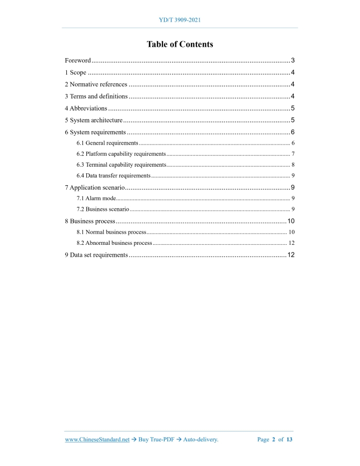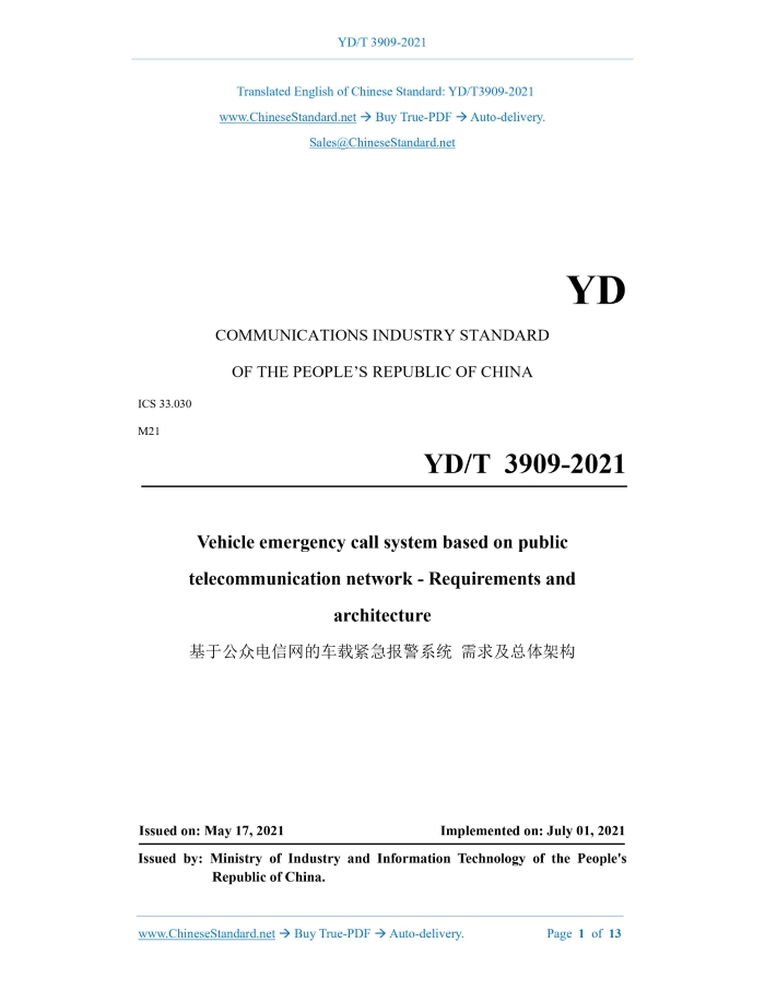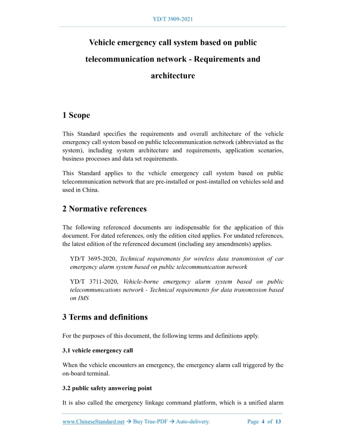 YD/T 3909-2021: Vehicle emergency call system based on public telecommunication network - Requirements and architecture---This is an excerpt. Full copy of true-PDF in English version (including equations, symbols, images, flow-chart, tables, and figures etc.), auto-downloaded/delivered in 9 seconds, can be purchased online: https://www.ChineseStandard.net/PDF.aspx/YDT3909-2021 YD COMMUNICATIONS INDUSTRY STANDARD OF THE PEOPLE’S REPUBLIC OF CHINA ICS 33.030 M21 Vehicle emergency call system based on public telecommunication network - Requirements and architecture ISSUED ON: MAY 17, 2021 IMPLEMENTED ON: JULY 01, 2021 Issued by: Ministry of Industry and Information Technology of the People's Republic of China. Table of ContentsForeword ... 3 1 Scope ... 4 2 Normative references ... 4 3 Terms and definitions ... 4 4 Abbreviations ... 5 5 System architecture ... 5 6 System requirements ... 6 6.1 General requirements ... 6 6.2 Platform capability requirements ... 7 6.3 Terminal capability requirements ... 8 6.4 Data transfer requirements ... 9 7 Application scenario ... 9 7.1 Alarm mode ... 9 7.2 Business scenario ... 9 8 Business process ... 10 8.1 Normal business process ... 10 8.2 Abnormal business process ... 12 9 Data set requirements ... 12 Vehicle emergency call system based on public telecommunication network - Requirements and architecture1 ScopeThis Standard specifies the requirements and overall architecture of the vehicle emergency call system based on public telecommunication network (abbreviated as the system), including system architecture and requirements, application scenarios, business processes and data set requirements. This Standard applies to the vehicle emergency call system based on public telecommunication network that are pre-installed or post-installed on vehicles sold and used in China.2 Normative referencesThe following referenced documents are indispensable for the application of this document. For dated references, only the edition cited applies. For undated references, the latest edition of the referenced document (including any amendments) applies. YD/T 3695-2020, Technical requirements for wireless data transmission of car emergency alarm system based on public telecommunication network YD/T 3711-2020, Vehicle-borne emergency alarm system based on public telecommunications network - Technical requirements for data transmission based on IMS3 Terms and definitionsFor the purposes of this document, the following terms and definitions apply. 3.1 vehicle emergency call When the vehicle encounters an emergency, the emergency alarm call triggered by the on-board terminal. 3.2 public safety answering point It is also called the emergency linkage command platform, which is a unified alarm provided by the roaming area. - System reliability: The system shall ensure high reliability through backup, disaster recovery, redundancy and other mechanisms. 6.2 Platform capability requirements 6.2.1 PSAP functional requirements PSAP shall meet the following functional requirements: - It has the functions of handling emergency calls, supporting queuing mechanism and automatic seat allocation; - It shall have data statistics, analysis functions and data and information security strategies; - It shall have data replication and off-site disaster recovery functions. 6.2.2 Functional requirements of vehicle emergency rescue platform The vehicle emergency rescue platform shall meet the following functional requirements: - It shall be able to handle emergency calls, support queuing mechanism, automatic seat allocation function, and multi-party calling function; - It shall have the function of receiving and parsing emergency rescue data sets, supporting retransmission mechanism. The information types include voice, data, SMS, optional pictures and videos; - It shall have resource integration function (PSAP database resources, map resources, etc.); - It shall have complete service records and traceability functions; - It shall have an information management system and information security strategy, including all vehicle-mounted emergency call related information such as the vehicle uploaded information received, user information and vehicle information stored on the platform; - It shall have operational monitoring and management functions, including role management, authority management, log management, performance monitoring, alarm monitoring, etc.; - It shall have functions such as data statistics, analysis and report export; - It shall have data backup and off-site disaster recovery functions. 6.2.3 PSAP and vehicle emergency rescue platform performance requirements PSAP and vehicle emergency rescue platform shall meet the following performance requirements: - It shall support multiple voice channels concurrently; - It shall support 7×24h operation; - IT system availability requirements shall meet >99.99%; - Service response speed requirements: The response rate within 12 s shall reach 95%, the response rate within 45 seconds shall reach 99%, and the response rate within 120 seconds shall reach 100%; - The call loss rate shall be ≤1% (if the user hangs up the call, it will not be included in the call loss rate). 6.3 Terminal capability requirements The terminal shall have the following functions: - It shall have the ability to automatically trigger and manually trigger emergency alarms; - It shall be able to collect location information and vehicle status information. It can also be able to collect video or pictures and other environmental perception capabilities; - It shall have network connection and data transmission capabilities; - It shall have the function of automatically making/answering calls; - It shall have the function of whitelisting phone and SMS numbers; - It shall have an automatic data retransmission mechanism and support platform data retransmission requests; - It shall have self-checking capability. It can optionally provide fault information prompts through soun