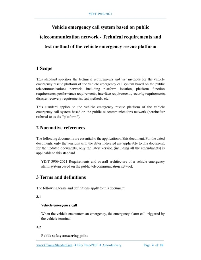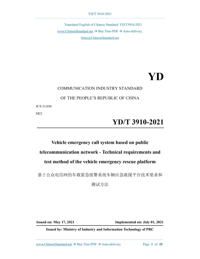 YD/T 3910-2021: Vehicle emergency call system based on public telecommunication network - Technical requirements and test method of the vehicle emergency rescue platform---This is an excerpt. Full copy of true-PDF in English version (including equations, symbols, images, flow-chart, tables, and figures etc.), auto-downloaded/delivered in 9 seconds, can be purchased online: https://www.ChineseStandard.net/PDF.aspx/YDT3910-2021 YD COMMUNICATION INDUSTRY STANDARD ICS 33.030 M21 Vehicle emergency call system based on public telecommunication network - Technical requirements and test method of the vehicle emergency rescue platform Issued on. MAY 17, 2021 Implemented on. JULY 01, 2021 Issued by. Ministry of Industry and Information Technology of PRC Table of ContentsForeword... 3 1 Scope... 4 2 Normative references... 4 3 Terms and definitions... 4 4 Abbreviations... 5 5 Platform location... 5 6 Platform technical requirements... 6 6.1 Functional requirements... 6 6.2 Performance requirements... 9 6.3 Interface requirements... 10 6.4 Security requirements... 10 6.5 Disaster recovery and backup requirements... 10 7 Platform test method... 11 7.1 Test system structure... 11 7.2 Test items... 111 ScopeThis standard specifies the technical requirements and test methods for the vehicle emergency rescue platform of the vehicle emergency call system based on the public telecommunications network, including platform location, platform function requirements, performance requirements, interface requirements, security requirements, disaster recovery requirements, test methods, etc. This standard applies to the vehicle emergency rescue platform of the vehicle emergency call system based on the public telecommunications network (hereinafter referred to as the "platform").2 Normative referencesThe following documents are essential to the application of this document. For the dated documents, only the versions with the dates indicated are applicable to this document; for the undated documents, only the latest version (including all the amendments) is applicable to this standard. YD/T 3909-2021 Requirements and overall architecture of a vehicle emergency alarm system based on the public telecommunication network3 Terms and definitionsThe following terms and definitions apply to this document. 3.1 Vehicle emergency call When the vehicle encounters an emergency, the emergency alarm call triggered by the vehicle terminal.4 AbbreviationsCELLID. Cell identification IDC. Internet data center IMS. IP multimedia subsystem5 Platform locationThe vehicle emergency rescue platform refers to a platform provided by third parties such as car manufacturers or automotive remote service providers, which is responsible for the reception, processing, distribution, storage and other tasks of emergency alarms in the entire system.6 Platform technical requirements6.1 Functional requirements 6.1.1 Functional requirements for interaction between the platform and PSAP The platform shall have the following functional requirements for alarming PSAP. 6.1.2 Requirements for the platform to receive vehicle alarms The platform must have the following functional requirements for receiving vehicle alarms. 6.1.3 Data set requirements 6.1.3.1 Transmission of data sets between the vehicle emergency rescue platform and PSAP 6.4 Security requirements The platform shall meet the following security requirements.7 Platform test method7.1 Test system structure The vehicle emergency rescue platform test method of the vehicle emergency call system shall be tested using the test system structure shown in Figure 2. Figure 2 -- Test system structure 7.2 Test items 7.2.1.1.2 The platform receives alarm voice through Internet voice call Test number. Test item. The platform receives the alarm voice through the Internet voice call Test purpose. Verify the platform's function of receiving the alarm voice through the Internet voice call Pre-conditions. 7.2.1.2 The platform receiving rescue data set function 7.2.1.2.1 The platform receives the rescue data set through In-band transmission 7.2.1.3 Platform requests to retransmit the rescue data set 7.2.1.3.1 Platform requests to retransmit the rescue data set during a voice call Test number. Test item. Platform requests to retransmit the rescue data set during a voice call Test purpose. Verify the function of the platform requesting to retransmit the rescue data set during a voice call Pre-conditions. 7.2.1.3.2 Platform calls back to request the vehicle terminal to retransmit the rescue data set Test number. 7.2.1.10 Three-party call function Test number. Test item. Three-party call function Test purpose. Verify that the platform has the three-party call function Pre-conditions. 7.2.4.2.2 Platform primary and standby data lines Test number. Test item. Platform primary and standby data line switching Test purpose. Platform primary and standby data line switching function Pre-conditions. 7.2.4.5 Platform primary and standby power supply system test Test number. YD/T 3910-2021 YD COMMUNICATION INDUSTRY STANDARD ICS 33.030 M21 Vehicle emergency call system based on public telecommunication network - Technical requirements and test method of the vehicle emergency rescue platform Issued on. MAY 17, 2021 Implemented on. JULY 01, 2021 Issued by. Ministry of Industry and Information Technology of PRCTable of ContentsForeword... 3 1 Scope... 4 2 Normative references... 4 3 Terms and definitions... 4 4 Abbreviations... 5 5 Platform location... 5 6 Platform technical requirements... 6 6.1 Functional requirements... 6 6.2 Performance requirements... 9 6.3 Interface requirements... 10 6.4 Security requirements... 10 6.5 Disaster recovery and backup requirements... 10 7 Platform test method... 11 7.1 Test system structure... 11 7.2 Test items... 111 ScopeThis standard specifies the technical requirements and test methods for the vehicle emergency rescue platform of the vehicle emergency call system based on the public telecommuni