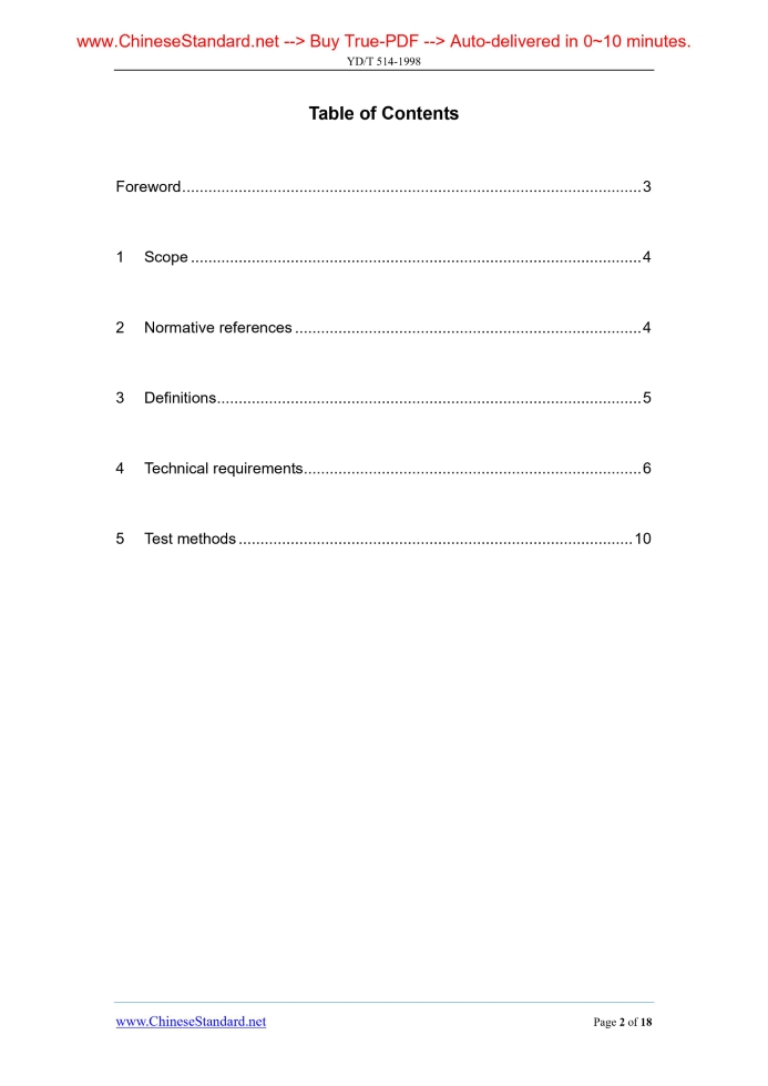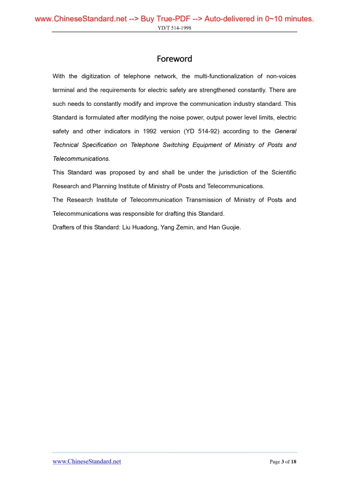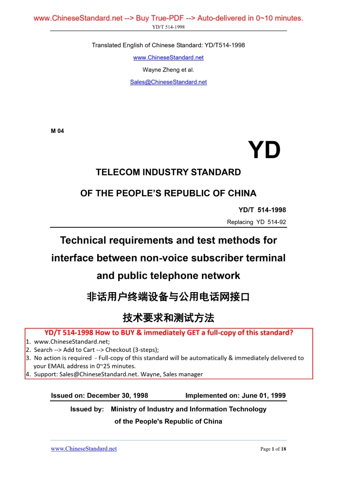 Similar standardsYD/T 514-1998: Technical requirements and test methods for interface between non-voice subscriber terminal and public telephone network---This is an excerpt. Full copy of true-PDF in English version (including equations, symbols, images, flow-chart, tables, and figures etc.), auto-downloaded/delivered in 9 seconds, can be purchased online: https://www.ChineseStandard.net/PDF.aspx/YDT514-1998 M 04 TELECOM INDUSTRY STANDARD OF THE PEOPLE’S REPUBLIC OF CHINA Replacing YD 514-92 Technical requirements and test methods for interface between non-voice subscriber terminal and public telephone network Issued on: DECEMBER 30, 1998 Implemented on: JUNE 01, 1999 Issued by. Ministry of Industry and Information Technology of the People's Republic of China YD Table of ContentsForeword ... 3 1 Scope ... 4 2 Normative references ... 4 3 Definitions ... 5 4 Technical requirements ... 6 5 Test methods ... 10ForewordWith the digitization of telephone network, the multi-functionalization of non-voices terminal and the requirements for electric safety are strengthened constantly. There are such needs to constantly modify and improve the communication industry standard. This Standard is formulated after modifying the noise power, output power level limits, electric safety and other indicators in 1992 version (YD 514-92) according to the General Technical Specification on Telephone Switching Equipment of Ministry of Posts and Telecommunications. This Standard was proposed by and shall be under the jurisdiction of the Scientific Research and Planning Institute of Ministry of Posts and Telecommunications. The Research Institute of Telecommunication Transmission of Ministry of Posts and Telecommunications was responsible for drafting this Standard. Drafters of this Standard. Liu Huadong, Yang Zemin, and Han Guojie. The Communication Industry Standard of the People’s Republic of China Technical requirements and test methods for interface between non-voices subscriber terminal and public telephone network1 ScopeThis Standard specifies the electric safety standard for accessing network, test methods and interface parameters of connection BETWEEN public telephone network AND various non-voices subscriber terminal which use ordinary telephone circuit as transmission media. This Standard can be served as the basis for the design, manufacturing, maintenance and measurement of the interface that connects the non-voices subscriber terminal to the subscriber line of public telephone network.2 Normative referencesThe following standards contain provisions which, through reference in this Standard, constitute provisions of this Standard. At the time of publication, the editions indicated are valid. All standards are subject to revision. The parties who are using this Standard shall explore the possibility of using the latest version of the following standards. YD/T 965-1998 The safety requirement and test method for telecommunication terminal equipment GB 1002-1996 Types, basic parameters and dimensions of single phase plugs and sockets GB 2099-1996 Plugs and socket-outlets for household and similar purposes Replacing YD 514-923 Definitions3.1 Non-voices subscriber terminal It refers to the telecommunication device connecting to the subscriber line in telephone network for information communication other than telephone 3.2 Terminals of line A and B The terminals connecting the non-voices subscriber terminal and the subscriber line of telephone network 3.3 “On-hook” state It refers to the working condition that the non-voices subscriber terminal cooperates with the telephone exchange network. When it is under the “on-hook” state, the non-voices subscriber terminal produces a high impedance to the telephone network. And it cuts off the DC circuit, so as to restore the device in local network. 3.4 “Off-hook” state It refers to another working condition that the non-voices subscriber terminal cooperates with the telephone exchange network. When it is under the “off-hook” state, the non-voices subscriber terminal closes the DC circuit, so as to start and maintain the device’s action in local network. 3.5 Longitudinal balance It is used to measure the balance performance of terminals A and B of the non-voices subscriber terminal to the ground. The definition formula of longitudinal balance Bm-1 is. In the formula, Em is called lateral voltage, and it is the potential difference between terminals A and B. E1 is called longitudinal voltage. It is caused by the unbalance of terminals A and B to the ground. And it is equal to 1/2 of the vector SUM of the potential difference of terminal A to the ground AND the potential difference of terminal B to the ground. When not sending the dialing signal, the level of each single-frequency signal in dual-tone multifrequency signal shall not be greater than -70dBm. 4.5 Automatic calling and answering process The following procedure parameters shall be configured as the default settings of the device. 4.5.1 Sending conditions of dialing signal The non-voices subscriber terminal shall wait for at least 2s before sending digital signal since entering the “off-hook” state. When a dial tone detection method is adopted, the sending of dialing signal is not restricted by the above time limit. 4.5.2 Time limit for waiting for answering after dialing When the non-voices subscriber terminal has not received the answering signals sent by the opposite terminal after at most 50s from it sending the last dialing signal, it shall cut off the DC circuit and return to the “on-hook” state. 4.5.3 Interval and times of automatic recalling Under the conditions of 4.5.2, if there is need to recall this number, it shall wait for at lease 30s from returning to the “on-hook” state before entering into “off-hook” state and recalling. It shall not recall the same number for more than three times. After 3 times of re-calling, there shall be at least 5min time interval 