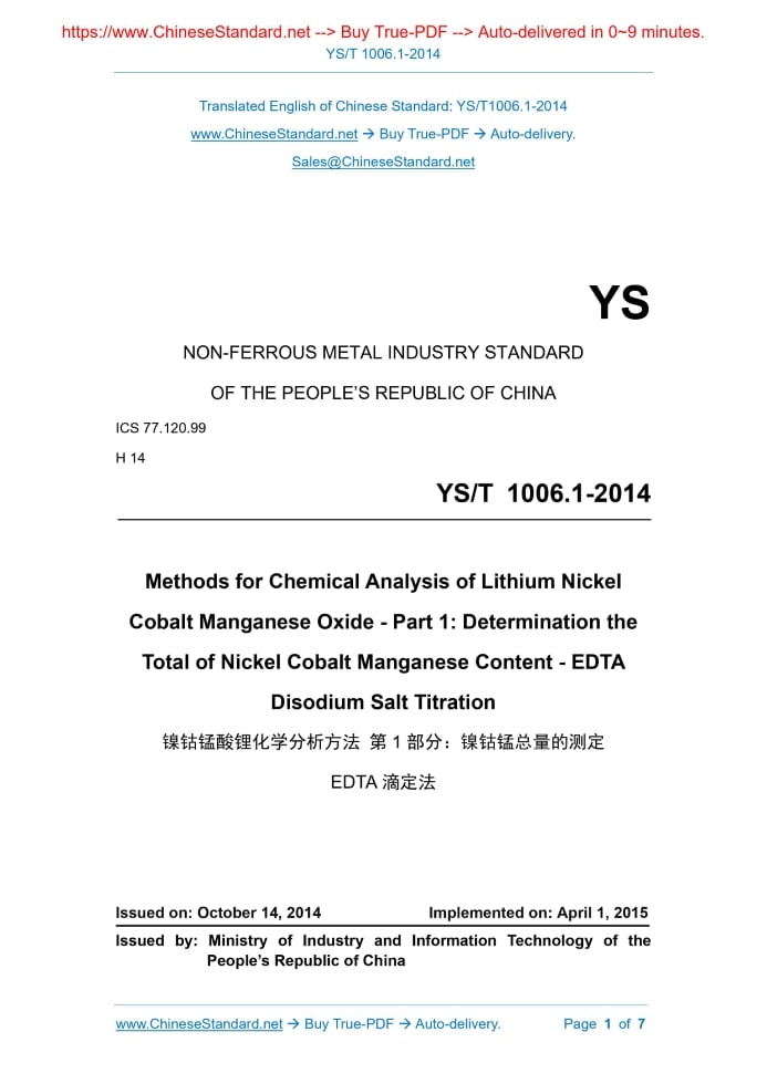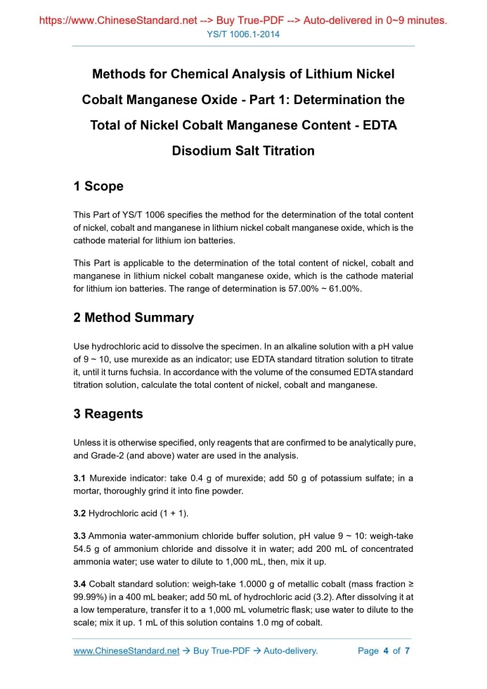 YS/T 1006.1-2014: Methods for chemical analysis of lithium nickel cobalt manganese oxide. Part 1: Determination the total of nickel cobalt manganese content. EDTA disodium salt titration Delivery: 9 seconds. True-PDF full-copy in English & invoice will be downloaded + auto-delivered via email. See step-by-step procedure Status: Valid