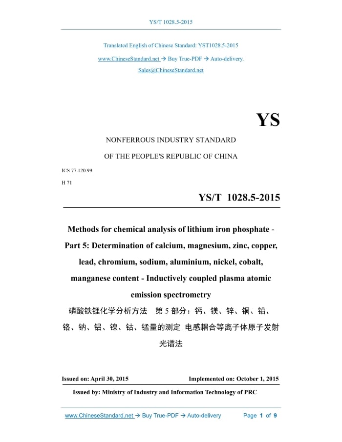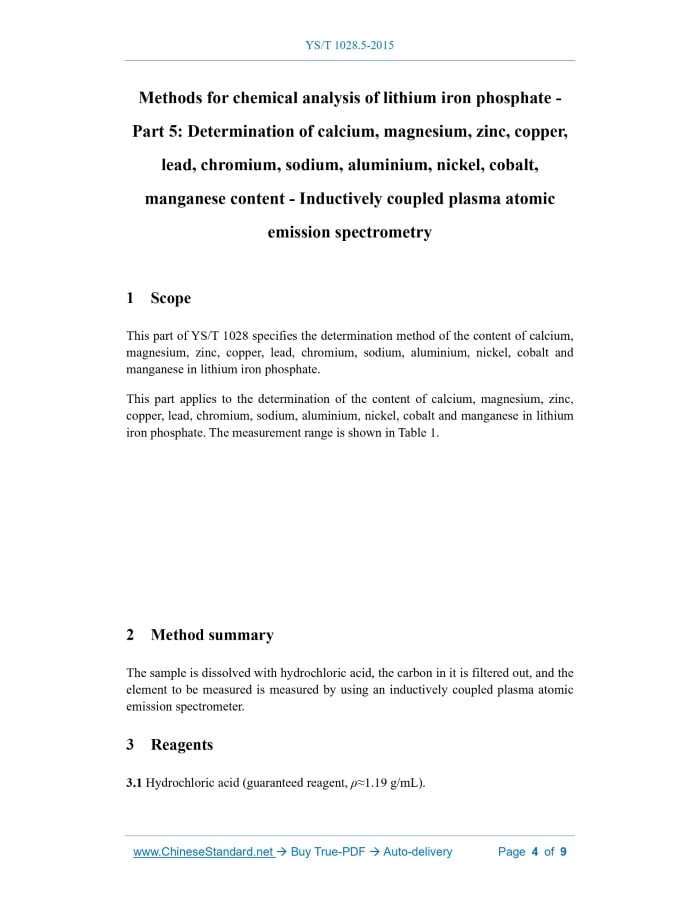 YS/T 1028.5-2015: Methods for chemical analysis of lithium iron phosphate. Part 5: Determination of calcium、magnesium、zinc、copper、lead、chromium、sodium、aluminium、nickel、cobalt、manganese content. Inductively coupled plasma atomic emission spectrometry Delivery: 9 seconds. True-PDF full-copy in English & invoice will be downloaded + auto-delivered via email. See step-by-step procedure