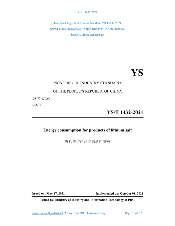 YS/T 1432-2021: Energy consumption for products of lithium salt Delivery: 9 seconds. True-PDF full-copy in English & invoice will be downloaded + auto-delivered via email. See step-by-step procedure Status: Valid