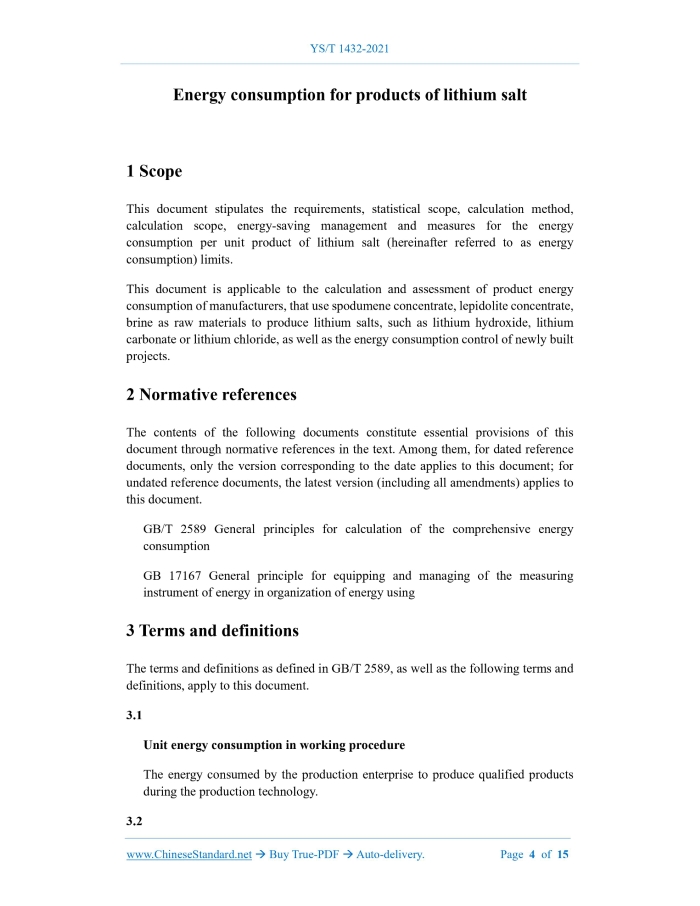 YS/T 1432-2021: Energy consumption for products of lithium salt---This is an excerpt. Full copy of true-PDF in English version (including equations, symbols, images, flow-chart, tables, and figures etc.), auto-downloaded/delivered in 9 seconds, can be purchased online: https://www.ChineseStandard.net/PDF.aspx/YST1432-2021YS NONFERROUS INDUSTRY STANDARD OF THE PEOPLE’S REPUBLIC OF CHINA ICS 77.150.99 CCS H 01 Energy consumption for products of lithium salt ISSUED ON: MAY 17, 2021 IMPLEMENTED ON: OCTOBER 01, 2021 Issued by: Ministry of Industry and Information Technology of PRC Table of ContentsForeword ... 3 1 Scope ... 4 2 Normative references ... 4 3 Terms and definitions ... 4 4 Requirements ... 5 5 Statistical scope, calculation method, calculation range ... 6 6 Energy saving management and measures ... 12 Appendix A (Informative) Current reference standard coal conversion coefficients for commonly used energy types ... 14 Appendix B (Informative) Energy equivalent reference value of energy-consuming working fluid ... 15 Energy consumption for products of lithium salt1 ScopeThis document stipulates the requirements, statistical scope, calculation method, calculation scope, energy-saving management and measures for the energy consumption per unit product of lithium salt (hereinafter referred to as energy consumption) limits. This document is applicable to the calculation and assessment of product energy consumption of manufacturers, that use spodumene concentrate, lepidolite concentrate, brine as raw materials to produce lithium salts, such as lithium hydroxide, lithium carbonate or lithium chloride, as well as the energy consumption control of newly built projects.2 Normative referencesThe contents of the following documents constitute essential provisions of this document through normative references in the text. Among them, for dated reference documents, only the version corresponding to the date applies to this document; for undated reference documents, the latest version (including all amendments) applies to this document. GB/T 2589 General principles for calculation of the comprehensive energy consumption GB 17167 General principle for equipping and managing of the measuring instrument of energy in organization of energy using3 Terms and definitionsThe terms and definitions as defined in GB/T 2589, as well as the following terms and definitions, apply to this document. 3.1 Unit energy consumption in working procedure The energy consumed by the production enterprise to produce qualified products during the production technology. 3.2 EZG - Energy consumption of various product technology; EZF - Energy consumption and losses in indirect auxiliary production departments; EZZ - Comprehensive energy consumption of all products. All types of energy consumed shall not be recalculated or omitted. Where there is a supply and demand relationship, the input and output parties shall be consistent in the calculated values. The energy consumption of equipment shutdown and overhaul shall also be included in the calculation; meanwhile it shall be evenly distributed on a monthly basis, according to the operation cycle of the equipment after the overhaul. The comprehensive energy consumption of enterprises is calculated in accordance with the provisions of GB/T 2589. Note: The energy consumption planed by the enterprise during the reporting period refers to the energy consumption directly used for production during the statistical period of this plan. 5.1.3 Measurement of physical energy amount The measurement of physical energy amount shall comply with the Measurement Law of the People's Republic of China and GB 17167. 5.1.4 Measurement units of various energy sources The units of enterprise production energy consumption, product technology energy consumption (or product direct comprehensive energy consumption), product comprehensive energy consumption: kgce, tce (kilogram standard coal, ton standard coal); Units of coal, coke, heavy oil: t, 104 t (ton, 10000 tons); Units of electricity: kW·h, 104 kW·h (kilowatt hours, ten thousand kilowatt hours); Units of steam: kg, t or kJ, GJ (kilogram, ton or kilojoule, million kilojoules); Units of gas, compressed air, oxygen: m3, 104 m3 (cubic meters, 10000 cubic meters); Units of water: t, 104 t (ton, 10000 tons). 5.1.5 Methods for converting various energy sources (including energy consumed in the production of energy-consuming working fluids) into standard coal amount The application of energy with a low (bit) calorific value equal to 29.3076 MJ (megajoules) is called 1 kg of standard coal. For externally purchased energy, the actual measured low (bit) calorific value or the actual measured value provided by the supplier can be used as the basis for calculation, OR it can be converted using the conversion coefficient of the national statistics department, as shown in Appendix A. Secondary energy and energy-consuming working fluids are converted according to the corresponding energy equivalent value: when the enterprise converts energy to self-production, the amount of standard coal is converted according to the actual physical amount of energy input; when it is sold and supplied by a centralized production enterprise, its energy equivalent value shall be as specified by the competent authority; when it is purchased or sold, the energy equivalent values shall be the same; when the energy equivalent values are not provided, they can be converted according to the conversion coefficient of the national statistics department, as shown in Appendix B. The waste heat recovered by the enterprise is based on the conversion coefficient of heat; the waste heat power generation is uniformly based on the conversion coefficient of electricity. 5.1.6 Determination of product output per unit product energy consumption To calculate the product output of lithium salt per unit product energy consumption, it shall use the output of qualified lithium salt within the same 