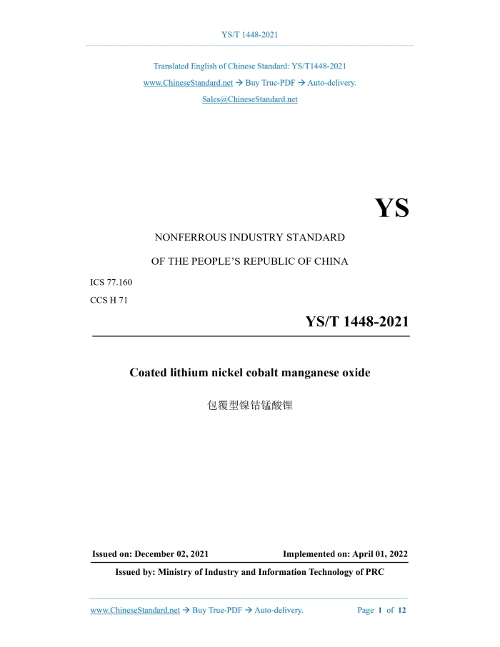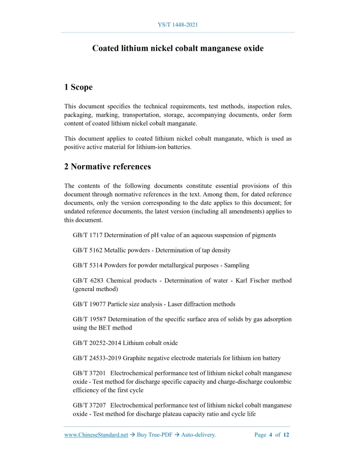 YS/T 1448-2021: Coated lithium nickel cobalt manganese oxide---This is an excerpt. Full copy of true-PDF in English version (including equations, symbols, images, flow-chart, tables, and figures etc.), auto-downloaded/delivered in 9 seconds, can be purchased online: https://www.ChineseStandard.net/PDF.aspx/YST1448-2021YS NONFERROUS INDUSTRY STANDARD OF THE PEOPLE’S REPUBLIC OF CHINA ICS 77.160 CCS H 71 Coated lithium nickel cobalt manganese oxide 包覆型镍钴锰酸锂 ISSUED ON: DECEMBER 02, 2021 IMPLEMENTED ON: APRIL 01, 2022 Issued by: Ministry of Industry and Information Technology of PRC Table of ContentsForeword ... 3 1 Scope ... 4 2 Normative references ... 4 3 Terms and definitions ... 5 4 Technical requirements ... 5 5 Test methods ... 7 6 Inspection rules ... 8 7 Packaging, marking, transportation, storage, accompanying documents ... 10 8 Contents of order form ... 12 Coated lithium nickel cobalt manganese oxide1 ScopeThis document specifies the technical requirements, test methods, inspection rules, packaging, marking, transportation, storage, accompanying documents, order form content of coated lithium nickel cobalt manganate. This document applies to coated lithium nickel cobalt manganate, which is used as positive active material for lithium-ion batteries.2 Normative referencesThe contents of the following documents constitute essential provisions of this document through normative references in the text. Among them, for dated reference documents, only the version corresponding to the date applies to this document; for undated reference documents, the latest version (including all amendments) applies to this document. GB/T 1717 Determination of pH value of an aqueous suspension of pigments GB/T 5162 Metallic powders - Determination of tap density GB/T 5314 Powders for powder metallurgical purposes - Sampling GB/T 6283 Chemical products - Determination of water - Karl Fischer method (general method) GB/T 19077 Particle size analysis - Laser diffraction methods GB/T 19587 Determination of the specific surface area of solids by gas adsorption using the BET method GB/T 20252-2014 Lithium cobalt oxide GB/T 24533-2019 Graphite negative electrode materials for lithium ion battery GB/T 37201 Electrochemical performance test of lithium nickel cobalt manganese oxide - Test method for discharge specific capacity and charge-discharge coulombic efficiency of the first cycle GB/T 37207 Electrochemical performance test of lithium nickel cobalt manganese oxide - Test method for discharge plateau capacity ratio and cycle life capacity under specified conditions, the number of cycles shall be no less than 1000. 4.14 Other requirements If the buyer has special requirements for coated lithium nickel cobalt manganate, it can be as negotiated between supplier and buyer.5 Test methods5.1 Chemical composition The determination of the chemical composition of the product shall be carried out, according to the method agreed upon by the supplier and buyer. 5.2 Moisture content The determination of product moisture content is carried out, in accordance with the provisions of GB/T 6283. 5.3 Magnetic foreign matter The magnetic foreign matter content of the product is measured, according to the provisions of Appendix K in GB/T 24533-2019. 5.4 Residual lithium content The residual lithium content of the product is measured according to the method agreed upon by the supplier and the buyer. 5.5 pH The pH value of the product is measured in accordance with the provisions of GB/T 1717. 5.6 Appearance quality Product appearance quality is visually inspected. 5.7 Crystal structure The crystal structure of the product is detected using an X-ray diffractometer. 5.8 Tap density The measurement of product tap density shall be carried out, in accordance with the provisions of GB/T 5162. 5.9 Particle size distribution The determination of product particle size distribution shall be carried out, in accordance with the provisions of GB/T 19077. 5.10 Specific surface area The specific surface area of the product is measured in accordance with the provisions of GB/T 19587. 5.11 First discharge specific capacity The first discharge specific capacity of the product is measured, in accordance with the provisions of GB/T 37201, in which the charge and discharge voltage range is 2.80 V ~ 4.30 V; other conditions remain unchanged. It can also be carried out, according to the method agreed upon by the supplier and buyer. 5.12 First charge and discharge efficiency The first charge and discharge efficiency of the product is measured, in accordance with the provisions of GB/T 37201, in which the charge and discharge voltage range is 2.80 V ~ 4.30 V; other conditions remain unchanged. It can also be carried out according to the method agreed upon by the supplier and buyer. 5.13 Cycle life The product cycle life is measured in accordance with the provisions of GB/T 37207, in which the charge and discharge voltage range is 2.80 V ~ 4.20 V; other conditions remain unchanged. It can also be carried out according to the method agreed upon by the supplier and buyer.6 Inspection rules6.1 Inspection and acceptance 6.1.1 The product shall be inspected by the supplier, to ensure that the product quality complies with the provisions of this document and the order form; meanwhile the accompanying documents shall be filled in. 6.1.2 The purchaser may inspect the received products, in accordance with the provisions of this document and the order form. If the inspection results are inconsistent with the provisions of this document and the order form, it shall be reported to the supplier, within 3 months from the date of receipt of the product, to be settled through negotiation between the supplier and buyer. If arbitration is required, arbitration sampling shall be conducted at the buyer's premises, jointly by both the supplier and the buyer. 6.2 Group-batching 6.3.4.2 The sampling method of products shall be carried out in accordance with th