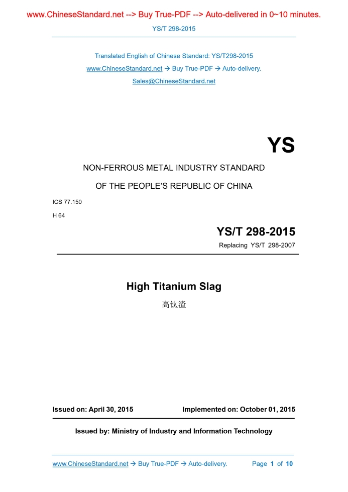 YS/T 298-2015: High Titanium Slag Delivery: 9 seconds. True-PDF full-copy in English & invoice will be downloaded + auto-delivered via email. See step-by-step procedure Status: Obsolete YS/T 298: Historical versions
