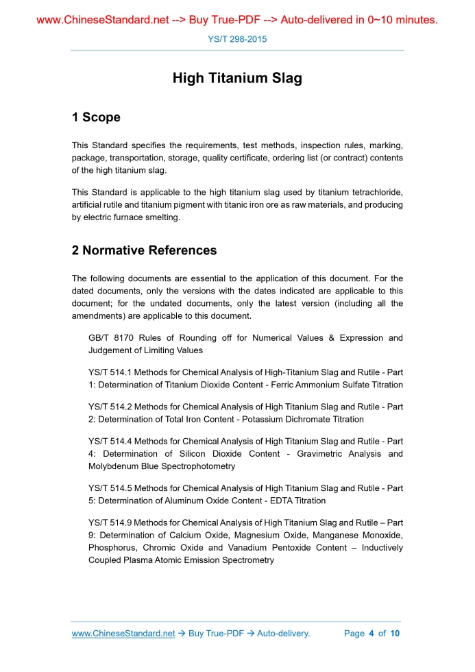 Similar standardsYS/T 298-2015: High Titanium Slag---This is an excerpt. Full copy of true-PDF in English version (including equations, symbols, images, flow-chart, tables, and figures etc.), auto-downloaded/delivered in 9 seconds, can be purchased online: https://www.ChineseStandard.net/PDF.aspx/YST298-2015YS NON-FERROUS METAL INDUSTRY STANDARD ICS 77.150 H 64 Replacing YS/T 298-2007 High Titanium Slag 高钛渣 Issued on: APRIL 30, 2015 Implemented on: OCTOBER 01, 2015 Issued by. Ministry of Industry and Information Technology Table of ContentsForeword... 3 1 Scope... 4 2 Normative References... 4 3 Terms and Definitions... 5 4 Requirements... 5 5 Test Methods... 6 6 Inspection Rules... 7 7 Marking, Package, Transportation, Storage and Quality Certificate... 8 8 Contents of Ordering List (or Contract)... 9 High Titanium Slag1 ScopeThis Standard specifies the requirements, test methods, inspection rules, marking, package, transportation, storage, quality certificate, ordering list (or contract) contents of the high titanium slag. This Standard is applicable to the high titanium slag used by titanium tetrachloride, artificial rutile and titanium pigment with titanic iron ore as raw materials, and producing by electric furnace smelting.2 Normative ReferencesThe following documents are essential to the application of this document. For the dated documents, only the versions with the dates indicated are applicable to this document; for the undated documents, only the latest version (including all the amendments) are applicable to this document. GB/T 8170 Rules of Rounding off for Numerical Values & Expression and Judgement of Limiting Values YS/T 514.1 Methods for Chemical Analysis of High-Titanium Slag and Rutile - Part 1.Determination of Titanium Dioxide Content - Ferric Ammonium Sulfate Titration YS/T 514.2 Methods for Chemical Analysis of High Titanium Slag and Rutile - Part 2.Determination of Total Iron Content - Potassium Dichromate Titration YS/T 514.4 Methods for Chemical Analysis of High Titanium Slag and Rutile - Part 4.Determination of Silicon Dioxide Content - Gravimetric Analysis and Molybdenum Blue Spectrophotometry YS/T 514.5 Methods for Chemical Analysis of High Titanium Slag and Rutile - Part 5.Determination of Aluminum Oxide Content - EDTA Titration YS/T 514.9 Methods for Chemical Analysis of High Titanium Slag and Rutile – Part 9.Determination of Calcium Oxide, Magnesium Oxide, Manganese Monoxide, Phosphorus, Chromic Oxide and Vanadium Pentoxide Content – Inductively Coupled Plasma Atomic Emission Spectrometry The inspection of the product particle size shall be carried out by sieving. Overlap the standard sieve; overlap from top to bottom in order from the large sieve holes to the small ones. Place the standard sieve onto the sieve shaker; take no less than 100g of sample to place it on the uppermost standard sieve; start the sieve shaker; shake and screen for 5min then stop. Remove the standard sieve, weight the sample on each layer of sieve, and under the 74µm sieve; record the data; calculate the percentage of it accounting for the sample weight. 5.4 Appearance quality The appearance quality inspection of the product shall be carried out by visual examination.6 Inspection Rules6.1 Inspection and acceptance 6.1.1 The product shall be inspected by the supplier; ensure that the product quality conforms to the provisions of this Standard and ordering list (or contract); and fill in the quality certificate. 6.1.2 The purchaser shall inspect the received products according to the provisions of this Standard; when the inspection result is inconsistent with the provisions of this Standard or ordering list (or contract), it shall be proposed to the supplier within 3d from the date of receipt of the product; it shall be solved through the consultation between the supplier and the purchaser. If the arbitration is required, it shall be carried out by entrusting the organization that is jointly approved by the two parties, and shall be jointly sampled by the purchaser. 6.2 Batching The product shall be delivered in batches; each batch consists of the products with the same designation, the same particle size. The product mass per batch shall be no greater than 110t. 6.3 Sampling The number of bags is randomly selected from each batch of products. for the large package (1000kg/bag), select 1 bag from 5 bags as the sample, each sample volume shall be no less than 100g; then combine into large sample. For the small package (25kg or 30kg/bag), select 1 bag from 20 bags as the sample, each sample volume shall be no less than 30g; then combine into large sample. The sampling shall adopt intubation method; taking into consideration of the upper, middle, and lower layers; observe the appearance quality one by one. 7.2 Package, transportation and storage 7.2.1 The product shall be packaged in double-layered bags; the inner layer shall use plastic bag, while the external layer shall use sacks or woven bags. 7.2.2 The product is divided into large and small packages. The new weight per bag of large package is 1000kg; while the net weight per bag of small package is 25kg or 30kg. The bag mouth shall be tightly sealed; it shall not be exposed to the rain or moisture during the transportation and storage processes. When the purchaser has special requirements for the package, it shall be negotiated between the supplier and the purchaser; and indicated in the ordering list (or contract). 7.3 Quality certificate Each batch of products shall be attached with quality certificate, which shall be indicated as follows. a) Supplier name, address, telephone and fax; b) Product name; c) Batch number, designation, net weight, and quantity; d) This Standard number; e) Results of each analysis inspection; and mark from the Quality Supervision Department of the supplier; f) Exit-factory date.8 Contents of Ordering List (or Contract)The ordering list that orders the products listed in this Standard shall 