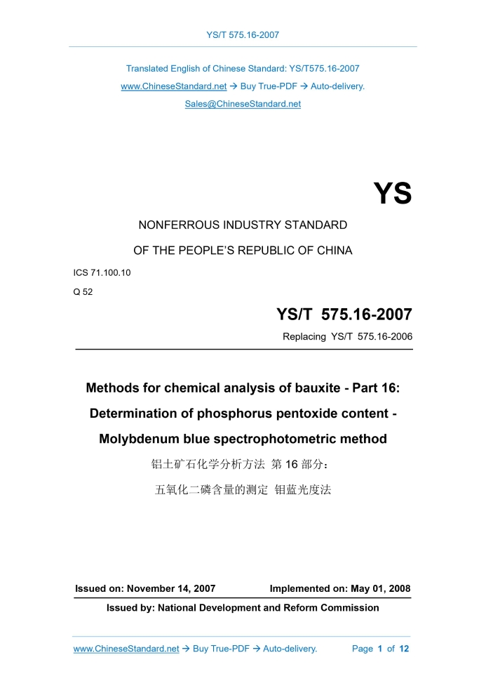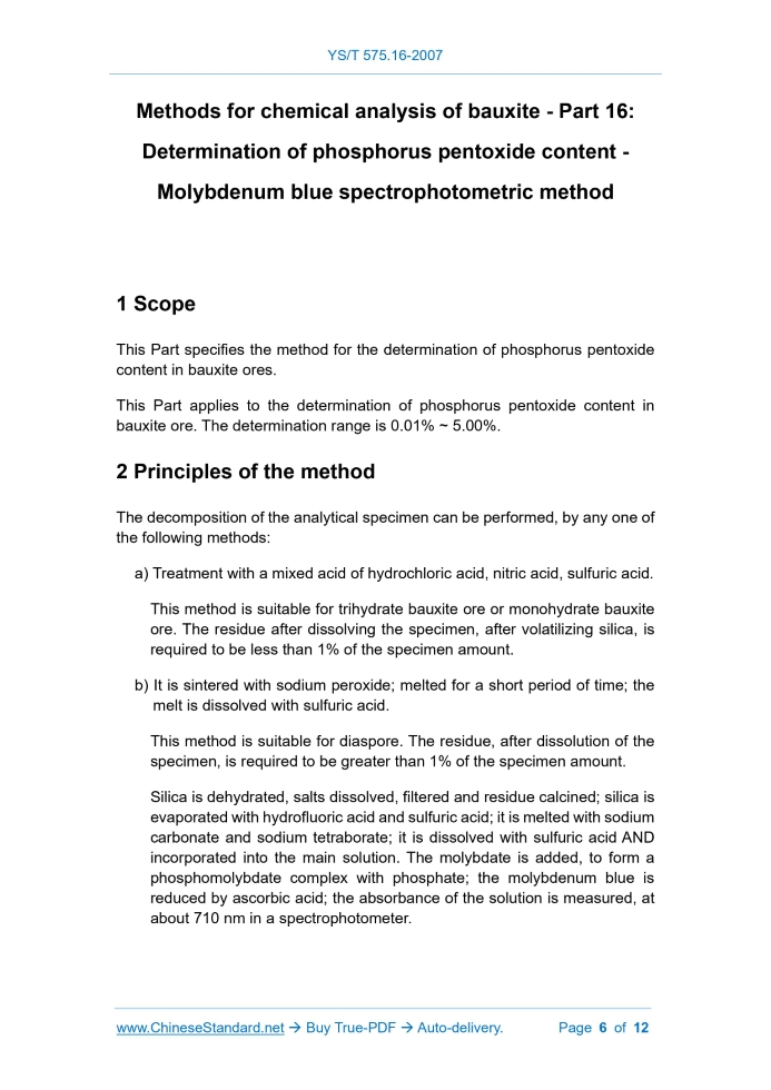 YS/T 575.16-2007: Methods for chemical analysis of bauxite. Part 16: Determination of phosphorus pentoxide content. Molybdenum blue spectrophotometric method Delivery: 9 seconds. True-PDF full-copy in English & invoice will be downloaded + auto-delivered via email. See step-by-step procedure YS/T 575.16: Historical versions