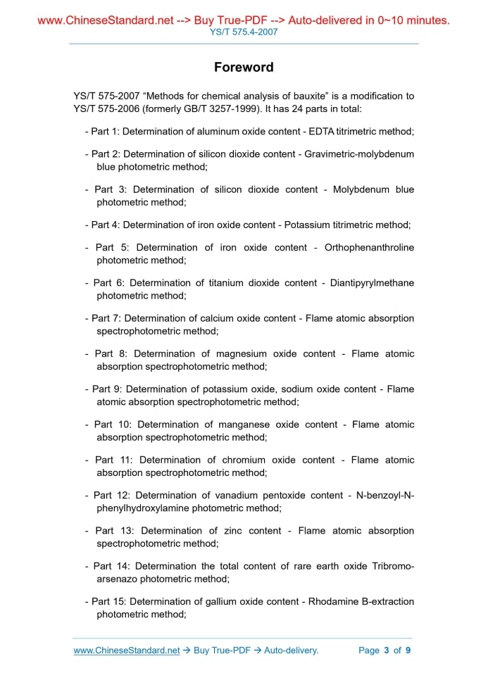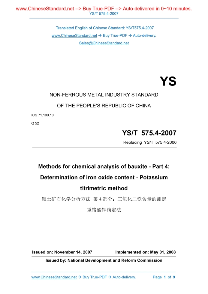 Similar standardsYS/T 575.4-2007: Methods for chemical analysis of bauxite. Part 4: Determination of iron oxide content. Dichromate titrimetric method---This is an excerpt. Full copy of true-PDF in English version (including equations, symbols, images, flow-chart, tables, and figures etc.), auto-downloaded/delivered in 9 seconds, can be purchased online: https://www.ChineseStandard.net/PDF.aspx/YST575.4-2007 NON-FERROUS METAL INDUSTRY STANDARD OF THE PEOPLE’S REPUBLIC OF CHINA ICS 71.100.10 Q 52 Replacing YS/T 575.4-2006 Methods for chemical analysis of bauxite - Part 4: Determination of iron oxide content - Potassium titrimetric method ISSUED ON: NOVEMBER 14, 2007 IMPLEMENTED ON: MAY 01, 2008 Issued by: National Development and Reform Commission Table of ContentsForeword ... 3 1 Scope ... 6 2 Method principle ... 6 3 Reagents ... 6 4 Specimen ... 7 5 Analysis steps ... 7 6 Calculation of analysis result ... 8 7 Precision ... 9 8 Quality assurance and control ... 9ForewordYS/T 575-2007 “Methods for chemical analysis of bauxite” is a modification to YS/T 575-2006 (formerly GB/T 3257-1999). It has 24 parts in total: - Part 1: Determination of aluminum oxide content - EDTA titrimetric method; - Part 2: Determination of silicon dioxide content - Gravimetric-molybdenum blue photometric method; - Part 3: Determination of silicon dioxide content - Molybdenum blue photometric method; - Part 4: Determination of iron oxide content - Potassium titrimetric method; - Part 5: Determination of iron oxide content - Orthophenanthroline photometric method; - Part 6: Determination of titanium dioxide content - Diantipyrylmethane photometric method; - Part 7: Determination of calcium oxide content - Flame atomic absorption spectrophotometric method; - Part 8: Determination of magnesium oxide content - Flame atomic absorption spectrophotometric method; - Part 9: Determination of potassium oxide, sodium oxide content - Flame atomic absorption spectrophotometric method; - Part 10: Determination of manganese oxide content - Flame atomic absorption spectrophotometric method; - Part 11: Determination of chromium oxide content - Flame atomic absorption spectrophotometric method; - Part 12: Determination of vanadium pentoxide content - N-benzoyl-N- phenylhydroxylamine photometric method; - Part 13: Determination of zinc content - Flame atomic absorption spectrophotometric method; - Part 14: Determination the total content of rare earth oxide Tribromo- arsenazo photometric method; - Part 15: Determination of gallium oxide content - Rhodamine B-extraction photometric method; Methods for chemical analysis of bauxite - Part 4: Determination of iron oxide content - Potassium titrimetric method1 ScopeThis Part specifies the determination method of iron oxide content in bauxite. This Part is applicable to the determination of iron oxide content in bauxite. The determination range is ≥5.00%.2 Method principleIn the hydrochloric acid medium, use tin dichloride to reduce most trivalent iron. Use sodium tungstate as indicator. Add titanium trichloride in drops to reduce the remaining trivalent iron as divalent iron. Use excessive titanium trichloride to further reduce tungstate to generate “tungsten blue”. Then add potassium dichromate in drops till blue disappears. Use sodium dibenzamide as indicator. Use potassium dichromate standard solution to titrate ferrous iron. Vanadium interference. In the titration solution, vanadium pentoxide below 0.6mg is allowed.3 Reagents3.1 Potassium hydroxide. 3.2 Sodium peroxide. 3.3 Hydrochloric acid (ρ1.19g/mL). 3.4 Hydrochloric acid (1+1). 3.5 Hydrochloric acid (1+9). 3.6 Sulfuric acid (ρ1.84g/mL). 3.7 Phosphoric acid (ρ1.70g/mL). 3.8 Sulfuric acid-phosphoric acid mixed solution: Under stirring, slowly add 200mL of sulfuric acid (3.6) into 500mL of water. Then add 300mL of phosphoric make the melt adhere to the inner wall of the crucible evenly. Cool. 5.3.2 Place the silver crucible in a 250mL beaker. Add 30mL of hot water. After the molten material falls off, use hydrochloric acid (3.5) and hot water to wash the crucible. Add 25mL of hydrochloric acid (3.3). Cover the watch glass. Heat to completely boil. Add tin dichloride solution (3.11) in drops till light yellow. Add water to about 100mL. Add 1mL of sodium tungstate solution (3.12). Add titanium trichloride solution (3.10) in drops till blue just appears. Then immediately use potassium dichromate standard solution (3.15) to titrate till it is colorless (without reading). NOTE: The blank test shall be heated and boiled to remove hydrogen peroxide before the acidification of hydrochloric acid. 5.3.3 Immediately add 10mL of sulfuric acid-phosphoric acid mixed solution (3.8) and 4 drops of diphenylamine sulfonate indicator solution (3.13). Use potassium dichromate standard solution (3.15) to add in drops till purple blue is stable, which shall be the end. 5.3.4 Reagent blank shall be operated according to the analysis steps in 5.3.1~5.3.2. But in (5.3.3), before sulfuric acid-phosphoric acid mixed solution is added, add 5.00mL of ferrous ammonium sulfate solution (3.14) first. The volume of potassium dichromate standard (3.15) used is A. Then add 5.00mL of ferrous ammonium sulfate solution (3.14) into the solution. Still use potassium dichromate standard solution (3.15) to titrate to the end. Record the volume as B. Repeat adding ferrous ammonium sulfate solution (3.14). Use potassium dichromate standard solution (3.15) to titrate. When B value is a certain constant value, A-B shall be the volume (V0) of potassium dichromate standard solution (3.15) used by the blank.6 Calculation of analysis resultCalculate the mass fraction (%) of ferric oxide according to the following formula: Where, V - Volume of potassium dichromate standard titration solution consumed during titration of test portion solution, in milliliters (mL); V0 - Volume of potassium dichromate standard titration solution consumed during titration of blank solu