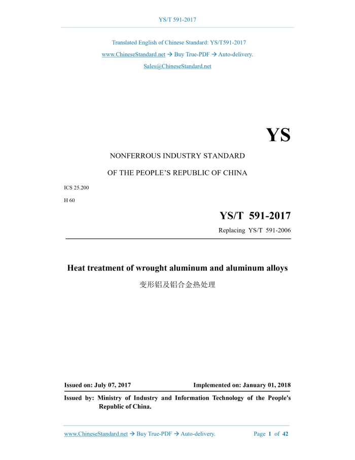 YS/T 591-2017: Heat treatment of wrought aluminium and aluminium alloys Delivery: 9 seconds. True-PDF full-copy in English & invoice will be downloaded + auto-delivered via email. See step-by-step procedure Status: Valid YS/T 591: Historical versions