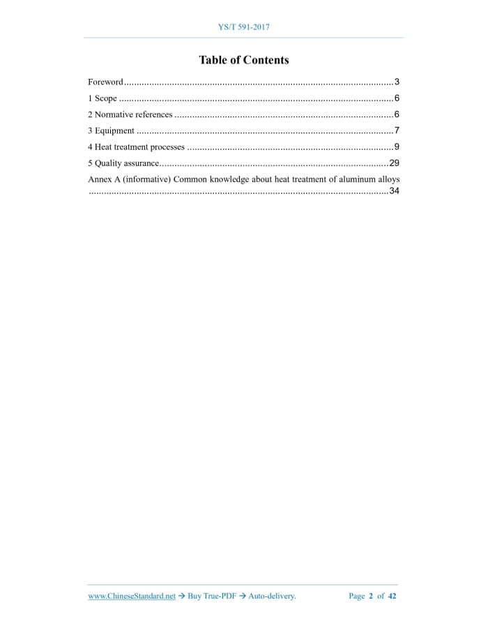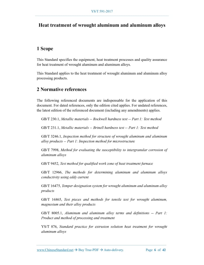 Similar standardsYS/T 591-2017: Heat treatment of wrought aluminium and aluminium alloys---This is an excerpt. Full copy of true-PDF in English version (including equations, symbols, images, flow-chart, tables, and figures etc.), auto-downloaded/delivered in 9 seconds, can be purchased online: https://www.ChineseStandard.net/PDF.aspx/YST591-2017YS NONFERROUS INDUSTRY STANDARD ICS 25.200 H 60 Replacing YS/T 591-2006 Heat treatment of wrought aluminum and aluminum alloys Issued on. JULY 07, 2017 Implemented on. JANUARY 01, 2018 Issued by. Ministry of Industry and Information Technology of the People's Republic of China. Table of ContentsForeword... 3 1 Scope... 6 2 Normative references... 6 3 Equipment... 7 4 Heat treatment processes... 9 5 Quality assurance... 29 Annex A (informative) Common knowledge about heat treatment of aluminum alloys ... 341 ScopeThis Standard specifies the equipment, heat treatment processes and quality assurance for heat treatment of wrought aluminum and aluminum alloys. This Standard applies to the heat treatment of wrought aluminum and aluminum alloy processing products.2 Normative referencesThe following referenced documents are indispensable for the application of this document. For dated references, only the edition cited applies. For undated references, the latest edition of the referenced document (including any amendments) applies. GB/T 230.1, Metallic materials -- Rockwell hardness test -- Part 1.Test method GB/T 231.1, Metallic materials -- Brinell hardness test -- Part 1.Test method GB/T 3246.1, Inspection method for structure of wrought aluminum and aluminum alloy products -- Part 1.Inspection method for microstructure GB/T 7998, Method for evaluating the susceptibility to intergranular corrosion of aluminum alloys GB/T 9452, Test method for qualified work zone of heat treatment furnace GB/T 12966, The methods for determining aluminum and aluminum alloys conductivity using eddy current3 Equipment3.1 Basic requirements 3.1.1 All heat treatment equipment shall be equipped with temperature and time control devices and recorders that meet process control requirements. The recorder shall be able to accurately reflect the temperature and time control conditions, and can be stored for reference. 3.2 Commonly used heat treatment furnaces 3.2.1 Classification Commonly used heat treatment furnaces can be divided into two types. periodic heat treatment furnaces and continuous heat treatment furnaces. The periodic heat treatment furnace is highly versatile and can meet a variety of heat treatment process requirements. It is commonly used for heating and annealing of general products. But the production efficiency and thermal efficiency are low. The continuous heat treatment furnace has the characteristics of mechanization and high automation. It can meet the requirements of various heat treatment processes for large quantities of a single product. It has high productivity. 3.2.2 Periodic heat treatment furnace 3.2.2.1 Air furnace Air furnaces use air as the medium. Generally, a forced air circulation system is installed. It is the furnace type with the simplest structure. 3.2.4 Uniformity and testing requirements 3.2.4.1 The correspondence between the types of heat treatment furnaces and the temperature uniformity of the effective heating zone is shown in Table 1.The temperature uniformity is tested according to the method specified in GB/T 9452. 3.2.4.2 Temperature uniformity shall be rechecked after all operations that alter the temperature uniformity or heat treatment performance of the heat treatment furnace, or after major overhauls. 3.3 Quenching equipment 3.3.1 Immersion quenching equipment 3.3.1.1 Tank size The quenching tank shall be of sufficient size to ensure that the product can be completely immersed in the quenching medium. 3.3.1.2 Cycle The quenching tank shall have an internal or external circulation system to ensure the flow of quenching medium. 3.3.2 Spray quenching equipment When using a spray system for quenching, the coolant released from the nozzle shall have sufficient volume (flow), pressure and temperature to ensure that all products can achieve a uniform quenching effect. The equipment shall be equipped with a recorder to monitor spray quenching parameters.4 Heat treatment processes4.1 Basic requirements 4.1.1 General requirements 4.1.1.1 The heat treatment process shall match the heat treatment equipment. Product monitoring inspections shall be carried out regularly to monitor the operation of heat treatment equipment and the suitability of the process. 4.1.3 Product placement 4.1.3.1 Products shall be placed on racks and kept at a distance to ensure that the quenching medium fully enters all load areas. 4.1.4 Furnace capacity Furnace installation shall be appropriately selected based on product and process requirements to ensure temperature uniformity. For salt bath quenching products with a thickness less than or equal to 2.5 mm, the furnace loading shall ensure that the time to reach the lowest temperature does not exceed 10 min. For salt bath quenching products with a thickness greater than 2.5 mm, the furnace loading shall ensure that the time to reach the minimum temperature does not exceed 20 min. 4.1.5 Fixtures Fixtures shall be positioned to avoid steam interception and ensure free circulation of the quenching fluid and quenching effect. 4.2 Solution heat treatment process 4.2.1 Online solid solution heat treatment process The extrusion online solution heat treatment process shall be carried out in accordance with the provisions of YS/T 876. 4.2.2 Offline solution heat treatment process 4.3 Quenching 4.3.1 Quenching medium The quenching medium is water, air, water polymer solution, liquefied gas or oil. There is the appropriate equipment for these medium. The spray quenching medium can use water or a mixture of water and ethylene glycol. 4.3.2 Quenching method 4.3.2.1 Immersion quenching5 Quality assurance5.1 Process control A
