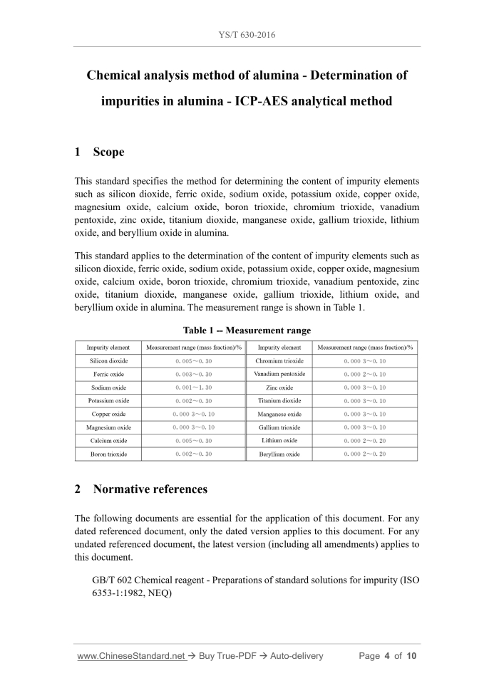 YS/T 630-2016: Chemical analysis method of alumina - Determination of impurities in alumina - ICP-AES analytical method Delivery: 9 seconds. True-PDF full-copy in English & invoice will be downloaded + auto-delivered via email. See step-by-step procedure Status: Valid YS/T 630: Historical versions