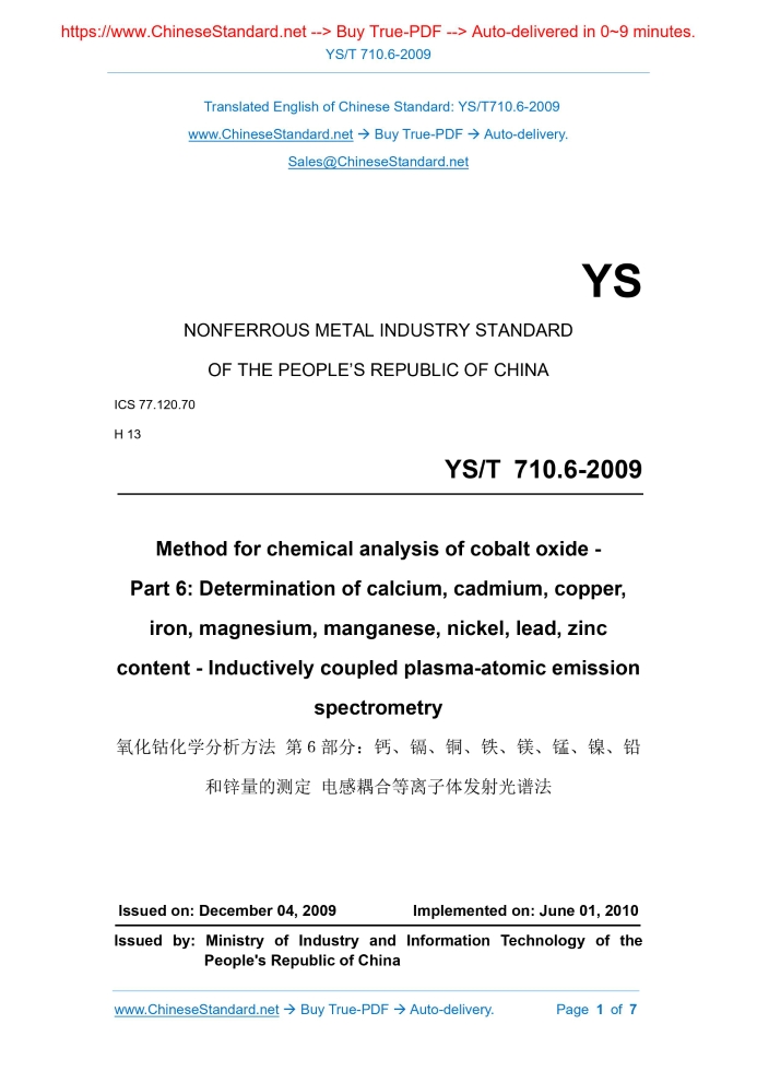 YS/T 710.6-2009: Method for chemical analysis of cobalt oxide. Part 6: Determination of calcium, cadmium, copper, iron, magnesium, manganese, nickel, lead, zinc content. Inductively coupled plasma-atomic emission spectromertry Delivery: 9 seconds. True-PDF full-copy in English & invoice will be downloaded + auto-delivered via email. See step-by-step procedure Status: Valid