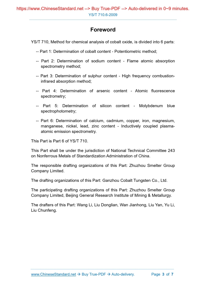 Similar standardsYS/T 710.6-2009: Method for chemical analysis of cobalt oxide. Part 6: Determination of calcium, cadmium, copper, iron, magnesium, manganese, nickel, lead, zinc content. Inductively coupled plasma-atomic emission spectromertry---This is an excerpt. Full copy of true-PDF in English version (including equations, symbols, images, flow-chart, tables, and figures etc.), auto-downloaded/delivered in 9 seconds, can be purchased online: https://www.ChineseStandard.net/PDF.aspx/YST710.6-2009 YS NONFERROUS METAL INDUSTRY STANDARD OF THE PEOPLE’S REPUBLIC OF CHINA ICS 77.120.70 H 13 Method for chemical analysis of cobalt oxide - Part 6: Determination of calcium, cadmium, copper, iron, magnesium, manganese, nickel, lead, zinc content - Inductively coupled plasma-atomic emission spectrometry ISSUED ON: DECEMBER 04, 2009 IMPLEMENTED ON: JUNE 01, 2010 Issued by: Ministry of Industry and Information Technology of the People's Republic of China Table of ContentsForeword ... 3 1 Scope ... 4 2 Method summary ... 4 3 Reagents ... 4 4 Instruments ... 5 5 Analysis steps ... 5 6 Calculation of analysis result ... 6 7 Precision ... 6 8 Quality assurance and control ... 7ForewordYS/T 710, Method for chemical analysis of cobalt oxide, is divided into 6 parts: -- Part 1: Determination of cobalt content - Potentiometric method; -- Part 2: Determination of sodium content - Flame atomic absorption spectrometry method; -- Part 3: Determination of sulphur content - High frequency combustion- infrared absorption method; -- Part 4: Determination of arsenic content - Atomic fluorescence spectrometry; -- Part 5: Determination of silicon content - Molybdenum blue spectrophotometry; -- Part 6: Determination of calcium, cadmium, copper, iron, magnesium, manganese, nickel, lead, zinc content - Inductively coupled plasma- atomic emission spectrometry. This Part is Part 6 of YS/T 710. This Part shall be under the jurisdiction of National Technical Committee 243 on Nonferrous Metals of Standardization Administration of China. The responsible drafting organizations of this Part: Zhuzhou Smelter Group Company Limited. The drafting organizations of this Part: Ganzhou Cobalt Tungsten Co., Ltd. The participating drafting organizations of this Part: Zhuzhou Smelter Group Company Limited, Beijing General Research Institute of Mining & Metallurgy. The drafters of this Part: Wang Li, Liu Donglian, Wan Jianhong, Liu Yan, Yu Li, Liu Chunfeng. Method for chemical analysis of cobalt oxide - Part 6: Determination of calcium, cadmium, copper, iron, magnesium, manganese, nickel, lead, zinc content - Inductively coupled plasma-atomic emission spectrometry1 ScopeThis Part of YS/T 710 specifies the determination method of calcium, cadmium, copper, iron, magnesium, manganese, nickel, lead, zinc content in cobalt oxide. This Part applies to the determination of calcium, cadmium, copper, iron, magnesium, manganese, nickel, lead, zinc content in cobalt oxide. See Table 1 for the determination range Table 1 -- Determination range of each element2 Method summaryDissolve the sample in aqua regia; in a nitric acid medium, according to the optimized working conditions of the instrument and the optimized analysis spectrum, use a standard solution, which is similar to the sample composition, that matches with the cobalt matrix; use the ICP-AES instrument to determine the Ca, Cd, Cu, Fe, Mg, Mn, Ni, Pb, Zn content in the cobalt oxide.3 Reagents3.1 Hydrochloric acid (ρ1.19 g/mL), GR. 3.2 Nitric acid, (ρ1.42 g/mL), GR. 3.3 Aqua regia: 3 parts of hydrochloric acid (3.1) + 1 part of nitric acid (3.2). conditions, add 3 mL ~ 5 mL of perchloric acid (3.4) appropriately to smoke until it is nearly dry. 5.3.2 Blow in a small amount of water; cover the watch glass and boil; cool to room temperature; add 5 mL of nitric acid (3.2); transfer to a 100 mL volumetric flask; use water to dilute to the mark; shake well; use as a test solution for later use. 5.3.3 Measure each point mixed standard solution and test solution under the optimized working conditions of the instrument; the instrument automatically draws a working curve. 5.3.4 Test the to-be-tested solution and the blank.6 Calculation of analysis result6.1 The instrument, according to the standardization or calibrated standardization work curve and the set element, automatically processes the data, calculates and outputs the content of each measured element. 6.2 Keep two significant digits for the analysis result.7 Precision7.1 Repeatability For the measured values of the two independent test results that are obtained under repetitive conditions, within the average range that is given below, the absolute difference between the two test results does not exceed the repeatability limit (r); the case of exceeding the repeatability limit (r) is not more than 5%; the repeatability limit (r) is obtained by linear interpolation according to the data in Table 4. Table 4 -- Repeatability limit 7.2 Reproducibility For the measured values of the two independent test results that are obtained under reproductive conditions, within the average range that is given below, the absolute difference between the two test results does not exceed the reproducibility limit (R); the case of exceeding the reproducibility limit (R) is not Note: The repeatability limit (r) is 2.8Sr; Sr is the repeatability standard deviation. ......Source: Above contents are excerpted from the full-copy PDF -- translated/reviewed by: www.ChineseStandard.net / Wayne Zheng et al. Tips & Frequently Asked Questions:Question 1: How long will the true-PDF of English version of YS/T 710.6-2009 be delivered?Answer: The full copy PDF of English version of YS/T 710.6-2009 can be downloaded in 9 seconds, and it will also be emailed to you in 9 seconds (double mechanisms to ensure the delivery reliably), with PDF-invoice.Question 2: Can I share the purchased PDF of YS/T 710.6-2009_English with my colleagues?Answer: Yes. The purchased PDF of YS/T 710.6-2