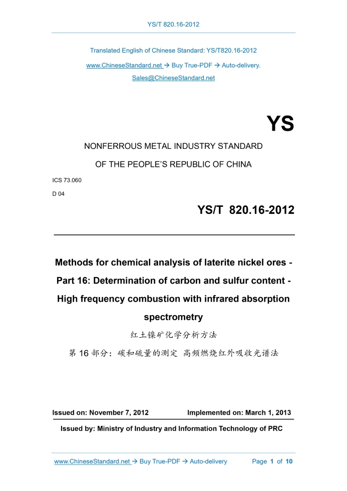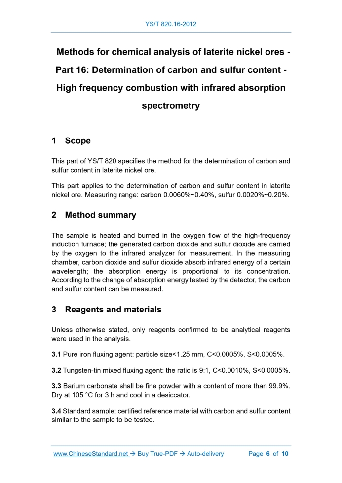 YS/T 820.16-2012: Methods for chemical analysis of laterite nickel ores - Part 16: Determination of carbon and sulfur content - High frequency combustion with infrared absorption spectrometry Delivery: 9 seconds. True-PDF full-copy in English & invoice will be downloaded + auto-delivered via email. See step-by-step procedure Status: Valid