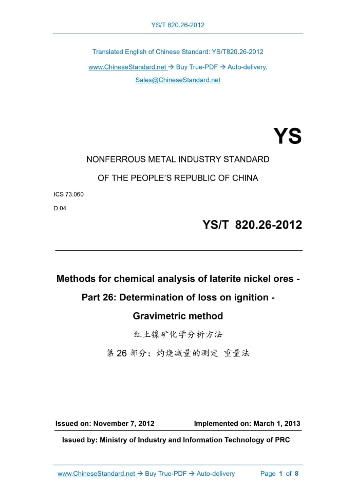 YS/T 820.26-2012: Methods for chemical analysis of laterite nickel ores. Part 26: Determination of loss on ignition. Gravimetric method Delivery: 9 seconds. True-PDF full-copy in English & invoice will be downloaded + auto-delivered via email. See step-by-step procedure Status: Valid
