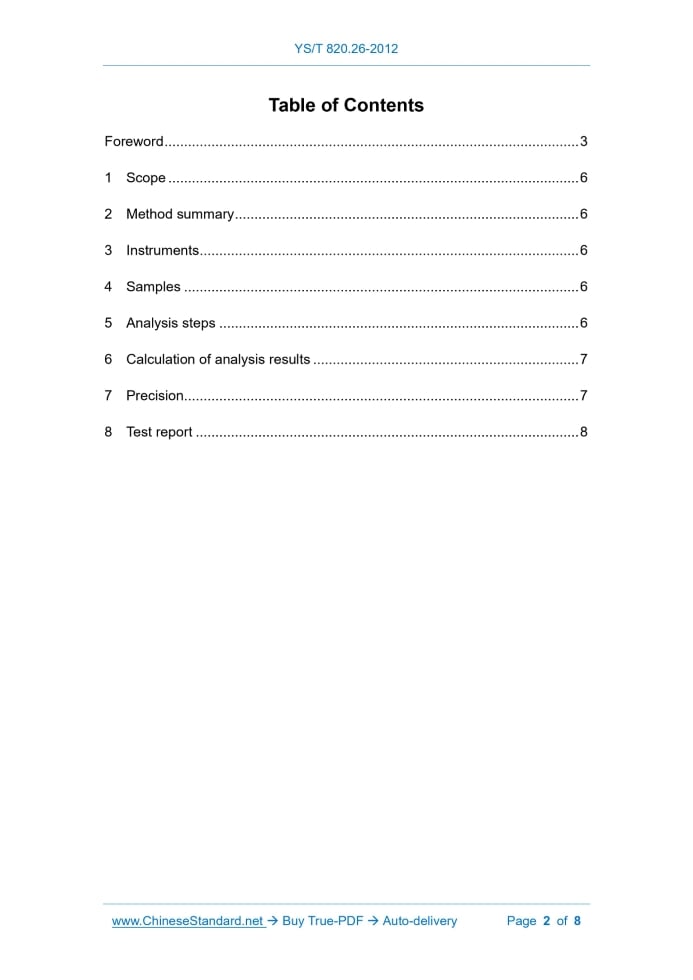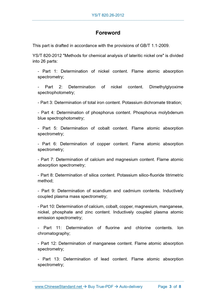 Similar standardsYS/T 820.26-2012: Methods for chemical analysis of laterite nickel ores. Part 26: Determination of loss on ignition. Gravimetric method---This is an excerpt. Full copy of true-PDF in English version (including equations, symbols, images, flow-chart, tables, and figures etc.), auto-downloaded/delivered in 9 seconds, can be purchased online: https://www.ChineseStandard.net/PDF.aspx/YST820.26-2012 YS NONFERROUS METAL INDUSTRY STANDARD ICS 73.060 D 04 Methods for chemical analysis of laterite nickel ores - Part 26.Determination of loss on ignition - Gravimetric method Issued on. NOVEMBER 7, 2012 Implemented on. MARCH 1, 2013 Issued by. Ministry of Industry and Information Technology of PRC Table of ContentsForeword... 3 1 Scope... 6 2 Method summary... 6 3 Instruments... 6 4 Samples... 6 5 Analysis steps... 6 6 Calculation of analysis results... 7 7 Precision... 7 8 Test report... 8ForewordThis part is drafted in accordance with the provisions of GB/T 1.1-2009. YS/T 820-2012 "Methods for chemical analysis of lateritic nickel ore" is divided into 26 parts. - Part 1.Determination of nickel content. Flame atomic absorption spectrometry; - Part 2.Determination of nickel content. Dimethylglyoxime spectrophotometry; - Part 3.Determination of total iron content. Potassium dichromate titration; - Part 4.Determination of phosphorus content. Phosphorus molybdenum blue spectrophotometry; - Part 5.Determination of cobalt content. Flame atomic absorption spectrometry; - Part 6.Determination of copper content. Flame atomic absorption spectrometry; - Part 7.Determination of calcium and magnesium content. Flame atomic absorption spectrometry; - Part 8.Determination of silica content. Potassium silico-fluoride titrimetric method; - Part 9.Determination of scandium and cadmium contents. Inductively coupled plasma mass spectrometry; - Part 10.Determination of calcium, cobalt, copper, magnesium, manganese, nickel, phosphate and zinc content. Inductively coupled plasma atomic emission spectrometry; - Part 11.Determination of fluorine and chlorine contents. Ion chromatography; - Part 12.Determination of manganese content. Flame atomic absorption spectrometry; - Part 13.Determination of lead content. Flame atomic absorption spectrometry; - Part 14.Determination of zinc content. Flame atomic absorption spectrometry; - Part 15.Determination of cadmium content. Flame atomic absorption spectrometry; - Part 16.Determination of carbon and sulfur content. High frequency combustion with infrared absorption spectrometry - Part 17.Determination of arsenic, antimony and bismuth contents. Hydride generation-atomic fluorescence spectrometry; - Part 18.Determination of mercury content. Cold atomic absorption spectrometry; - Part 19.Determination of aluminum, chromium, iron, magnesium, manganese, nickel and silicon contents. Energy-dispersive X-ray fluorescence spectrometry; - Part 20.Determination of aluminum content. EDTA titration; - Part 21.Determination of chromium content. The ammonium-ferrous sulfate titration method; - Part 22.Determination of magnesium content. EDTA titration; - Part 23.Determination of cobalt, iron, nickel, phosphorus, aluminium oxide, calcium oxide, chromium oxide, magnesium oxide, manganese oxide, silicon dioxide and titanium dioxide content. Wavelength dispersive X-ray fluorescence spectrometry; - Part 24.Determination of hygroscopic moisture content. Gravimetric method; - Part 25.Determination of combined water content. Gravimetric method; - Part 26.Determination of loss on ignition. Gravimetric method. This part is Part 26 of YS/T 820-2012. This standard shall be under the jurisdiction of the National Nonferrous Metals Standardization Technical Committee (SAC/TC243). This standard was drafted by Beijing General Research Institute of Mining and Metallurgy, Bayuquan Entry-Exit Inspection and Quarantine Bureau of the People's Republic of China, and Jinchuan Group Co., Ltd. The main drafting organizations of this part. Changshu Entry-Exit Inspection and Quarantine Bureau of the People's Republic of China. The participant drafting organizations of this part. Guangzhou Nonferrous Metals Research Institute, Tianjin Entry-Exit Inspection and Quarantine Bureau of the People's Republic of China, Nantong Entry-Exit Inspection and Quarantine Bureau of the People's Republic of China. The main drafters of this document. Liu Feng, Xu Yuyu, Wang Hui, Wang Guoxin, Wu Cheng, Dai Fengying, Liu Tianping, Ma Deqi, Hou Jin. Methods for chemical analysis of laterite nickel ores - Part 26.Determination of loss on ignition - Gravimetric method1 ScopeThis part of YS/T 820 specifies the gravimetric method for the determination of loss on ignition (LOI) in laterite nickel ore. This part applies to the determination of loss on ignition in laterite nickel ore. The measurement range is 6.00%~14.00%.2 Method summaryIgnite the pre-dried sample to a constant weight at 1000 °C; calculate the loss on ignition (LOI) according to the reduced mass of the sample.3 Instruments3.1 High-temperature furnace. the temperature can be controlled at 1000 °C±50 °C.4 SamplesThe particle size of the samples shall be less than 160 μm; bake them in an oven at 105 °C~110 °C for 2 h, and cool them to room temperature in a desiccator.5 Analysis steps5.1 Sample Weigh 1.00 g sample; the weight shall be accurate to 0.0002 g. 5.2 Number of measurements Independently perform two measurements; take the average value. 5.3 Determination steps Place the sample in a porcelain crucible (3.2), and put the crucible in a high- temperature furnace (3.1);6 Calculation of analysis resultsThe loss on ignition is calculated according to formula (1), the result is expressed in terms of the mass fraction ωLOI of the loss on ignition, its value is expressed in %.7 Precision7.1 Repeatability The two independent tests' determination results obtained under repeatability conditions shall be within the range of average values given below. 7.2 Reproducibil